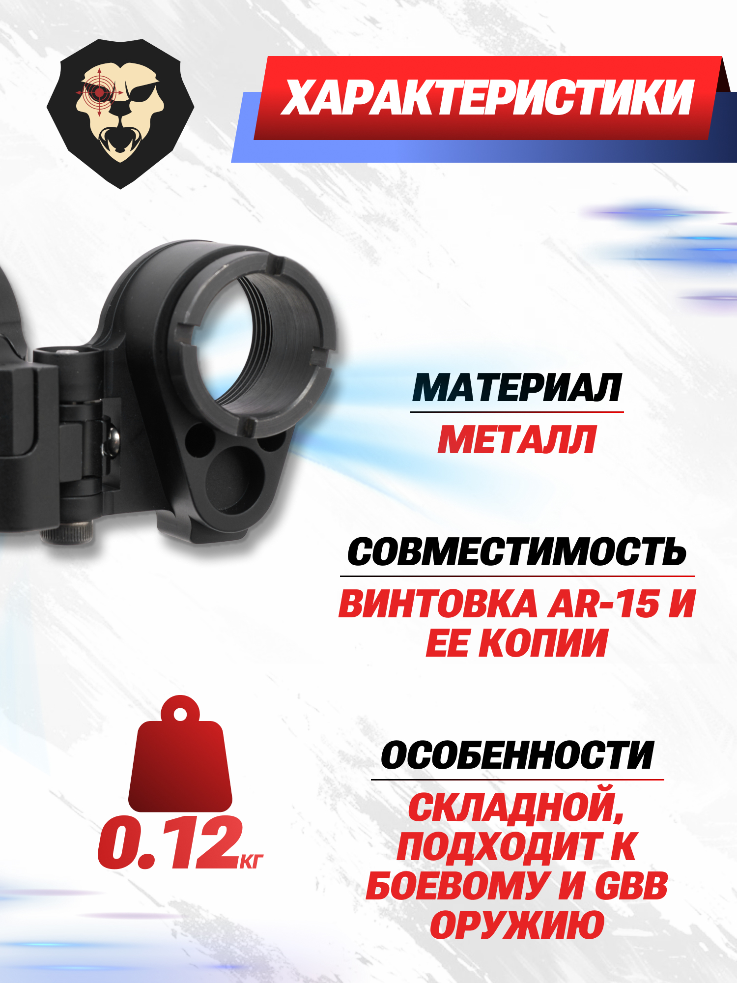 | Особенности | Складной, подходит к боевому и GBB оружию |