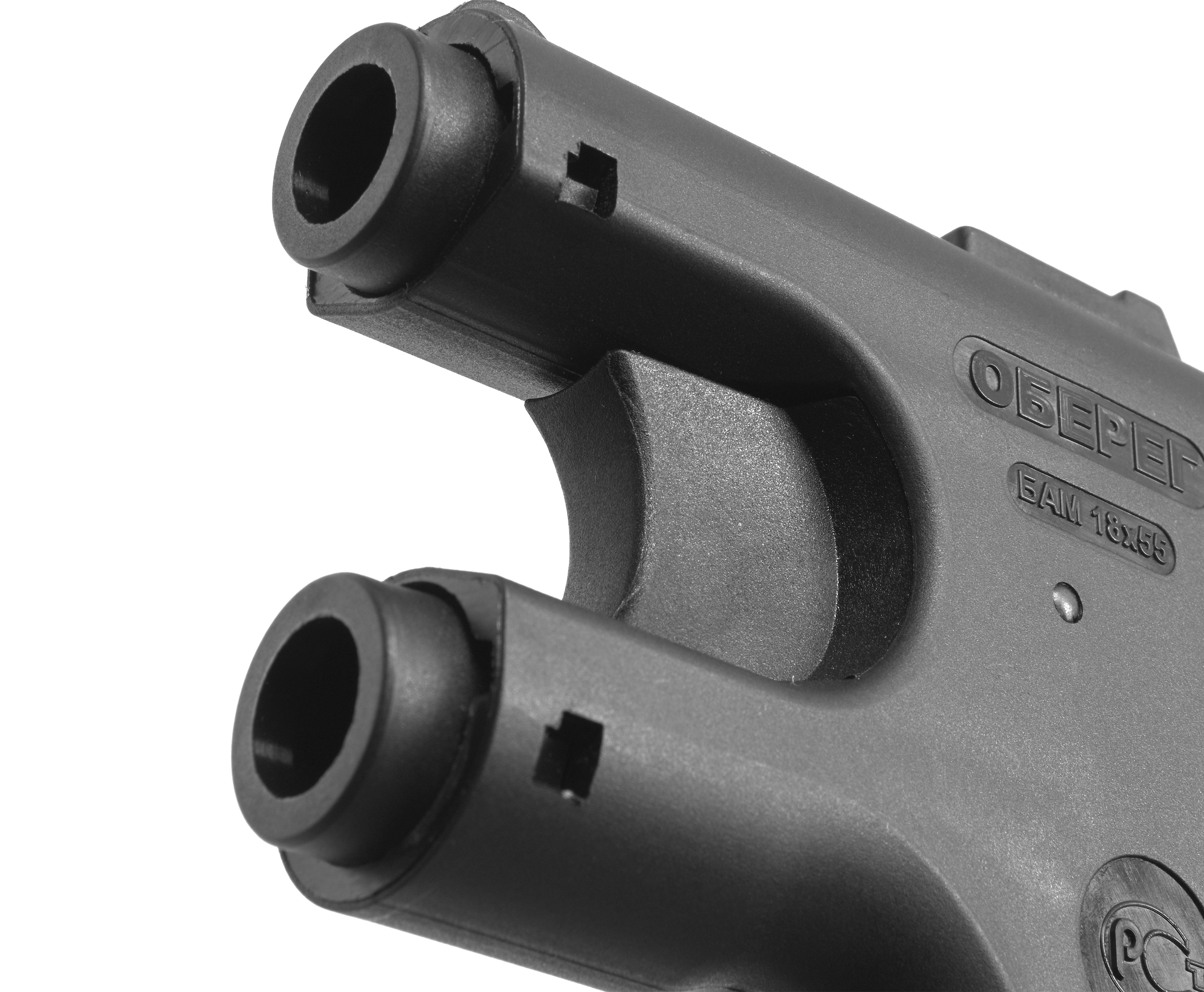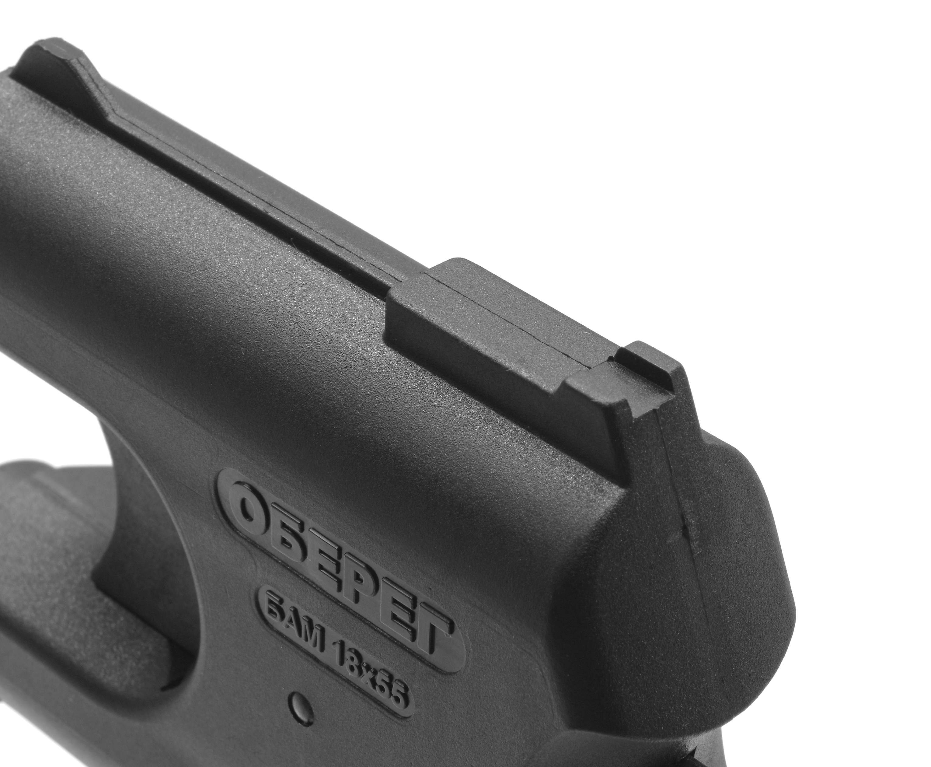 При небольших размерах Оберег остается эргономичным в удержании, что обеспечено фигурным вырезом. Выемка под спусковой крючок выполнена в форме, упрощающей интуитивный поиск оружия в карманах сумок и одежды.