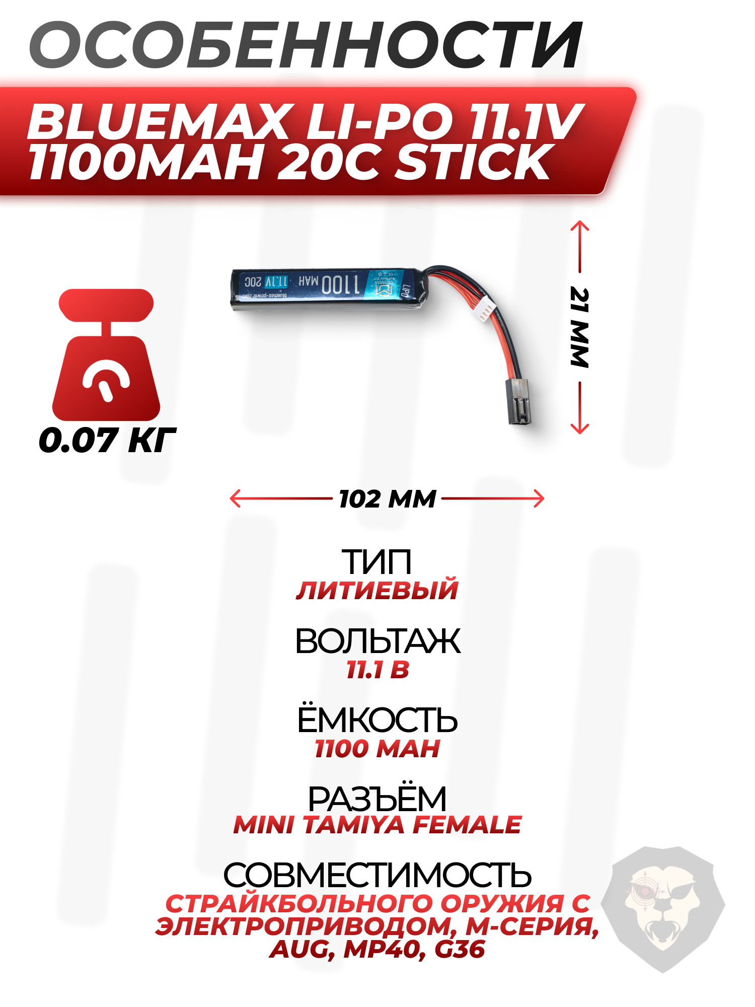 Габариты источника энергии составляют 14.5x21x102 мм. Важно убедиться, что размеры батареи соответствуют ограничениям и требованиям оружия. Также BlueMax наделен высокой энергетической плотностью и благодаря этому дает высокий уровень энергии для питания системы пневматики.