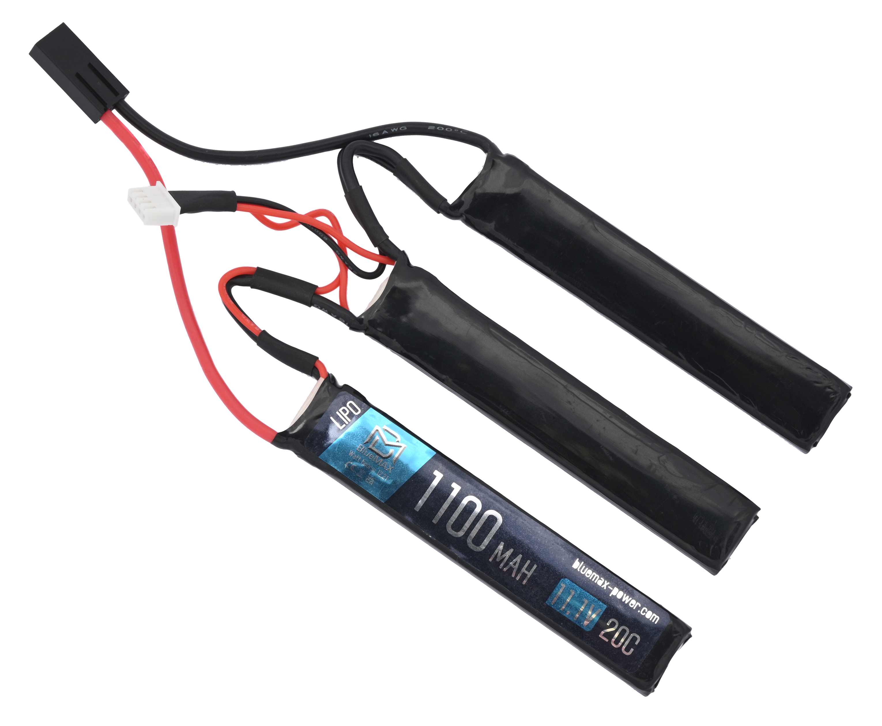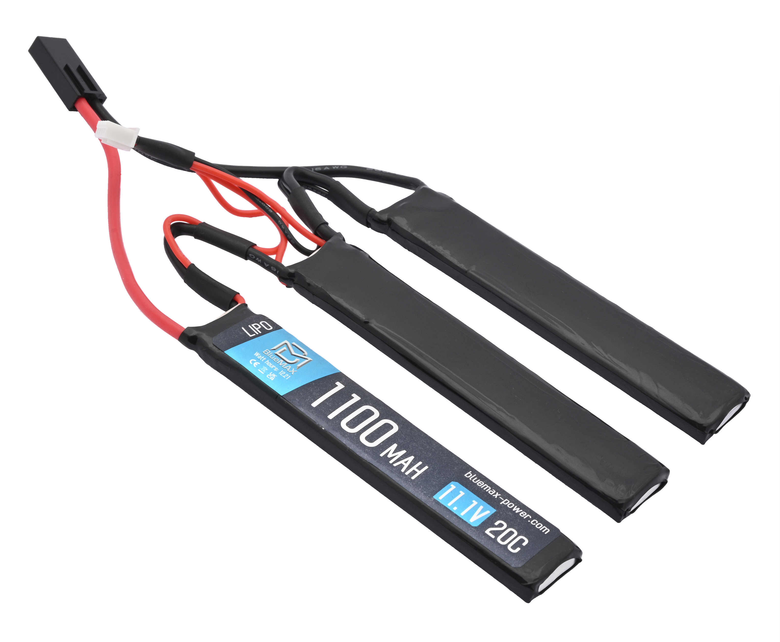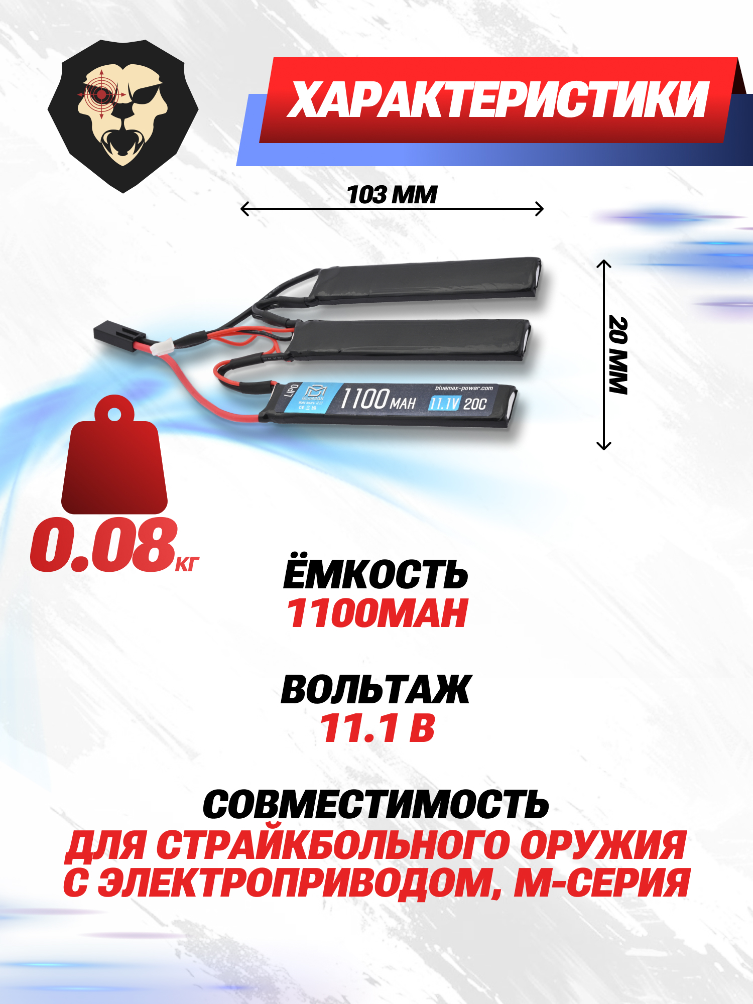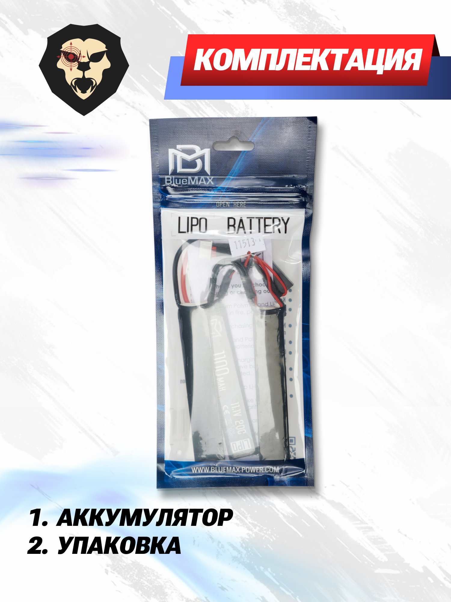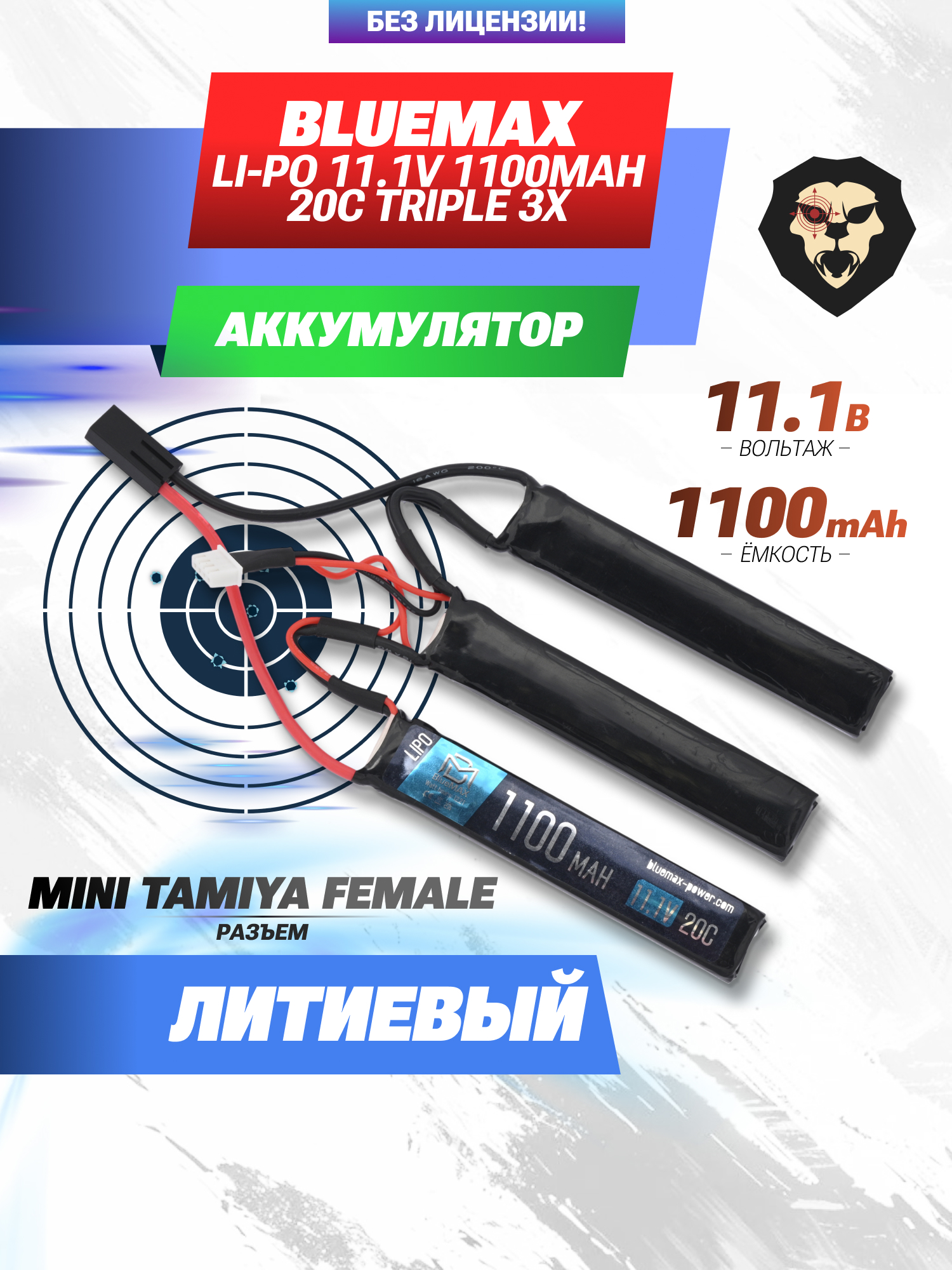 BlueMax Li-Po 11.1V 1100mAh 20C Triple 3x - это батарея, которая предназначена для передачи энергии в пневматическое оружие. Рассматриваемая модель оснащена емкостью на 1100 мАч, это дает хранить и выдавать достаточное количество энергии для продолжительного использования устройства. Это важно, когда стрелок расположен вдали от источника питания и не может часто заряжать аккумулятор.