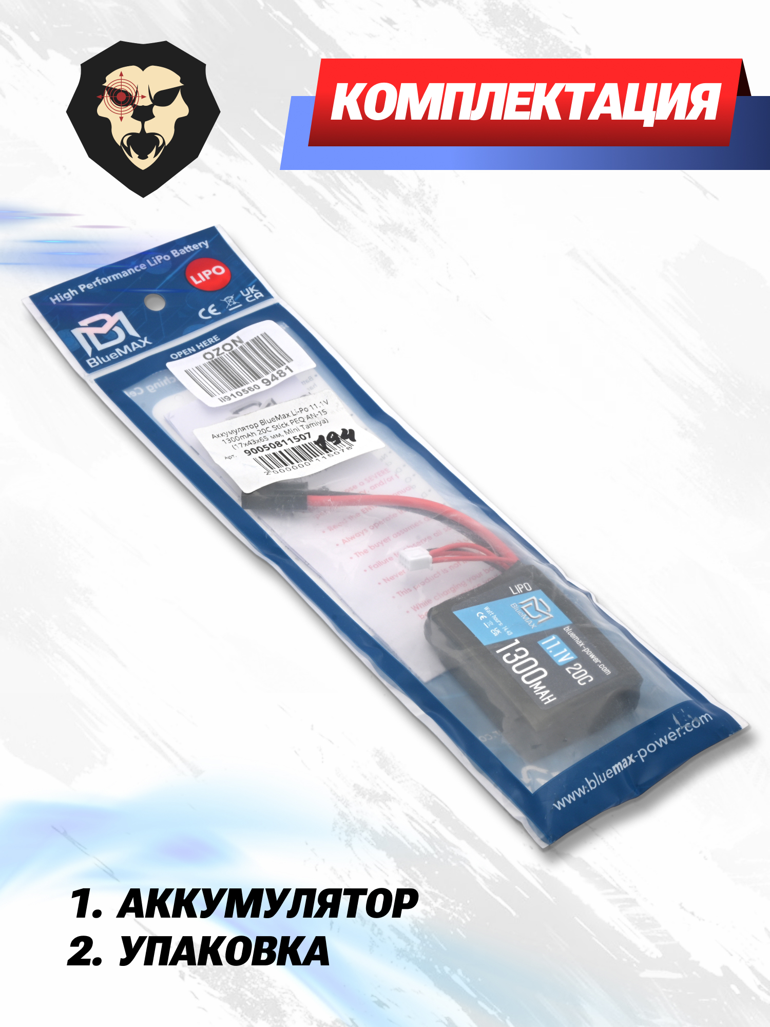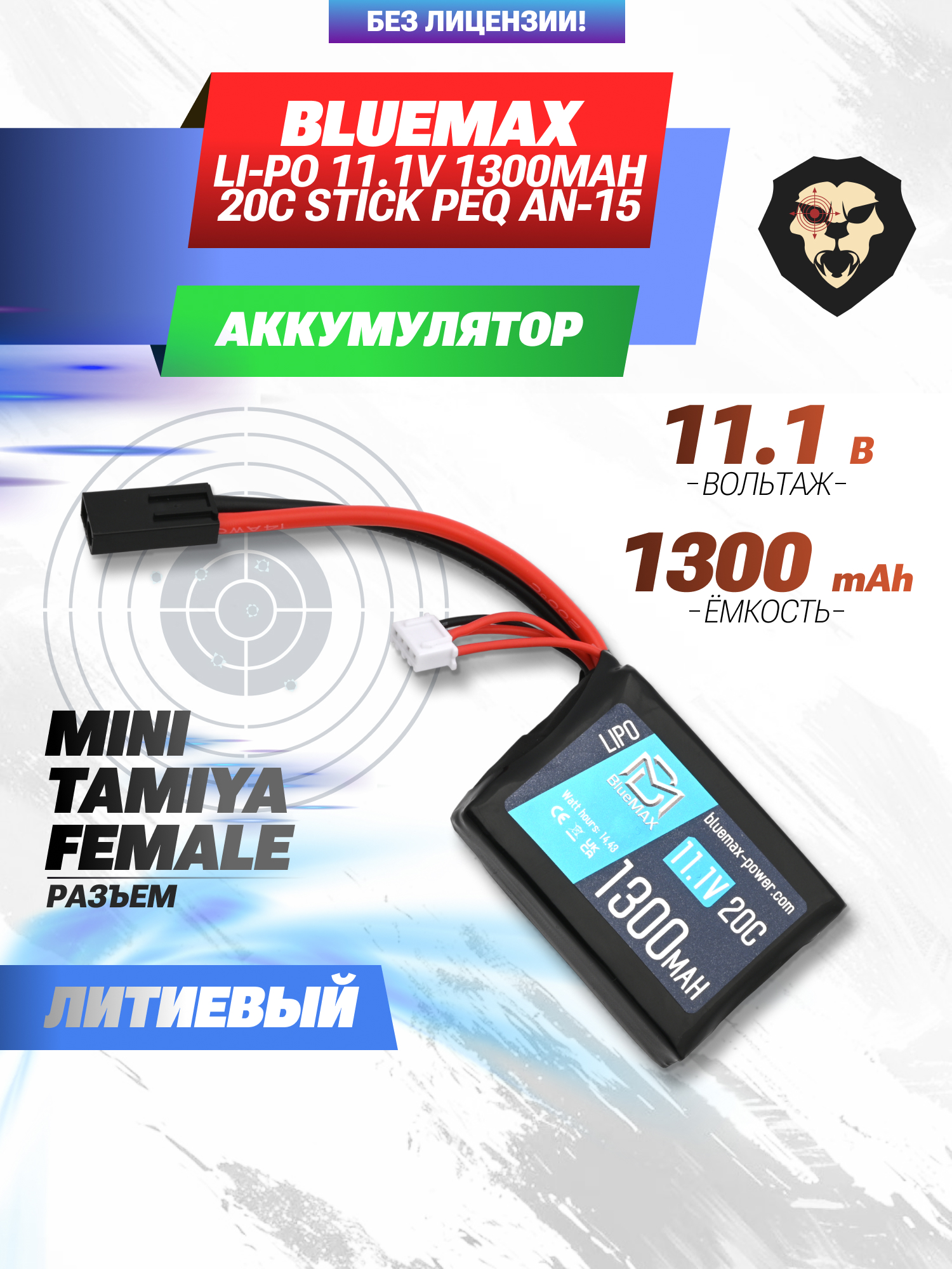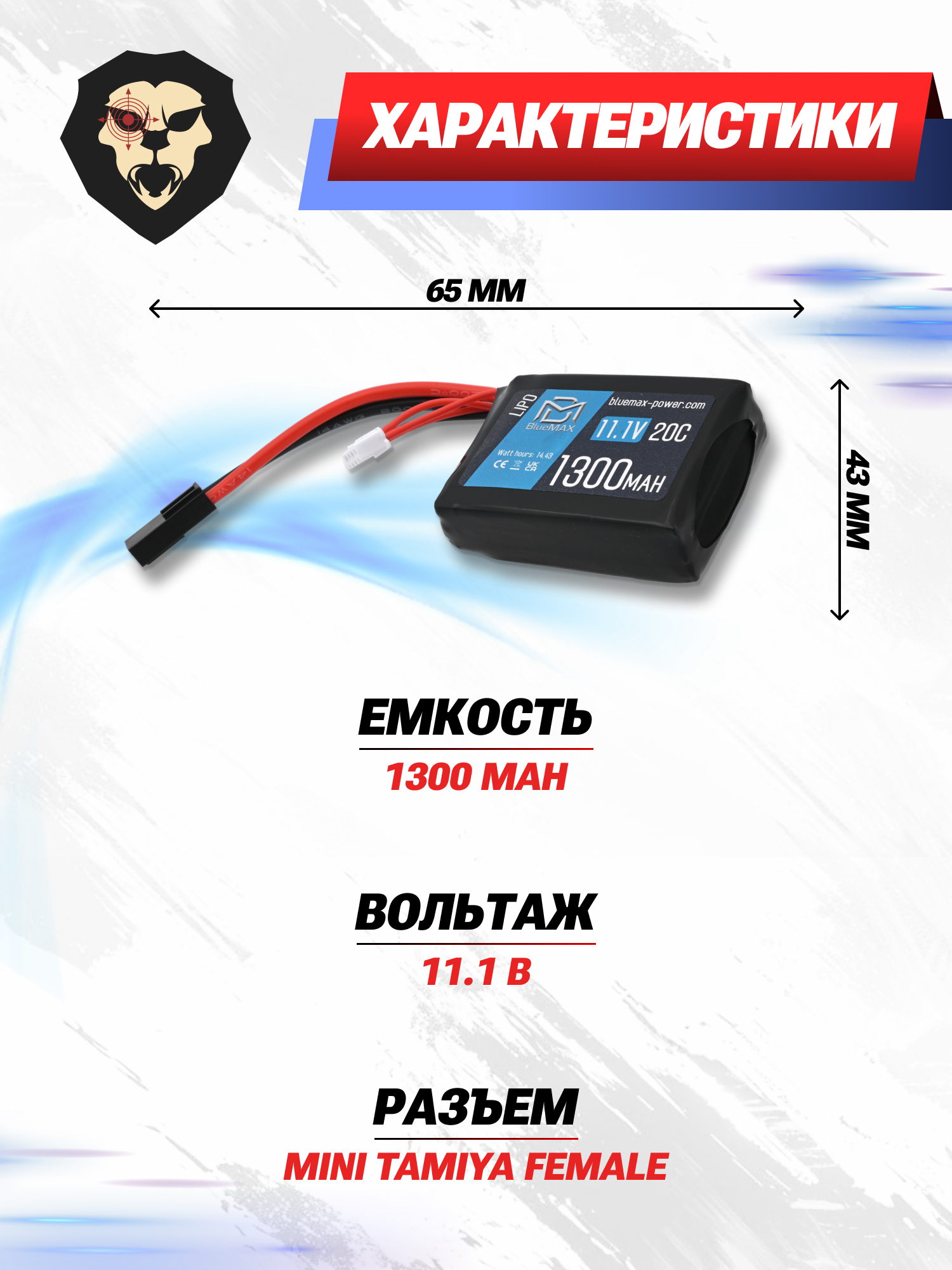 В батарее BlueMax Li-Po 11.1V используется коннектор формата Mini Tamiya, который выполнен в плоской форме. Это обеспечивает надежную фиксацию с ответной частью в пневматике стрелка. Чтобы продлить срок службы устройства, следует производить подзарядку с помощью специализированных станций и переходников.