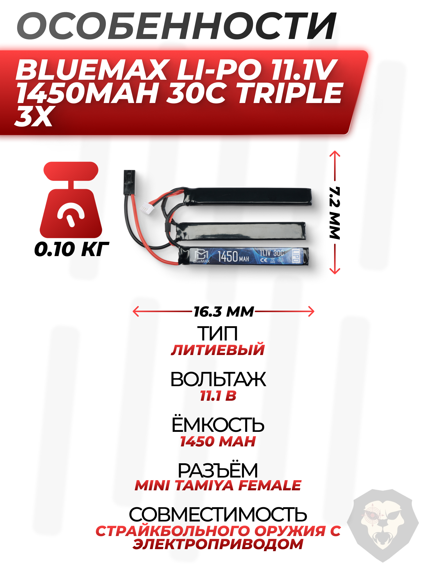 Размеры батареи равняются 7.2x16.3x115 мм и способствуют легкой установке источника заряда в модели оружия с подходящим отсеком. Характеристики Li-Po АКБ позволяют достичь снизиженного уровня саморазряда и увеличить продолжительность срока службы.