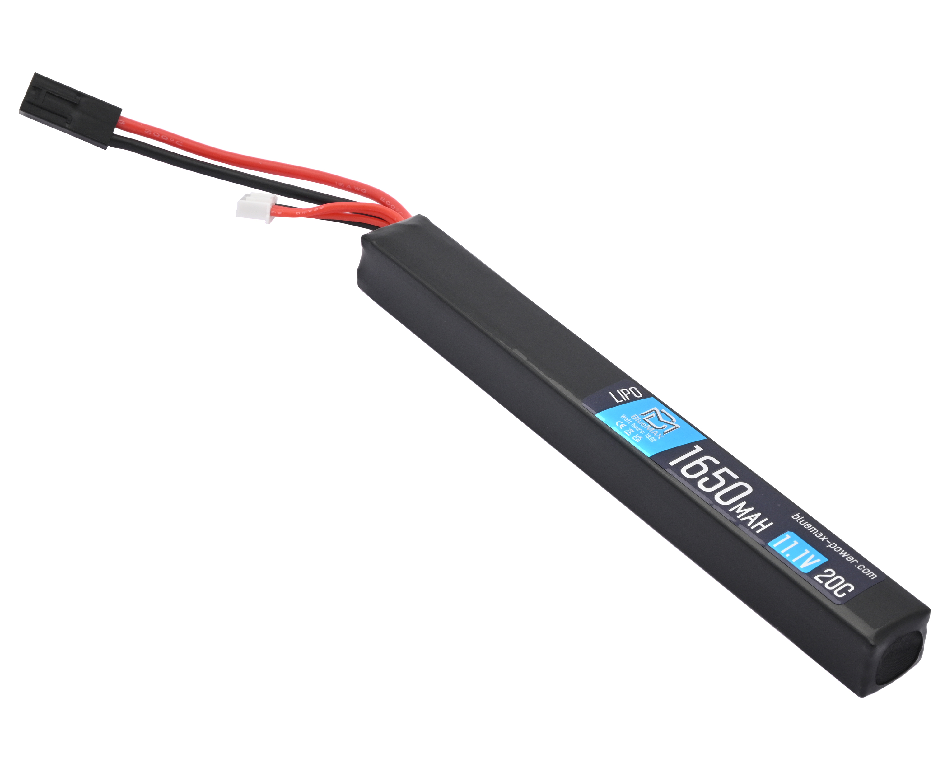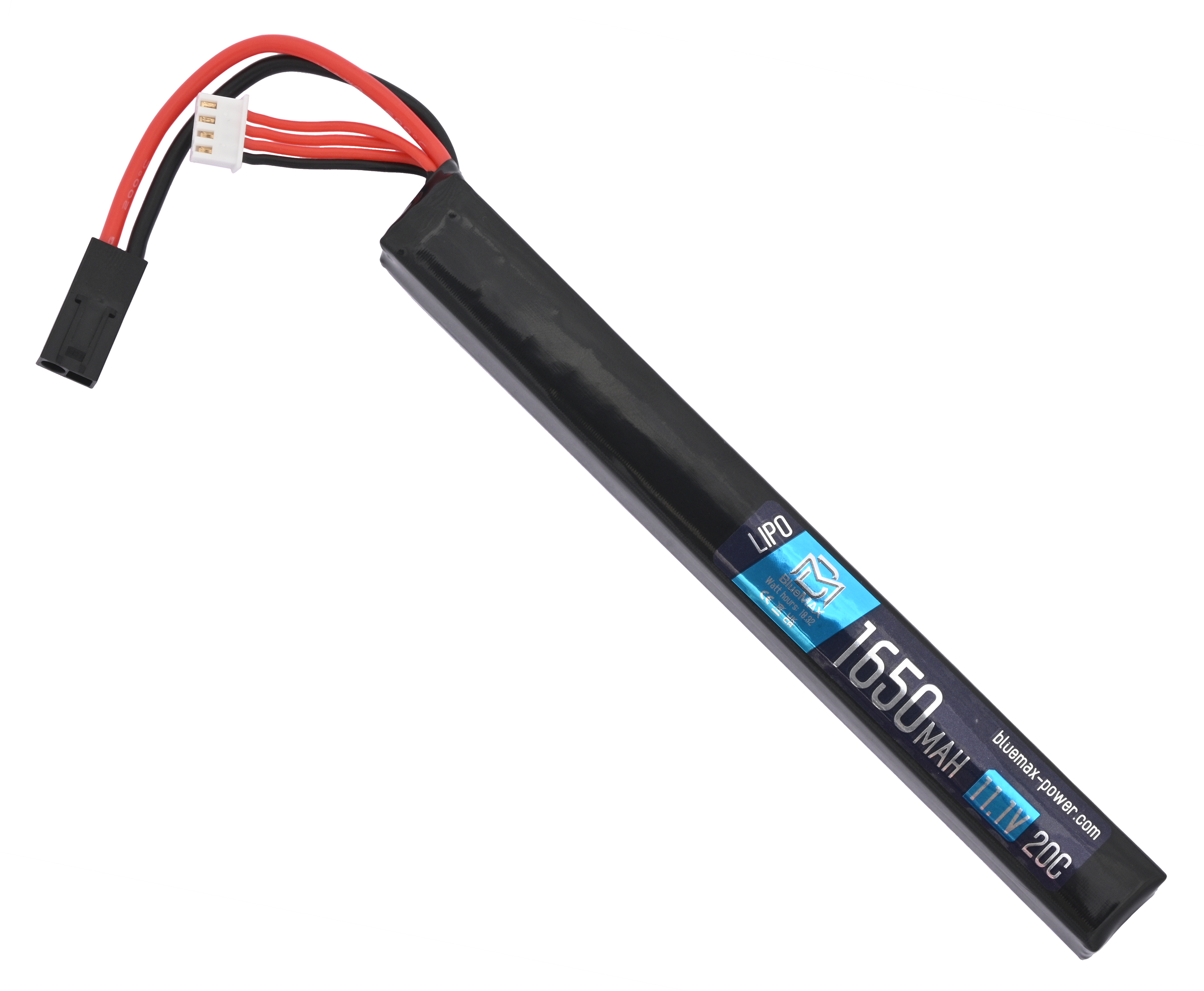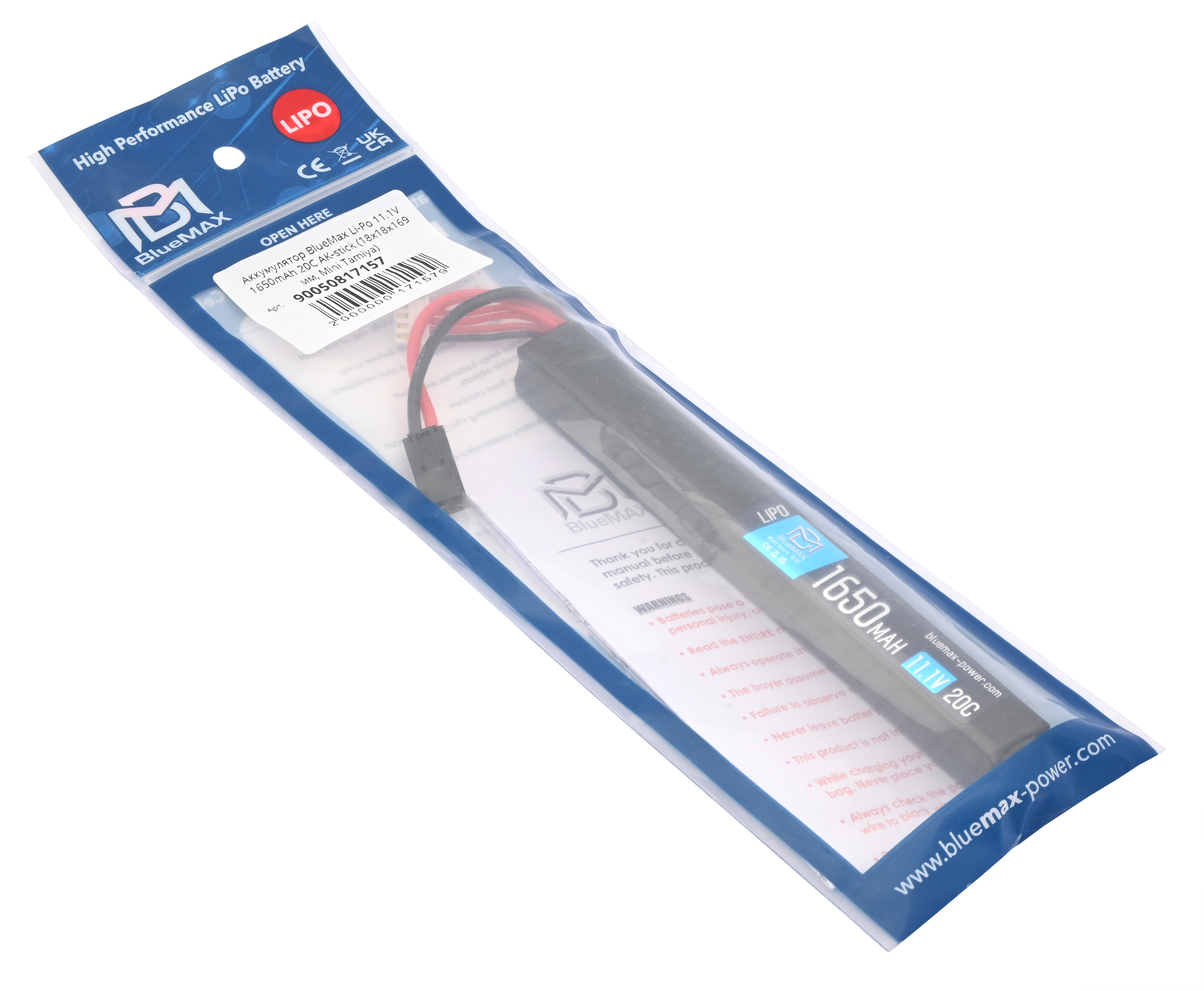 Аккумулятор Li-Po BlueMax AK-stick рассчитан на 1650 мАч и выделяется токоотдачей 20C - оптимальное значение для скорострельных автоматических карабинов. Заявленное рабочее напряжение 11.1 В - благодаря такому показателю изделие подойдет для приводов с тюнингом под высокую скорость вылета шара. Сборка предрасполагает к большим нагрузкам, что обусловлено типом электролита, однако при этом рекомендуется восполнять заряд только при помощи специализированных ЗУ с балансировочным разъемом.