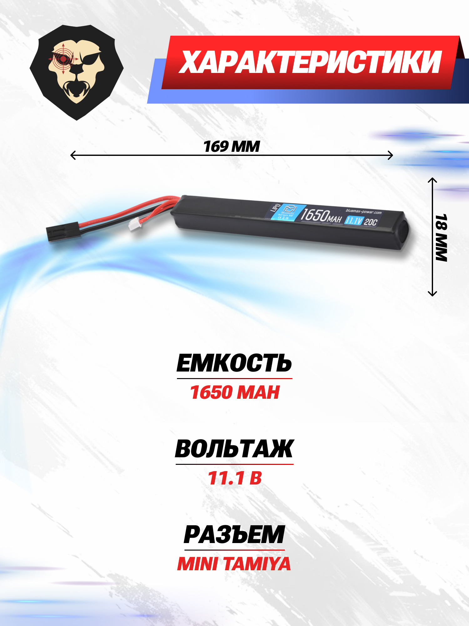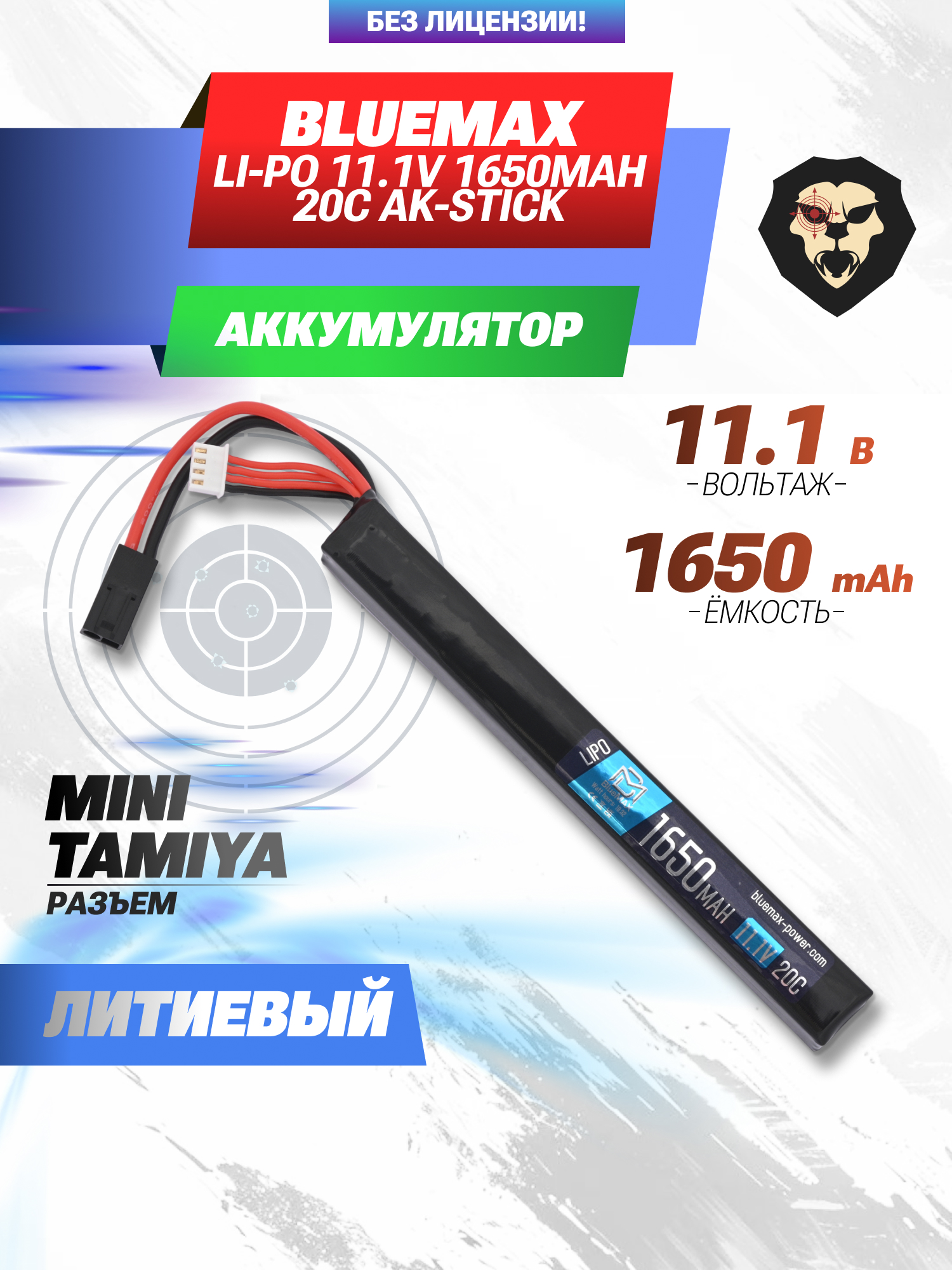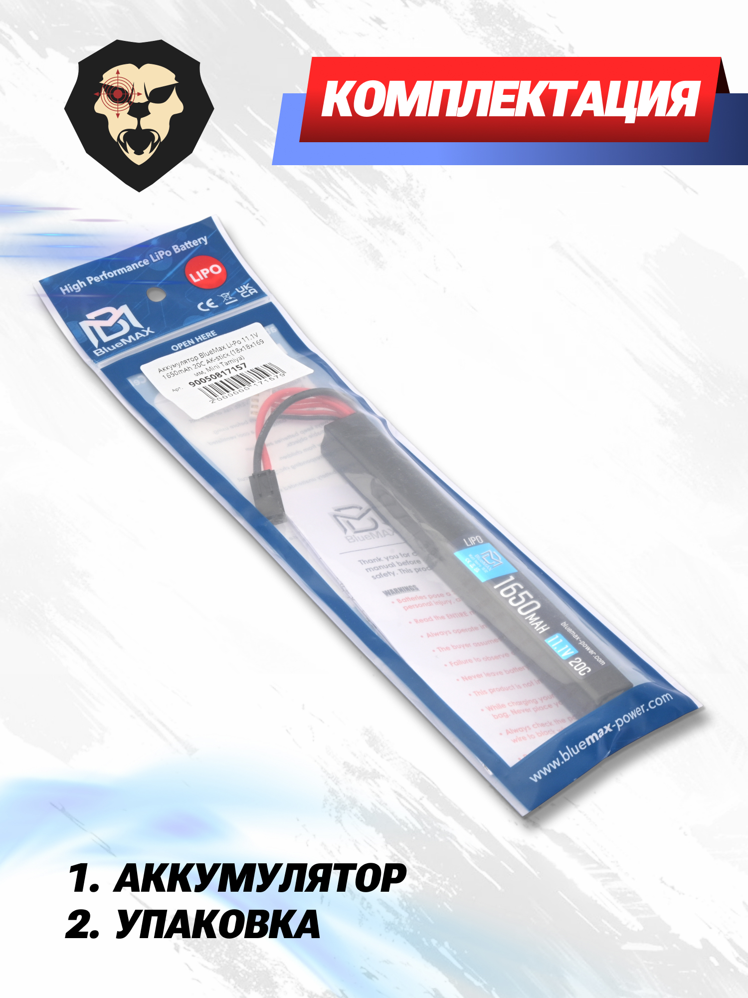Аккумулятор Li-Po BlueMax AK-stick рассчитан на 1650 мАч и выделяется токоотдачей 20C - оптимальное значение для скорострельных автоматических карабинов. Заявленное рабочее напряжение 11.1 В - благодаря такому показателю изделие подойдет для приводов с тюнингом под высокую скорость вылета шара. Сборка предрасполагает к большим нагрузкам, что обусловлено типом электролита, однако при этом рекомендуется восполнять заряд только при помощи специализированных ЗУ с балансировочным разъемом.