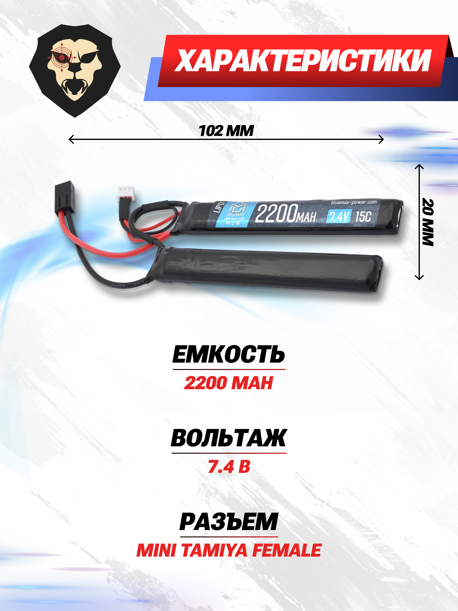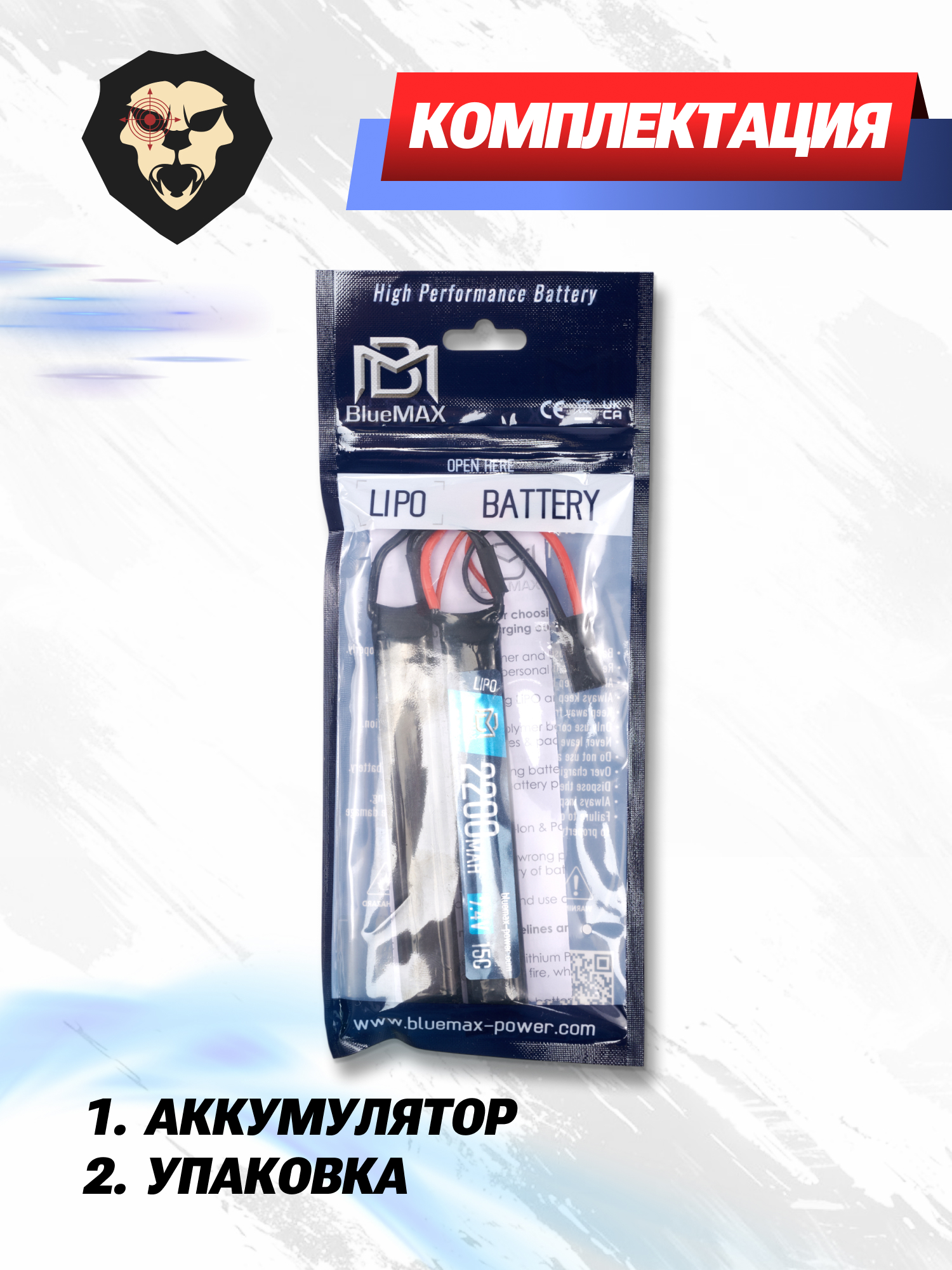 Рассматриваемый аккумулятор Bluemax 7.4 V изготавливается в формате литий-полимерного источника энергии с внутренним объемом 2200 миллиампер в час. Указанные показатели позволяют использовать пневматическое страйкбольное оружие продолжительное время на одном заряде, не прерываясь на смену АКБ или его подзарядку.