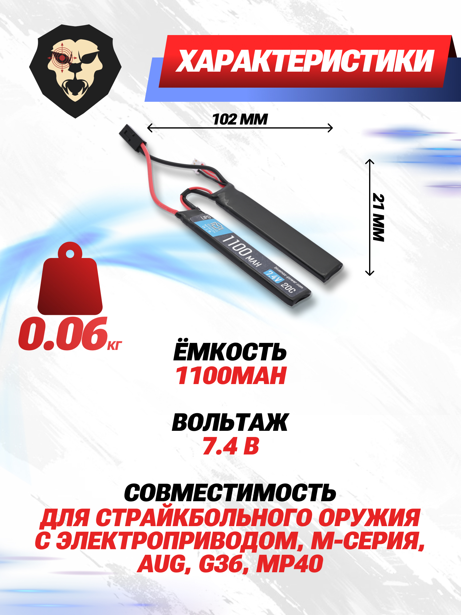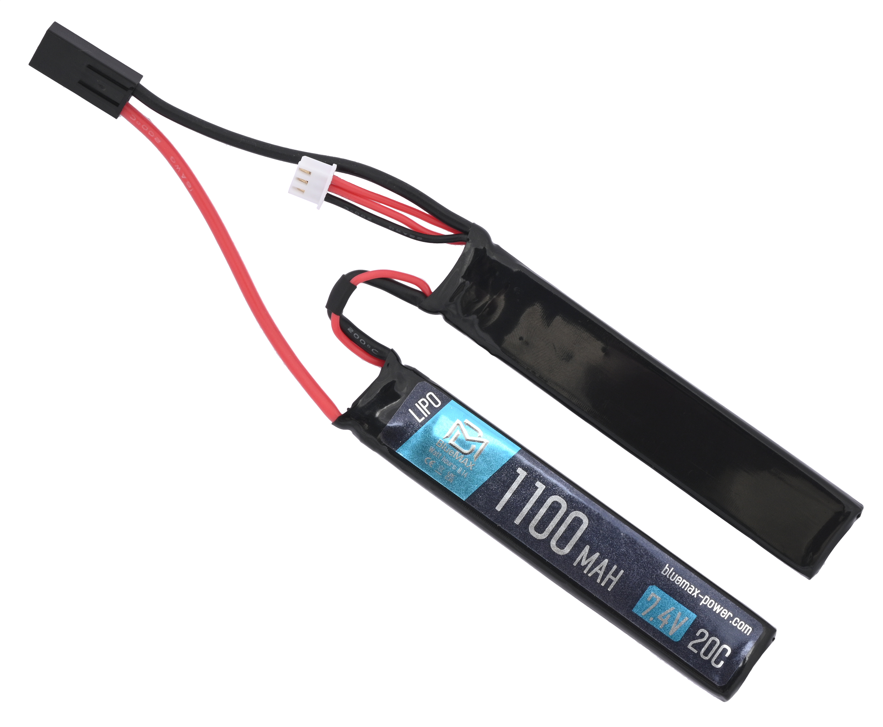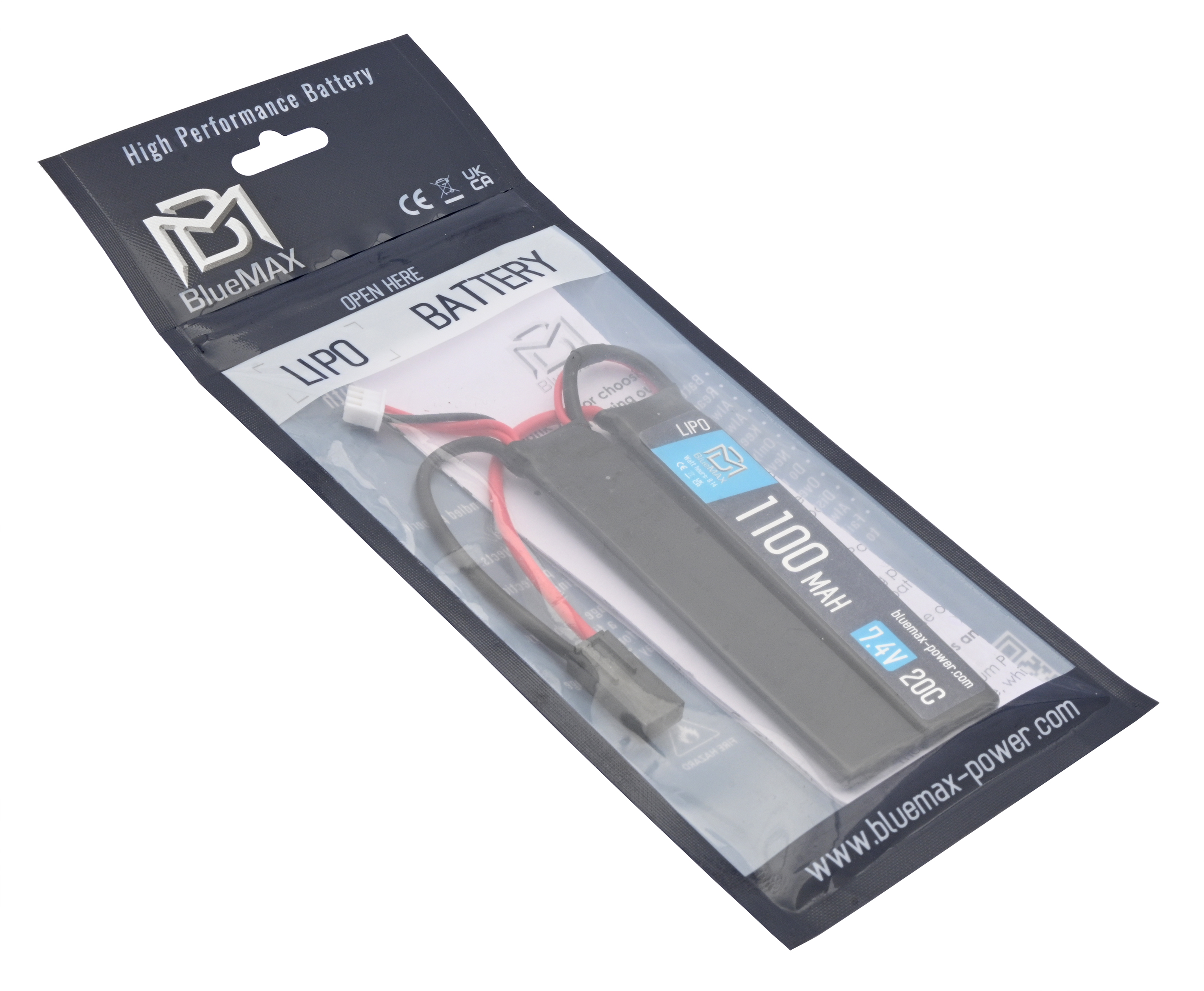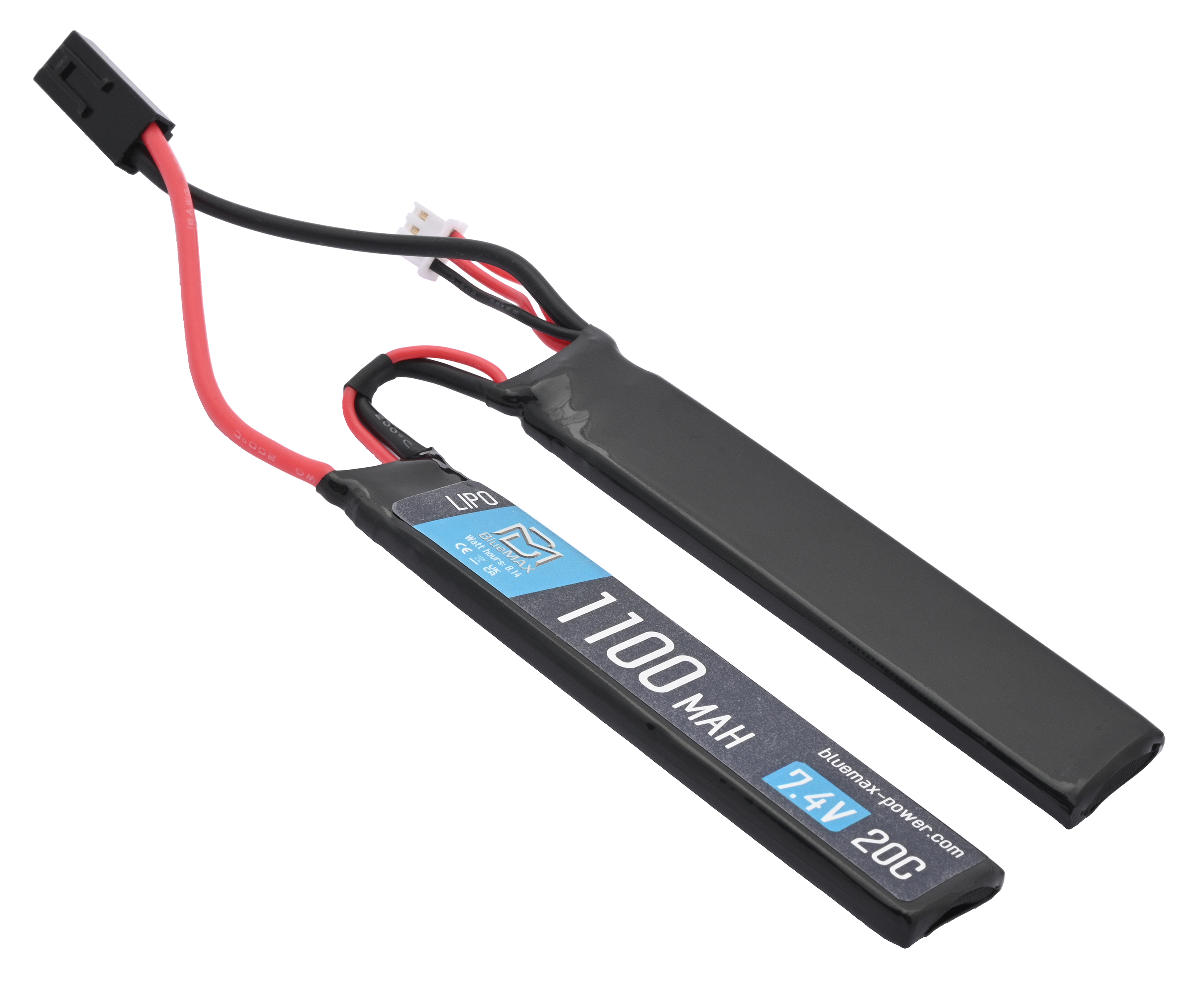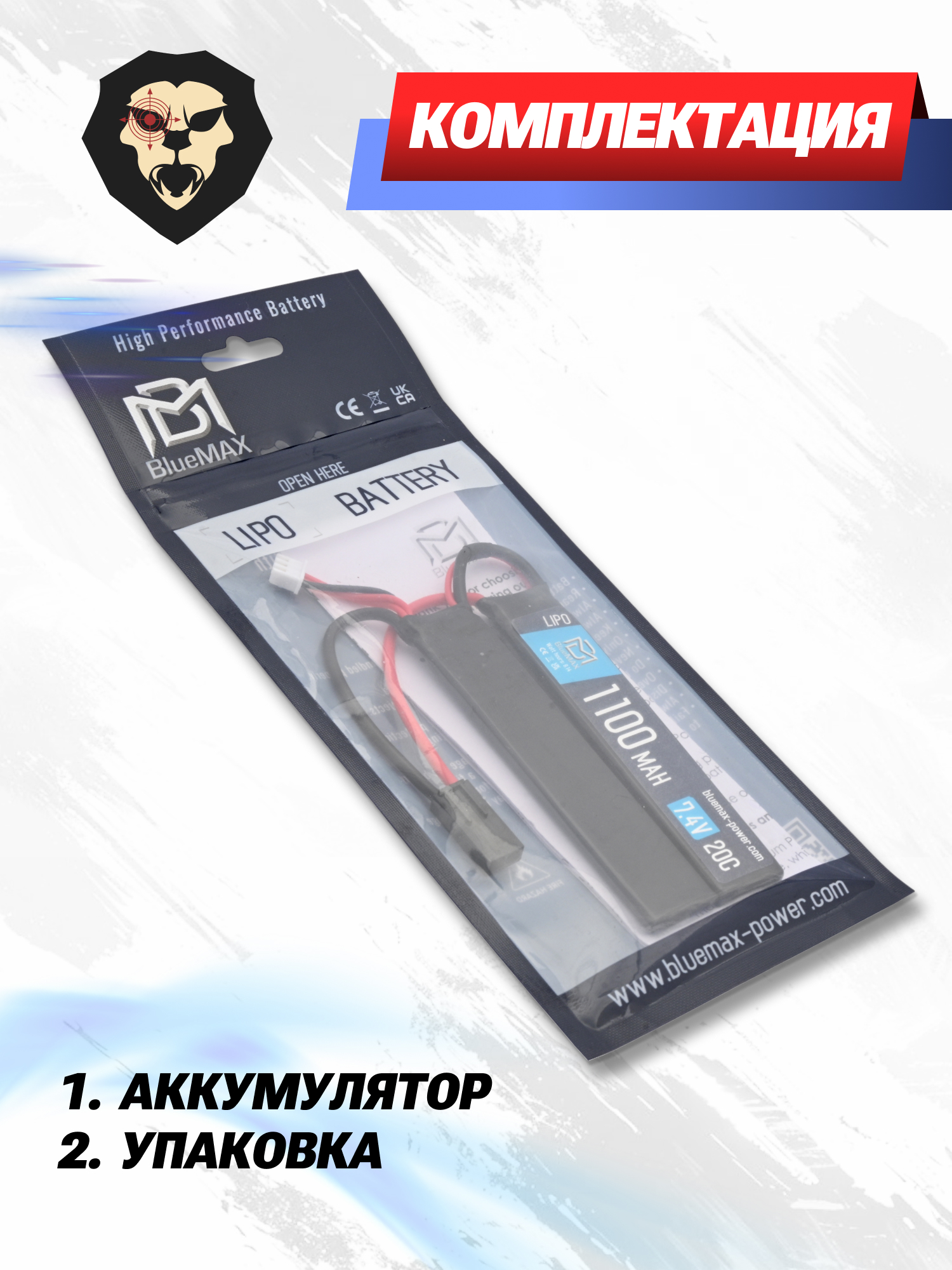 БлюМакс аккумуляторы Li-Po дают напряжение в 7.4 вольта, такой показатель считается стандартным для большинства пневматического оружия. Обозреваемый экземпляр славится прочными материалами при изготовлении и продолжительным сроком эксплуатации. Емкость на рассматриваемом устройстве равняется 1100mAh.