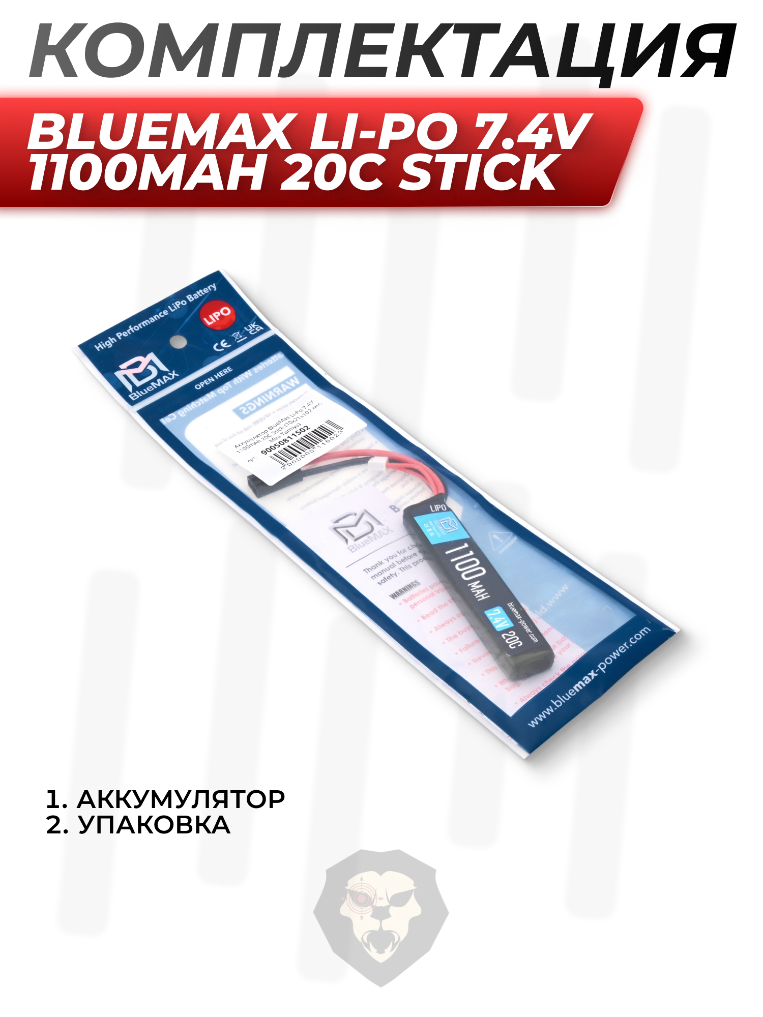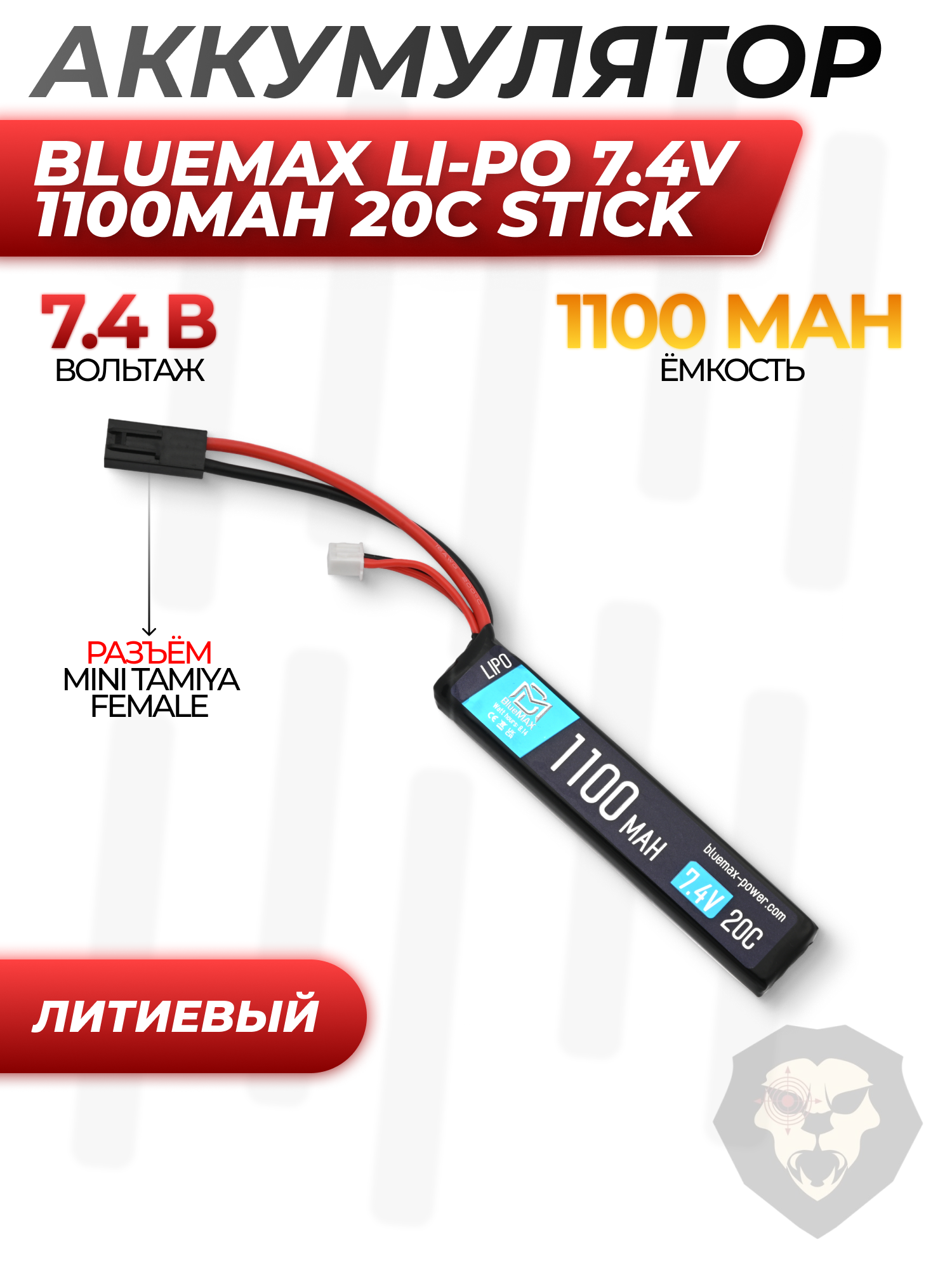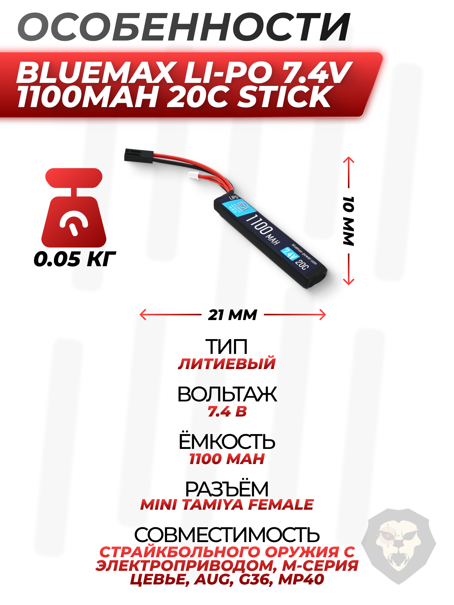 BlueMax Li-Po 1100mAh 20C Stick выдает номинальное напряжение 7.4 вольта, что считается стандартным значением для этого класса аккумуляторов. Рассматриваемый экземпляр известен надежностью и применим не только для устройств, производимых этой компанией, но и для других моделей страйкбольного оружия и аксессуаров с подобными требованиями к энергии.