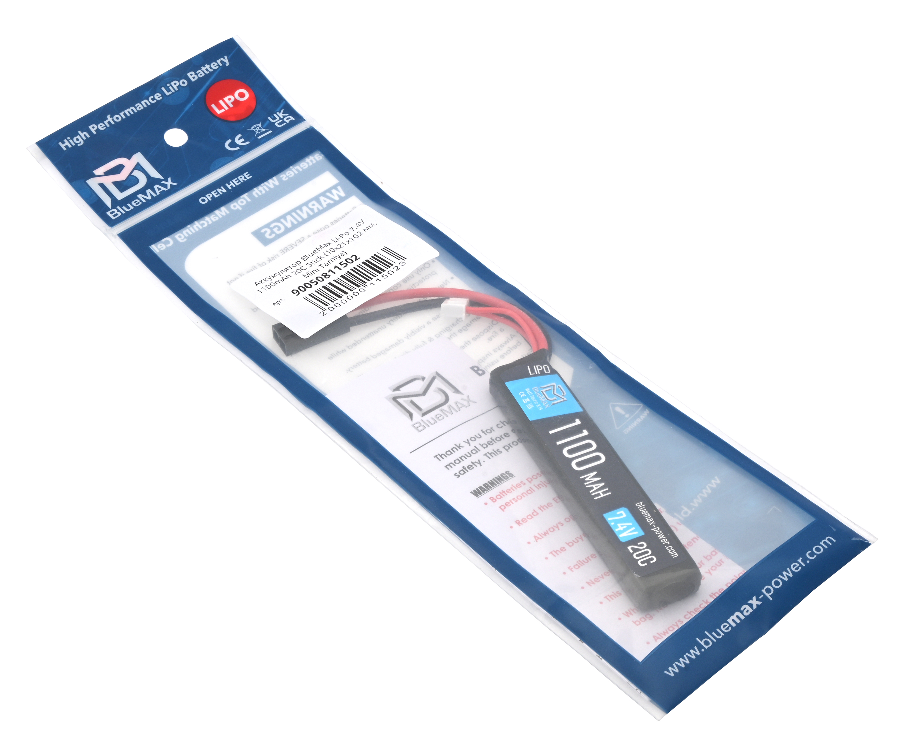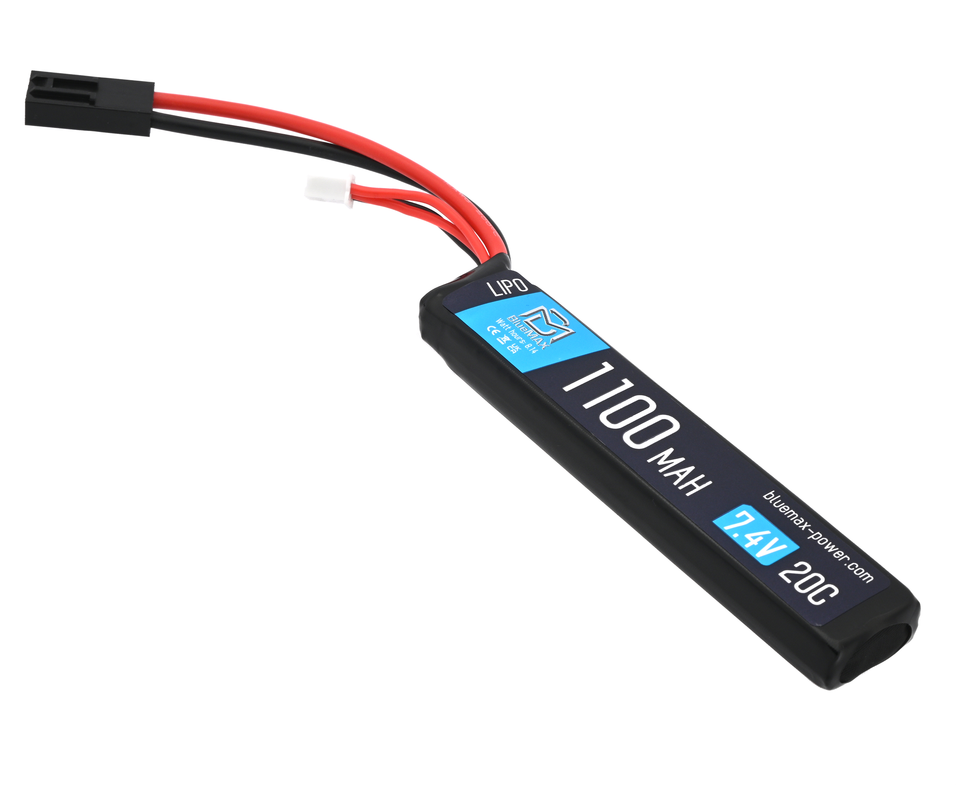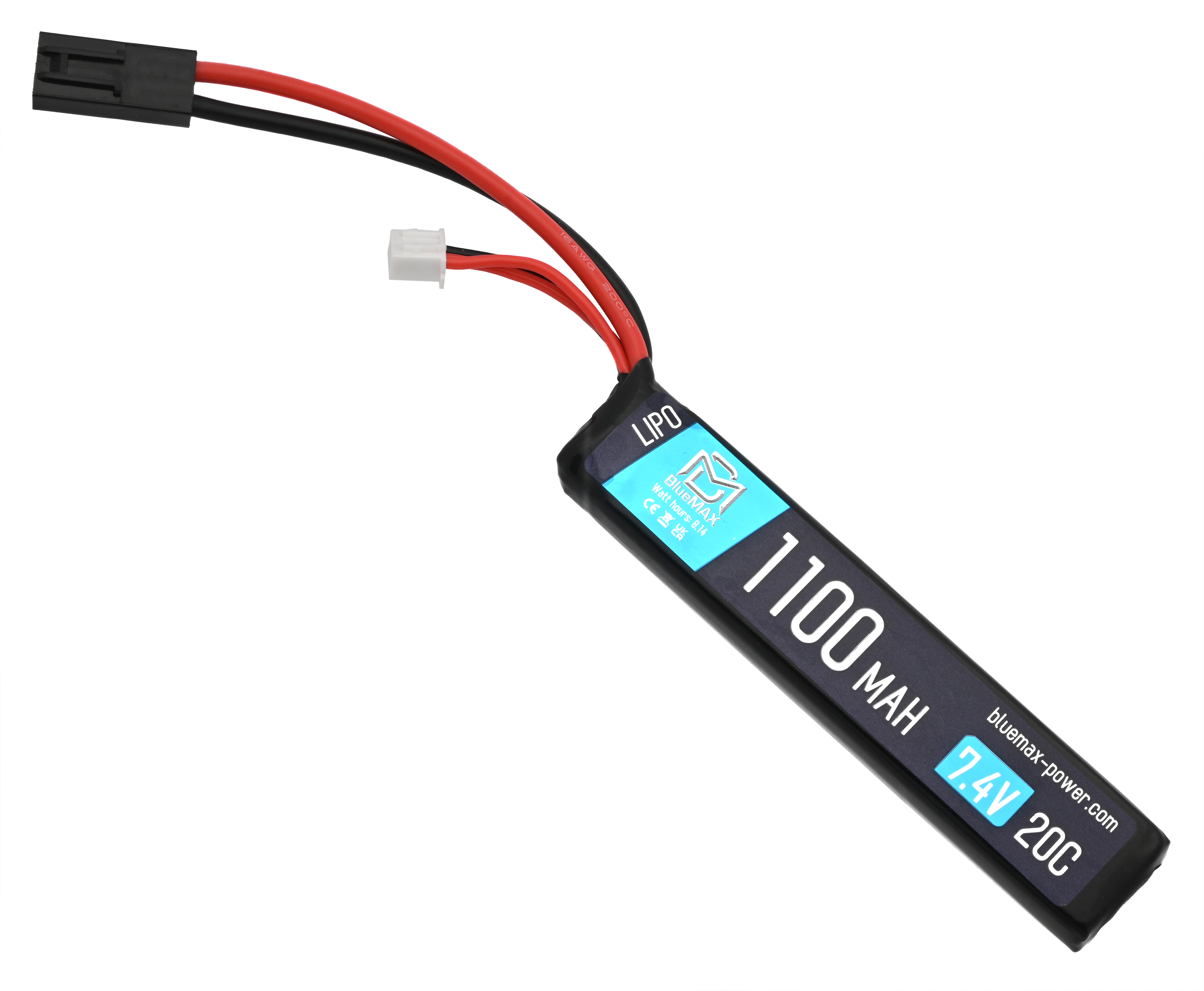 BlueMax Li-Po 1100mAh 20C Stick выдает номинальное напряжение 7.4 вольта, что считается стандартным значением для этого класса аккумуляторов. Рассматриваемый экземпляр известен надежностью и применим не только для устройств, производимых этой компанией, но и для других моделей страйкбольного оружия и аксессуаров с подобными требованиями к энергии.