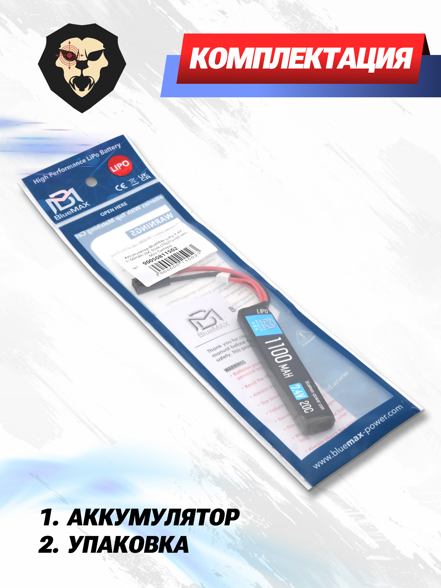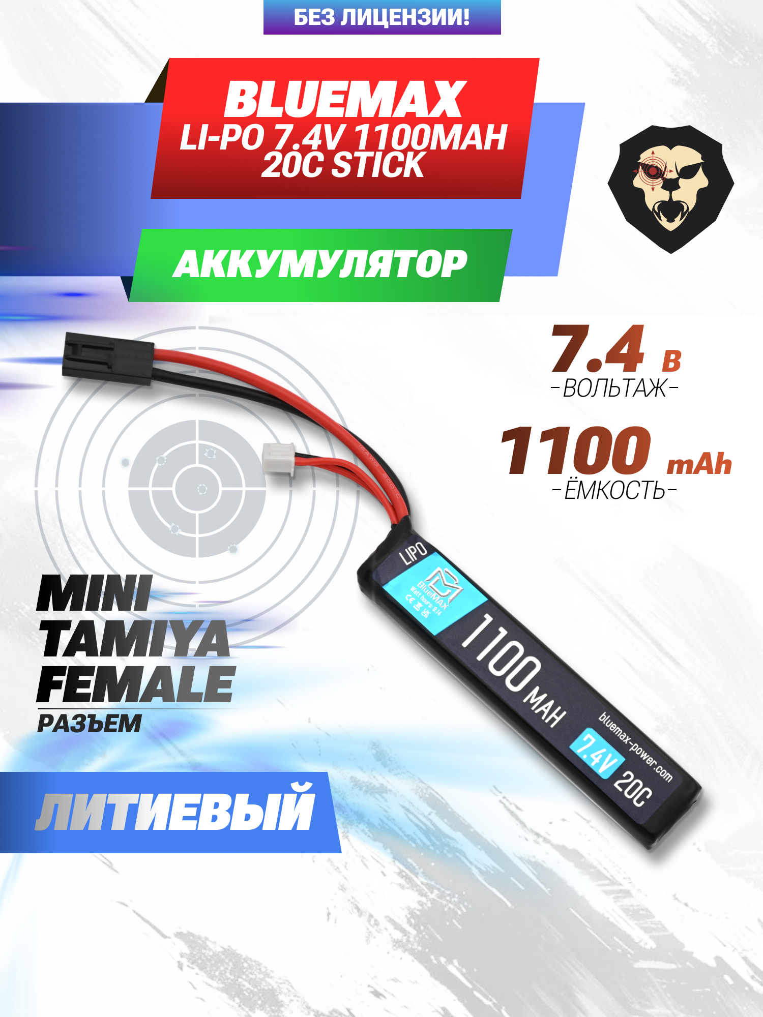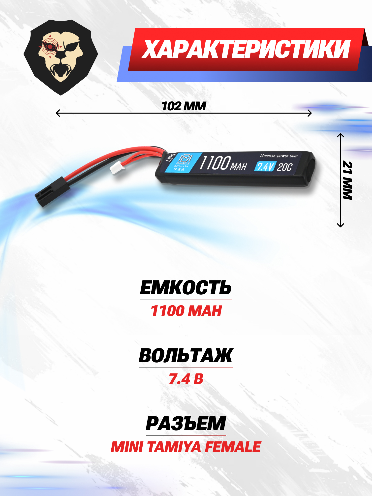 BlueMax Li-Po 1100mAh 20C Stick выдает номинальное напряжение 7.4 вольта, что считается стандартным значением для этого класса аккумуляторов. Рассматриваемый экземпляр известен надежностью и применим не только для устройств, производимых этой компанией, но и для других моделей страйкбольного оружия и аксессуаров с подобными требованиями к энергии.