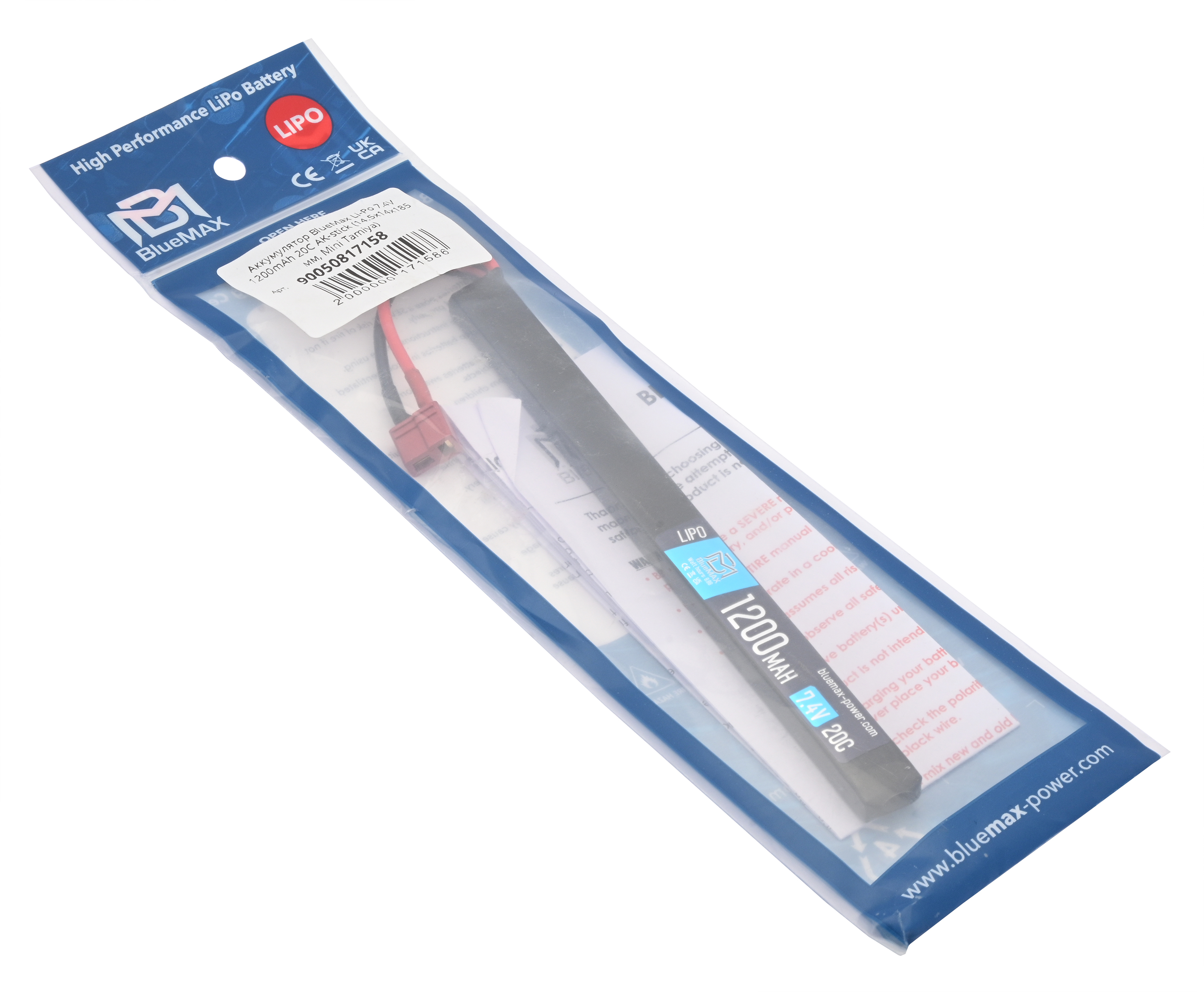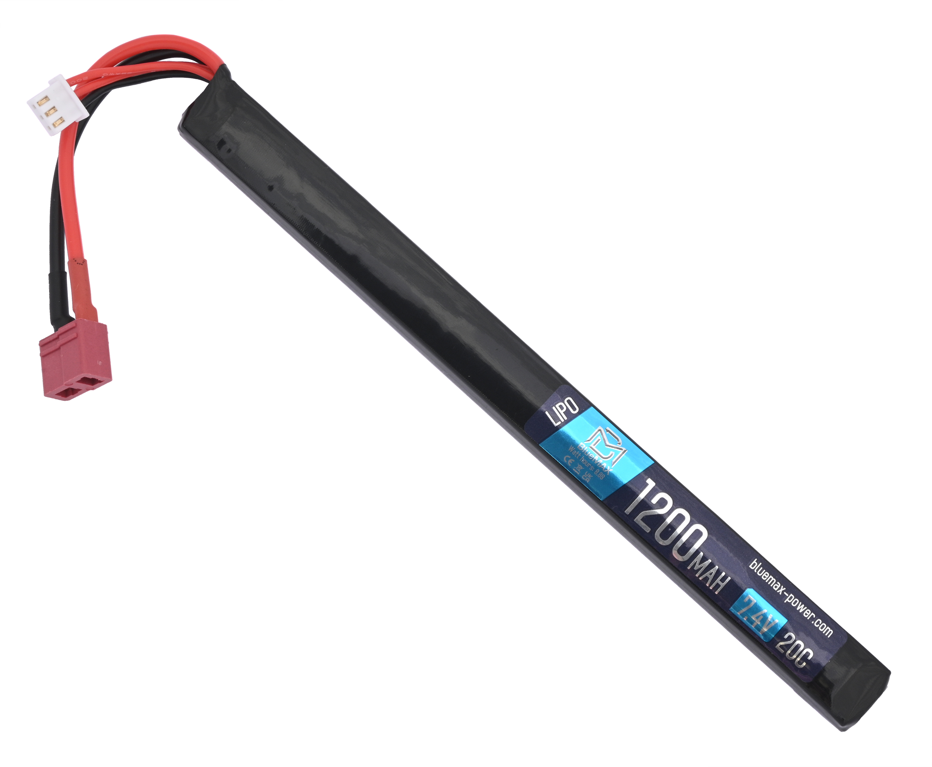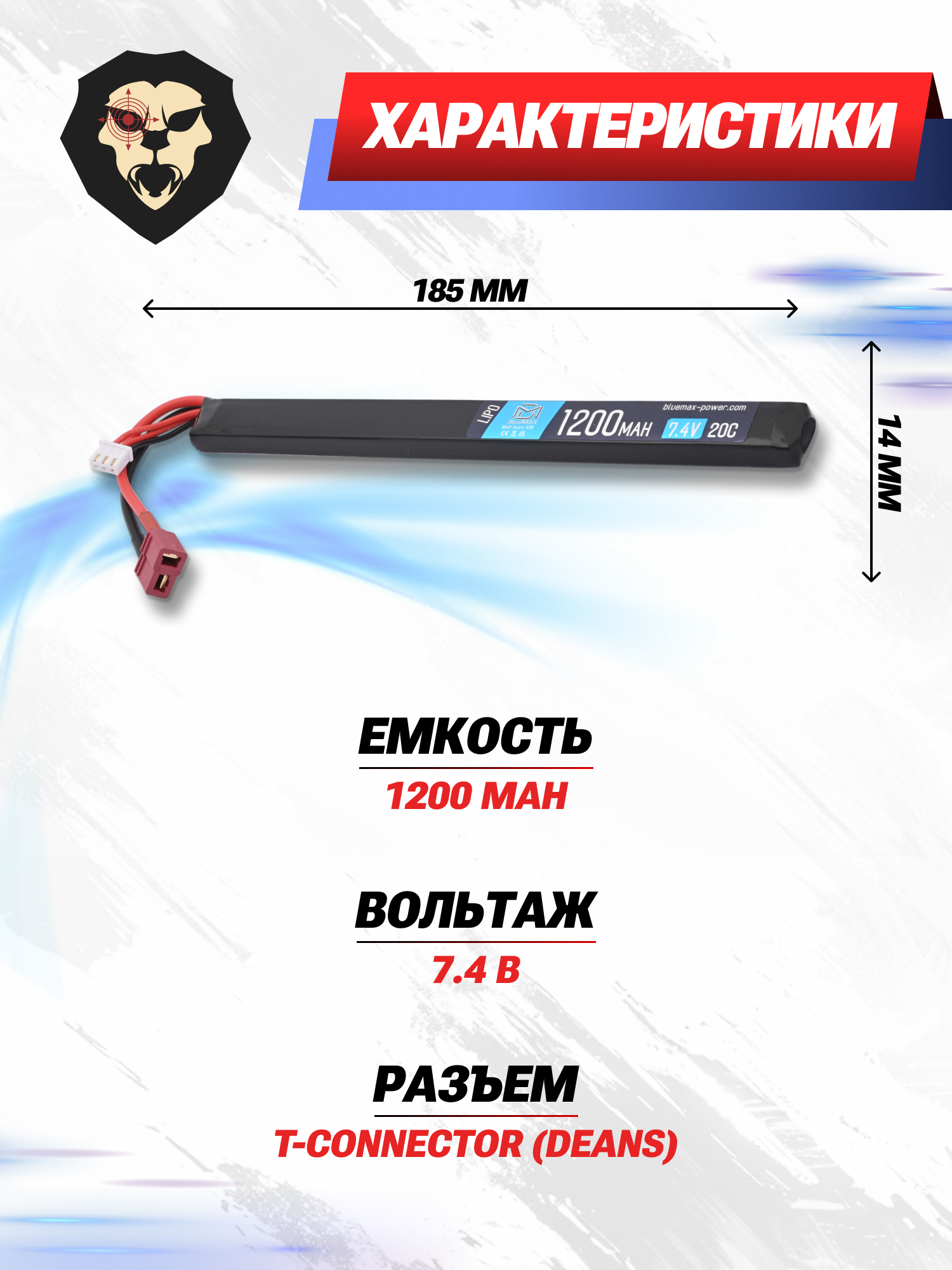 Аккумулятор для страйкбольного привода BlueMax выдает 7.4 V. Литий-полимерный АКБ выделяется стабильностью при работе с большими нагрузками и не просаживается по напряжению в таких условиях эксплуатации, что положительно отражается на игровом опыте. Заявленная емкость составляет 1200 мАч при токоотдаче 20C.