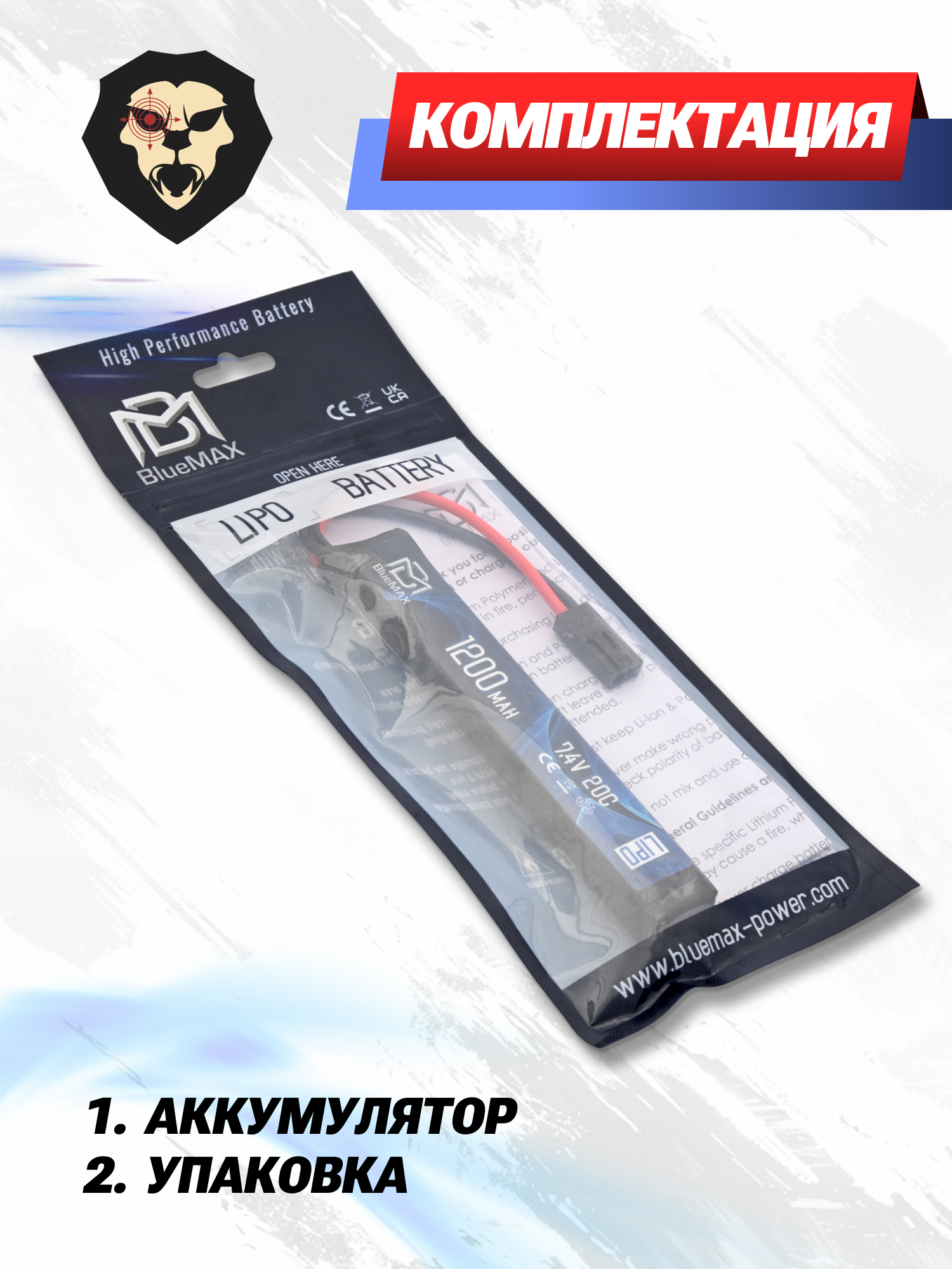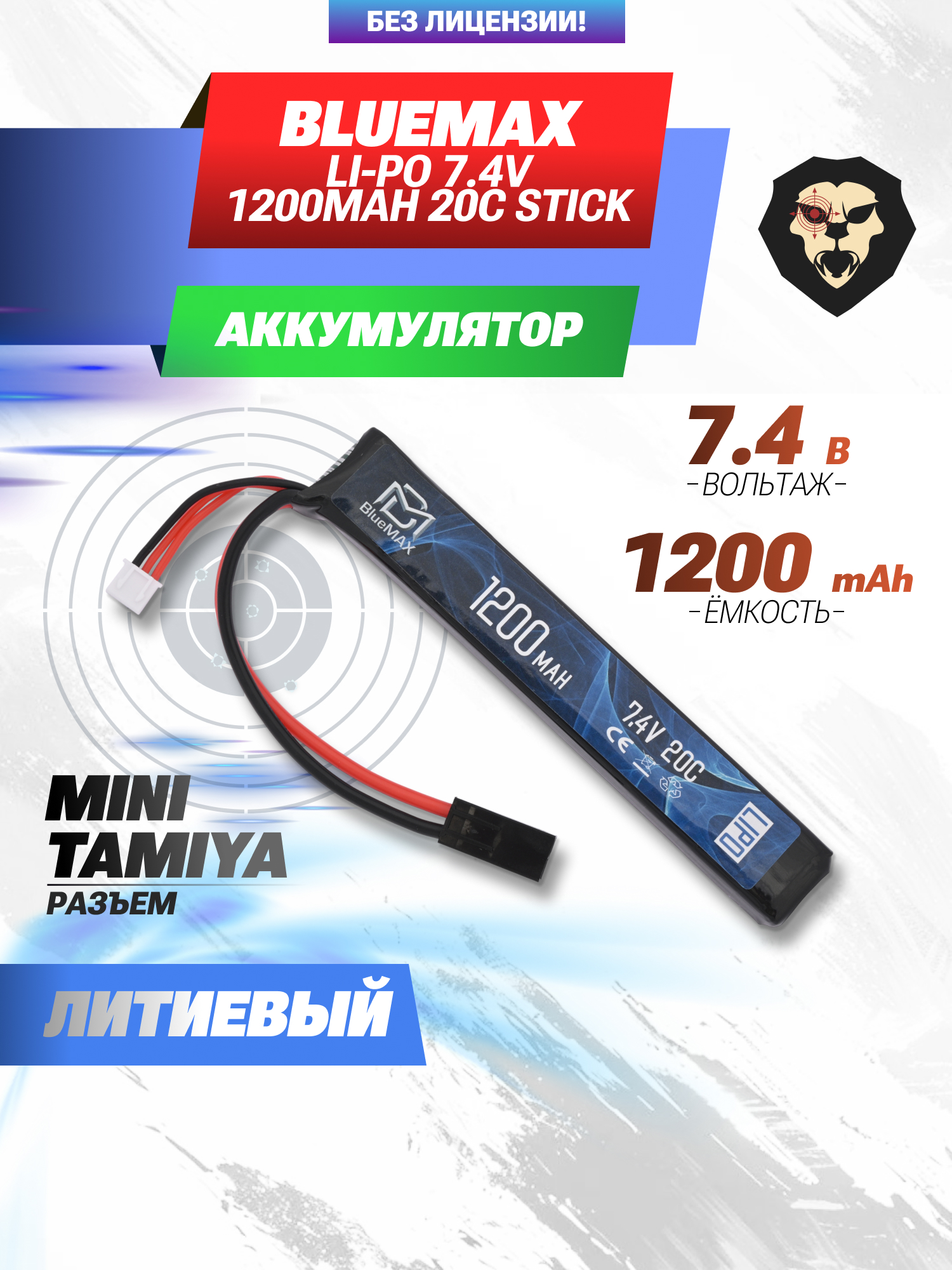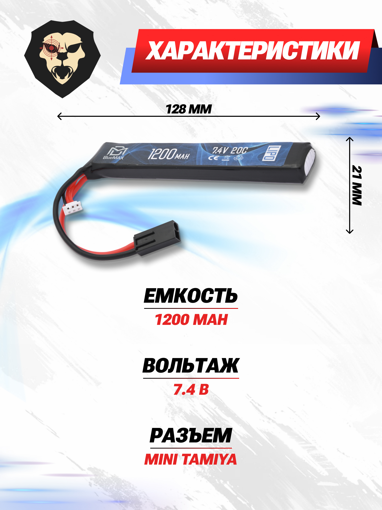 Представленный аккумулятор 7.4 v 1200mah от BlueMax предназначен для приводов М-серии, а также автоматов H&K G36. Ввиду компактных размеров модель подходит для размещения в трубе приклада, либо за цевьем. Габариты экземпляра - 13.3x21x128 мм.