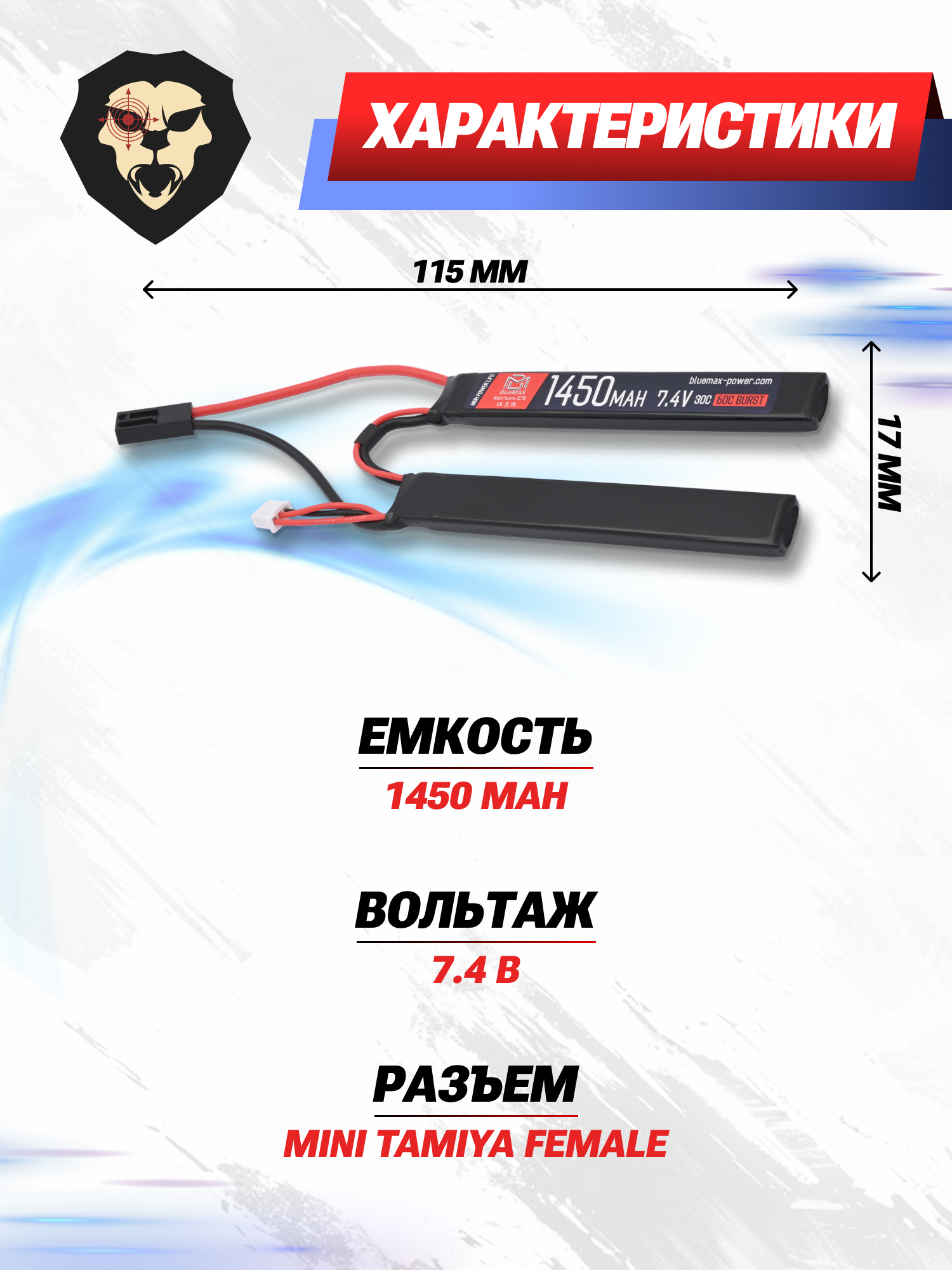 Следует отметить, что такой источник питания BlueMAX Li-Po 7.4V оснащен разъемом для подключения формата Mini-Tamiya, благодаря чему обеспечивается надежное соединение с электроникой в оружии стрелка.