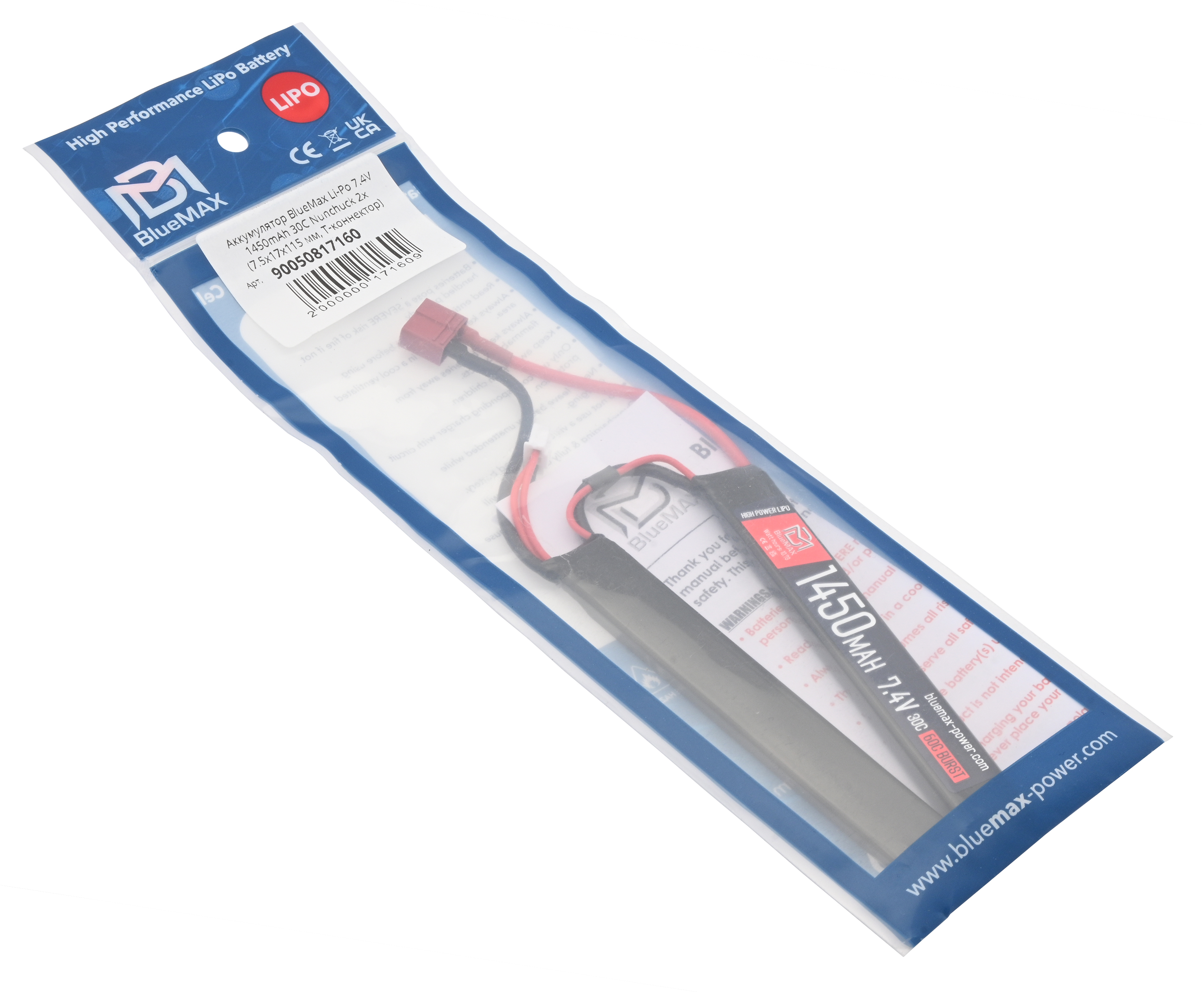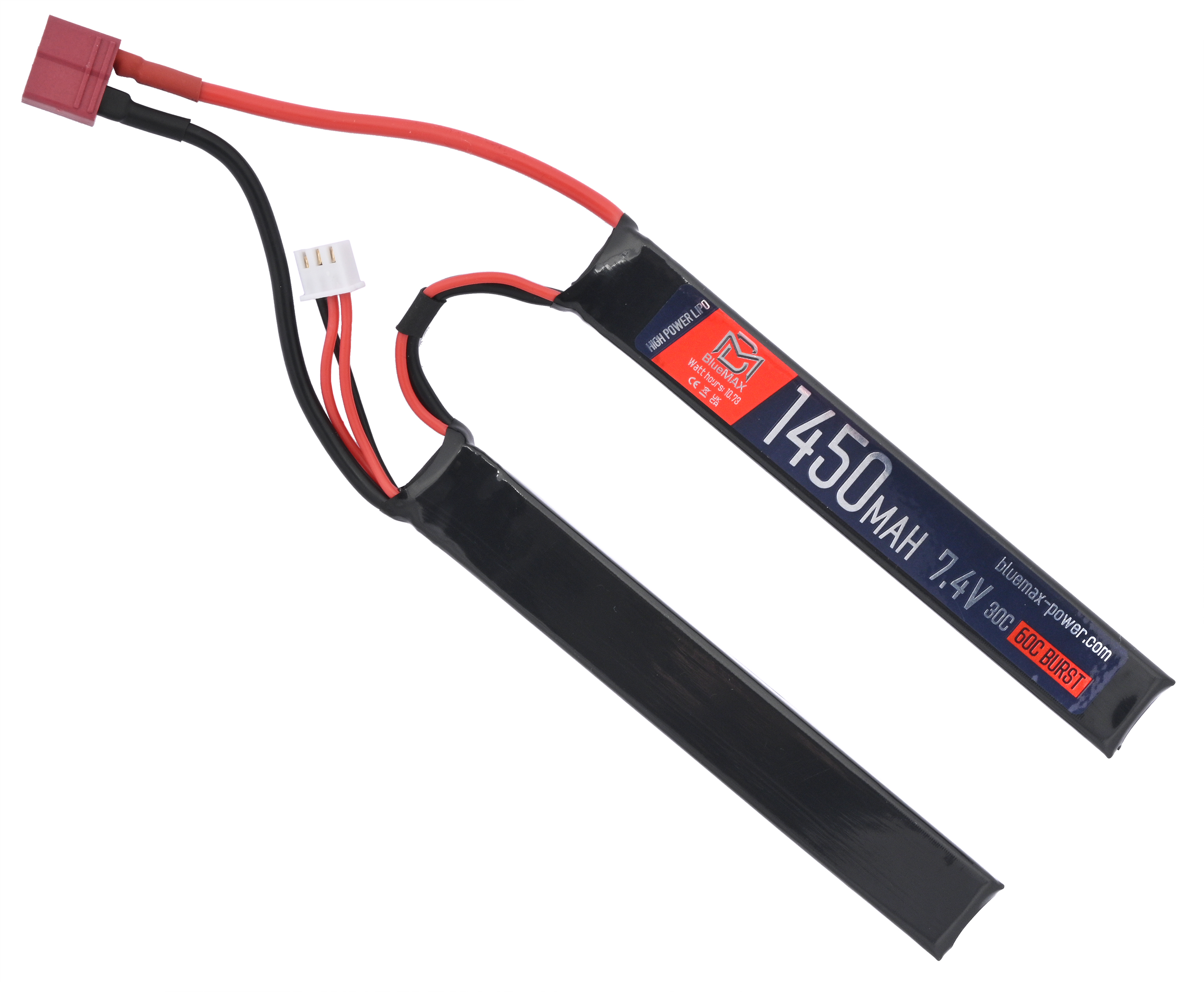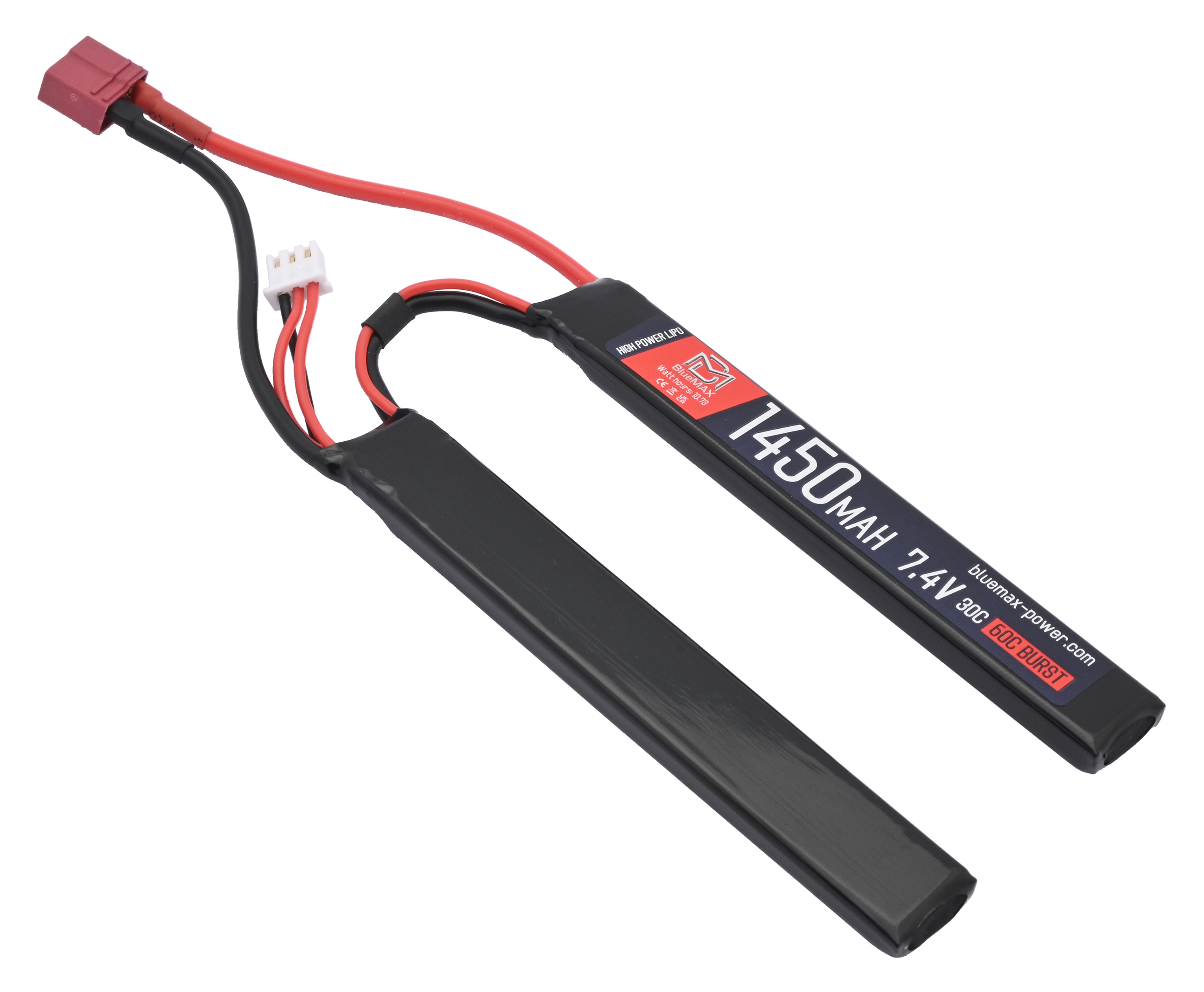 Аккумулятор BlueMax 7.4 V Li-Po из-за свойств электролита сохраняет заданный показатель напряжения даже под сильными нагрузками. Суммарная емкость ячеек - 1450 mAh, при этом образец выделяется увеличенной токоотдачей 30C, ввиду чего оптимален для скорострельных автоматических карабинов. Для корректной работы на протяжении всего срока эксплуатации важно заряжать АКБ при помощи устройств с функцией балансировки.