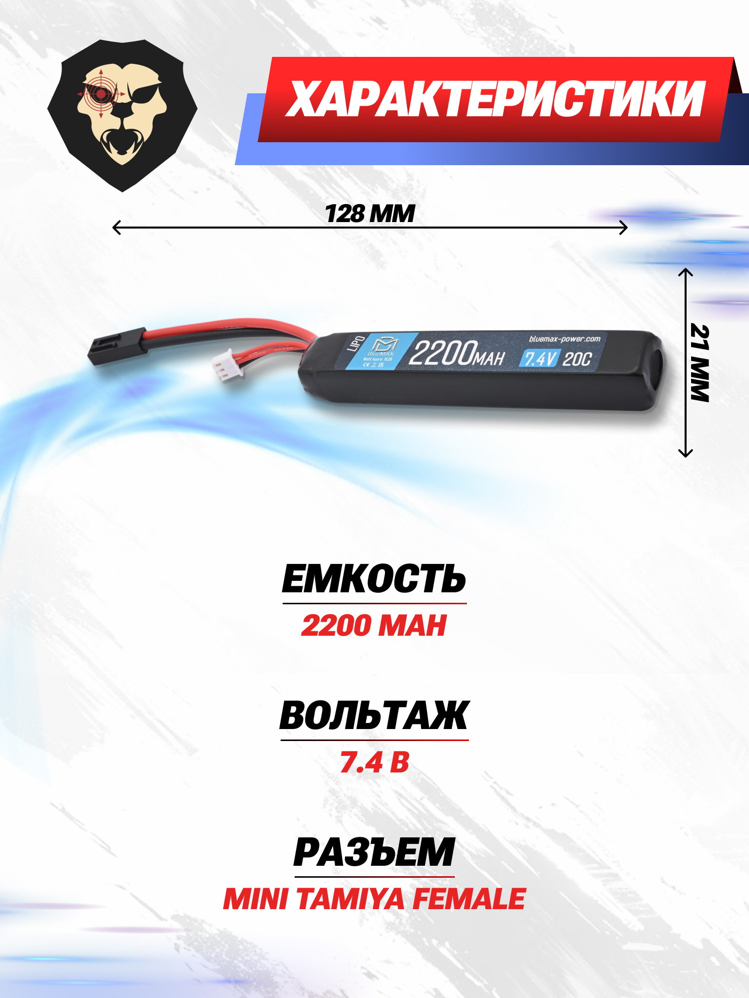 Страйкбольный аккумулятор БлюМакс основан на ячейках Li-Po, суммарная вместимость которых составляет 2200 мАч. Указанной емкости предостаточно для продолжительной стрельбы из автоматических карабинов. В свою очередь показатель токоотдачи находится на уровне 15C.