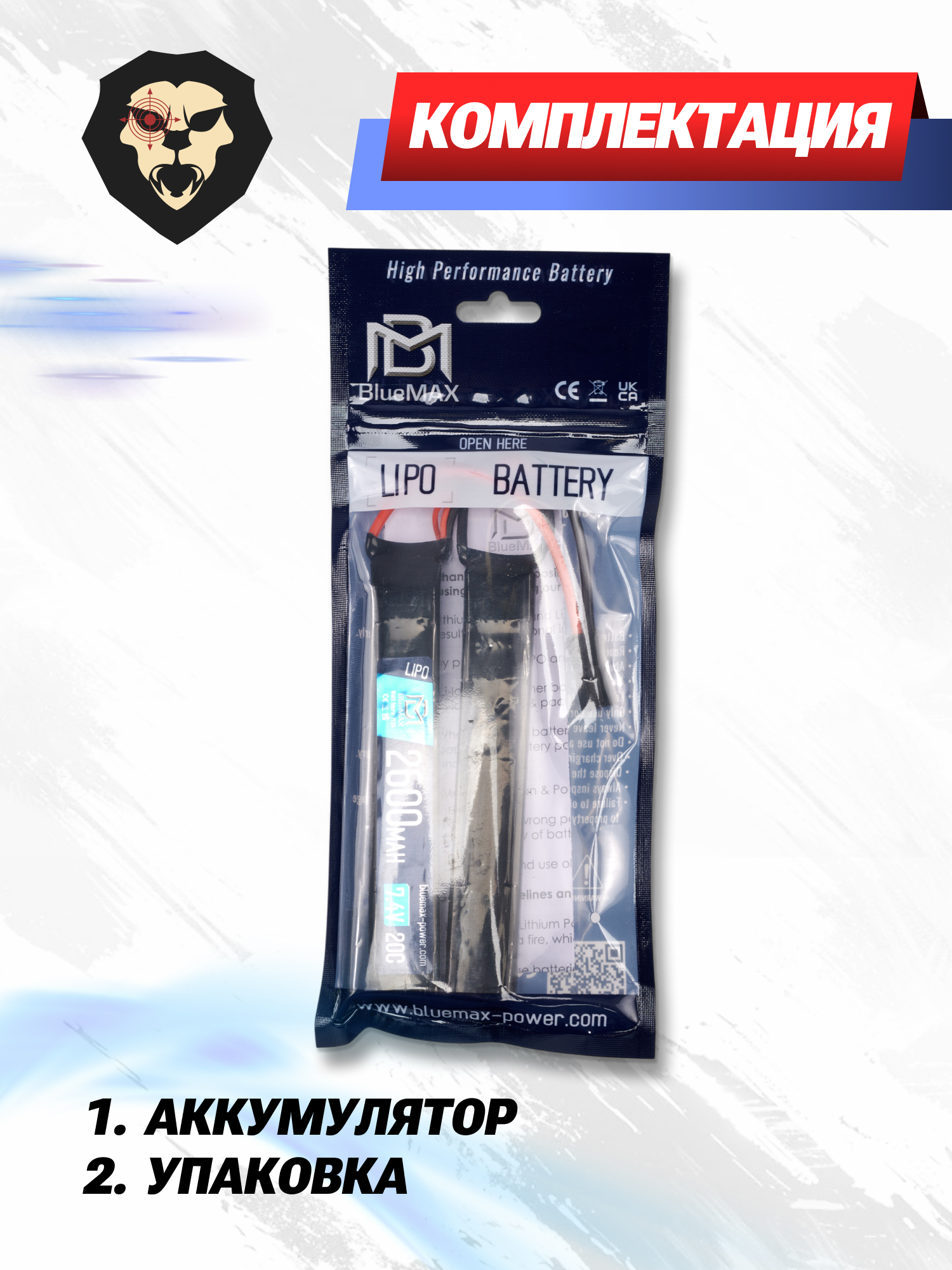 Рассматриваемая модель BlueMax выполнена в формате литий-полимерного источника питания с номинальной мощностью в 7.4 вольта, а также объемом на 2600 миллиампер в час. Такие показатели допускают продолжительное время использования оружия на одном заряде, соответственно, пользователю не придется отвлекаться на замену АКБ или пополнение энергии посредством комплектного кабеля.