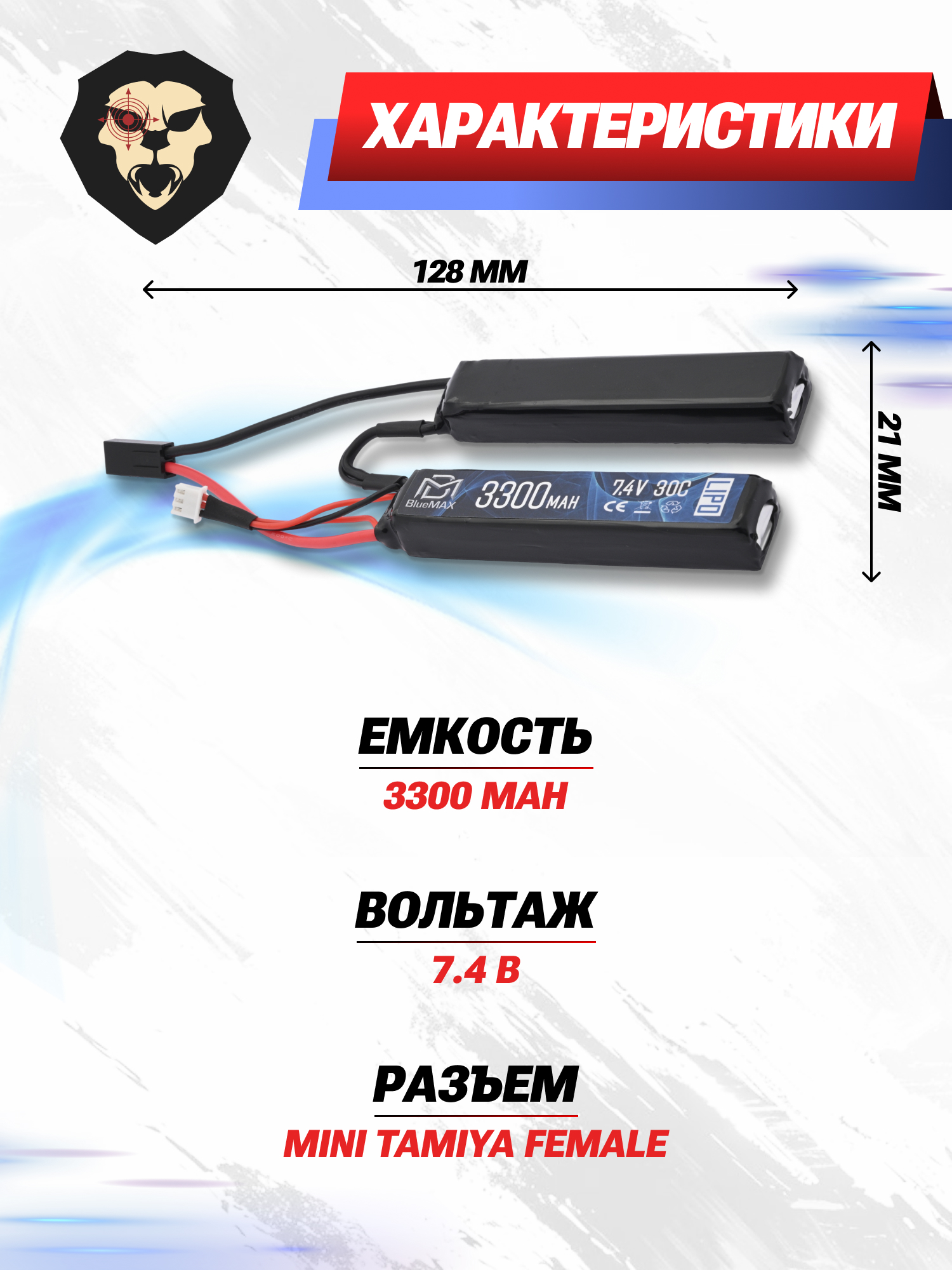 Благодаря литий-полимерному составу, стрелок получит номинальную мощность 7.4 вольта, этого показателя будет хватать для большинства пневматики. Объем у аккумулятора равен 3300 миллиампер часов, такой параметр позволит использовать АКБ продолжительное время и не прибегать к использованию зарядной станции.