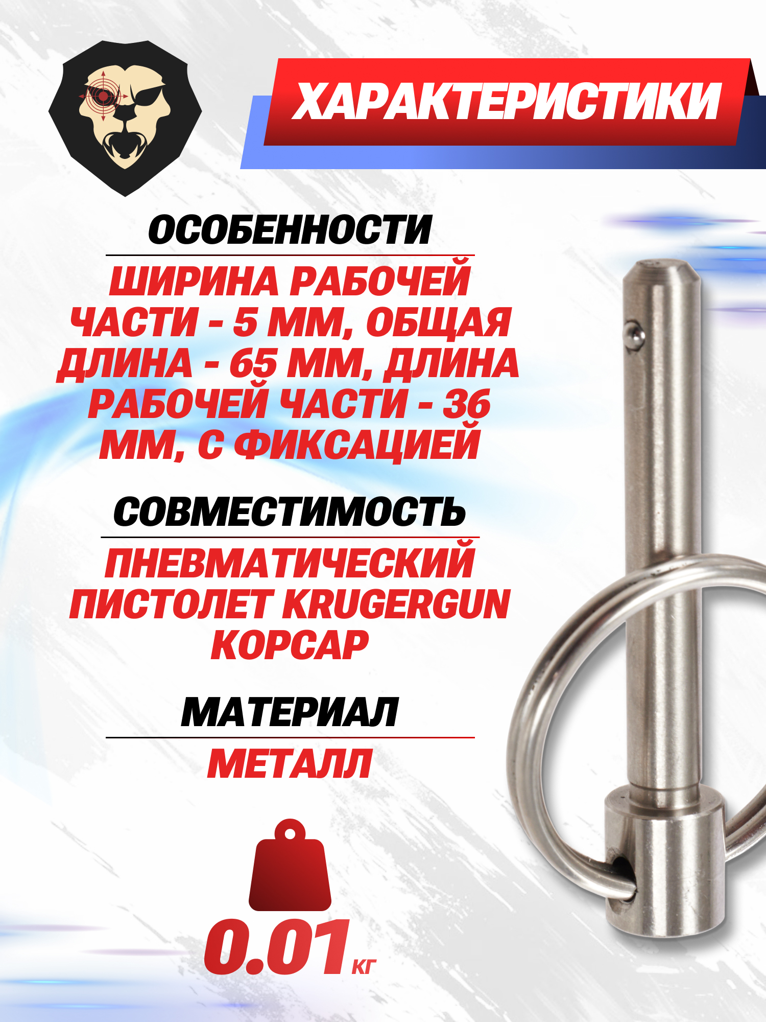 Штифт Зарк Армс вытачивается из прочного металла серебристого оттенка. Ширина наконечника соответствует штатной детали 0.5 см, ввиду чего доработка не потребуется. Длина рабочей части составляет 36 миллиметров при общем размере изделия - 65 мм.