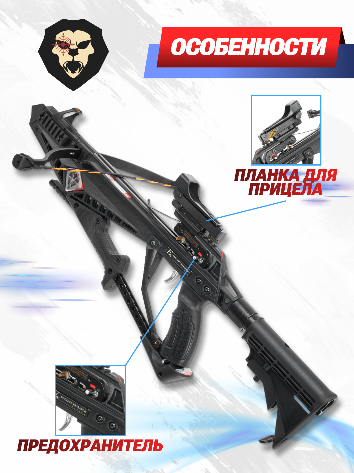 К дополнительным особенностям метательного изделия стоит отнести наличие тактической съемной рукояти. Такой навесной аксессуар используются для комфортного удержания модели при наведении на выбранную цель. Помимо этого на экземпляре имеются четыре планки Weaver на 22 миллиметра для установки всевозможного оборудования, к примеру, стрелок сможет зафиксировать на верхней рельсовой системе комплектный коллиматор, а на нижнюю направляющую смонтировать сошки, фонарь или ЛЦУ.