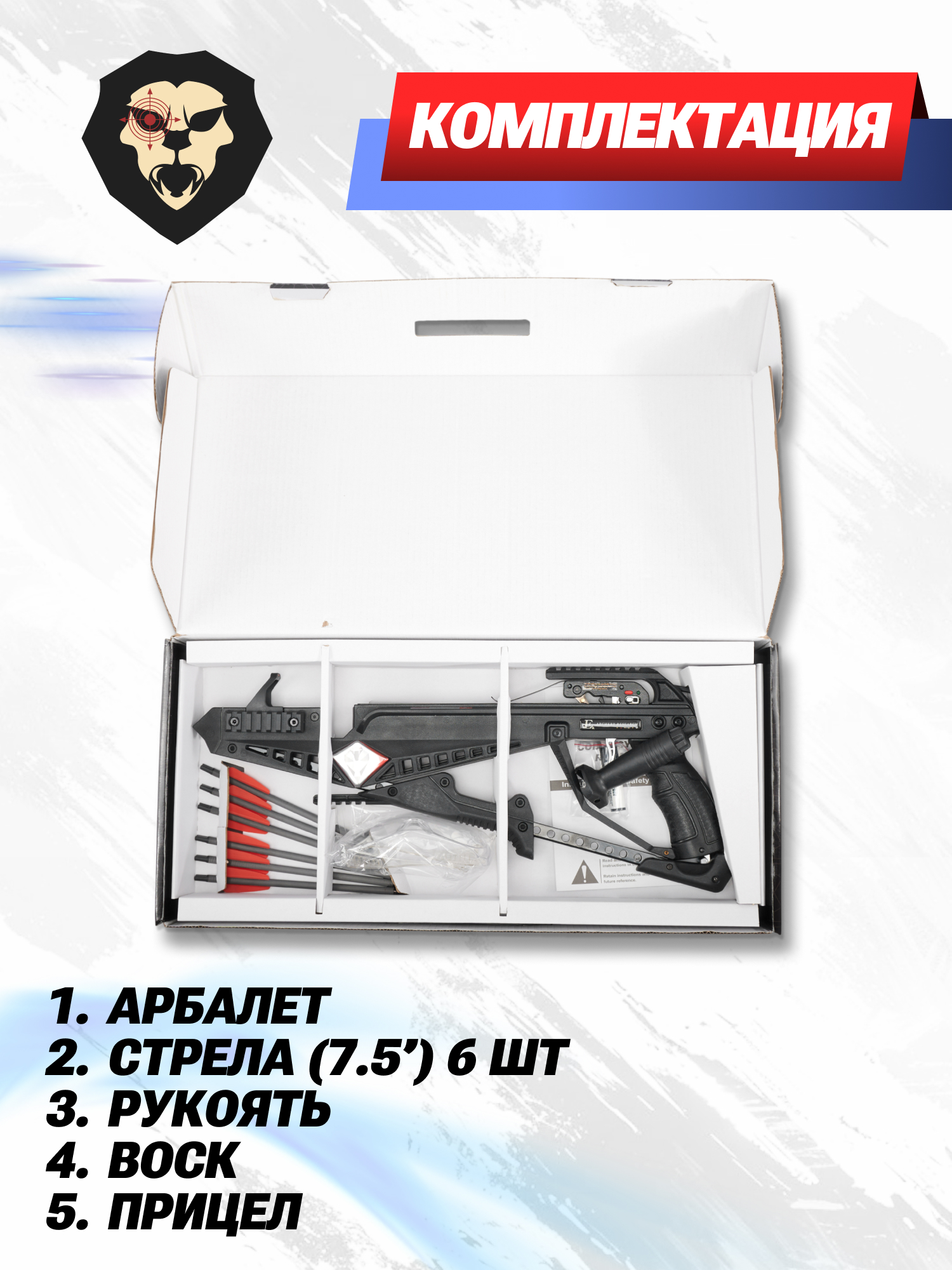 | Комплектация | Арбалет-пистолет, стрела 7.5 дюймов - 6 шт, рукоять, воск, защитные очки, коллиматор, ремень, упаковка |