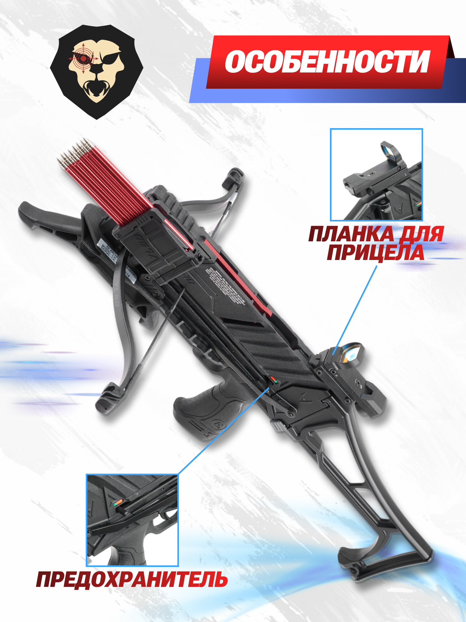 Эргономичная пистолетная рукоять способствует удобному удержанию арбалета - в передней части также присутствует дополнительный упор для ладони, предустановленный с завода. Из особенностей стоит выделить наличие большого количества планок Пикатинни под размещение дополнительного оборудования, будь то ЛЦУ или фонарь. Кроме прочего, в наборе идет коллиматорный прицел открытого типа, который упрощает наведение на мишень.