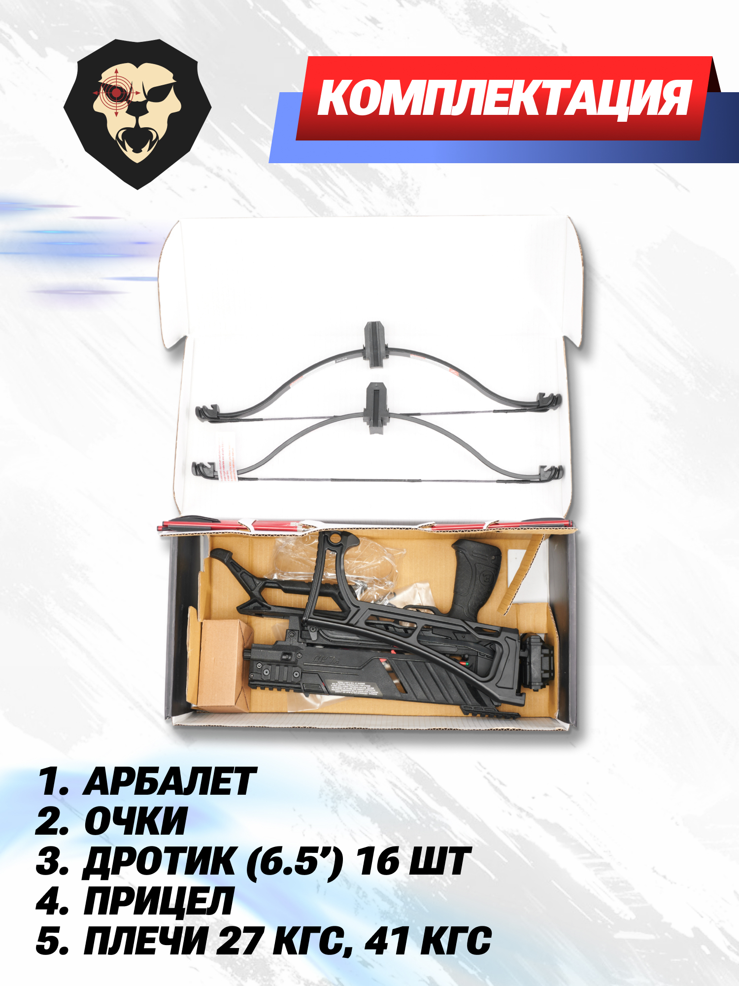 | Комплектация | Арбалет, очки, дротик 6.5 дюймов - 16 шт, клипса, коллиматорный прицел, плечи 27 Кгс, плечи 41 Кгс, воск, стрингер, запасная тетива, дополнительный хвостовик - 16 шт, запасные законцовки - 2 шт, ЗИП, упаковка |