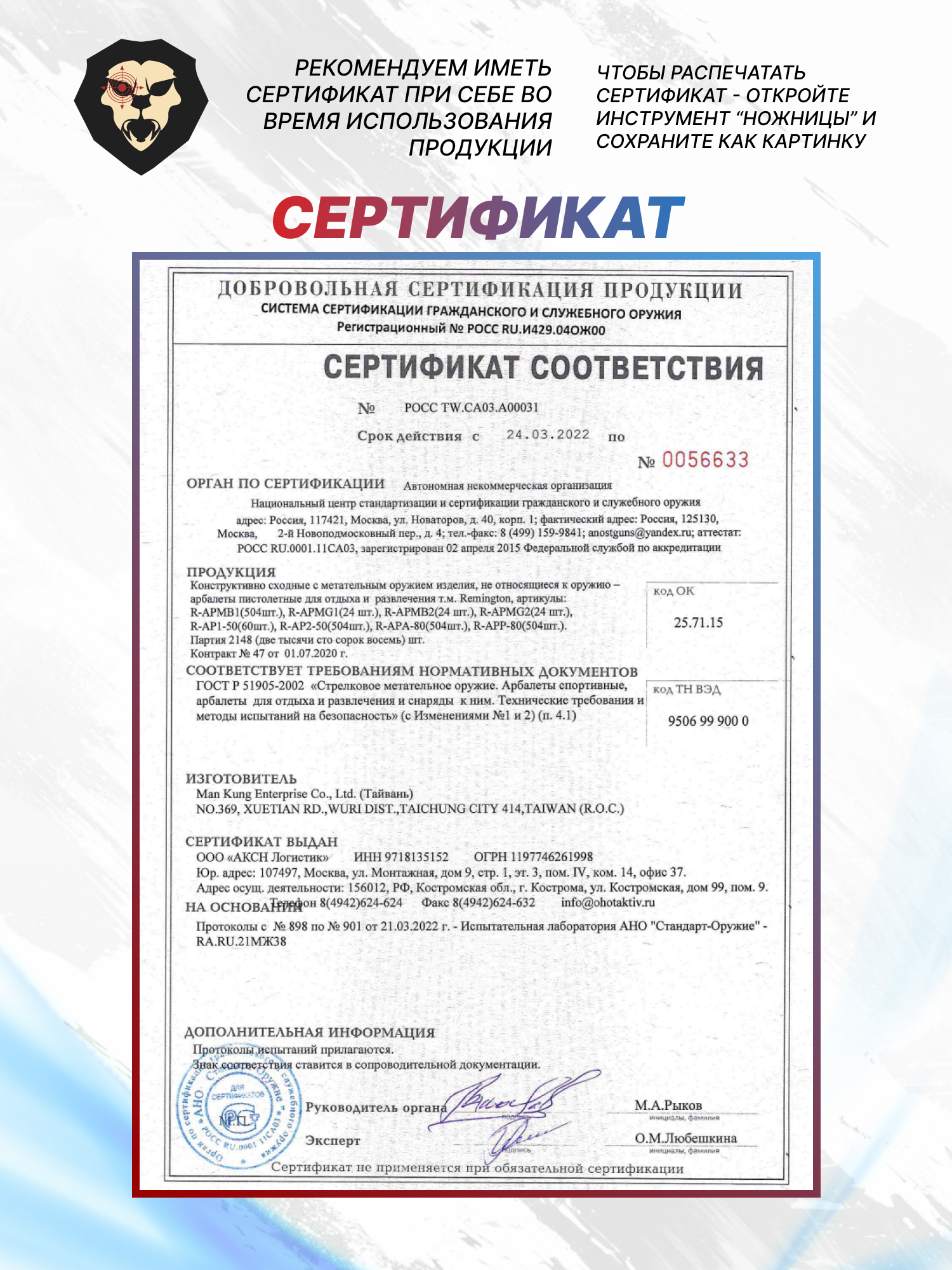 | Комплектация | Арбалет-пистолет — 1 шт, стрелы — 3 шт, краткая документация, копия сертификата (по запросу покупателя), упаковка |