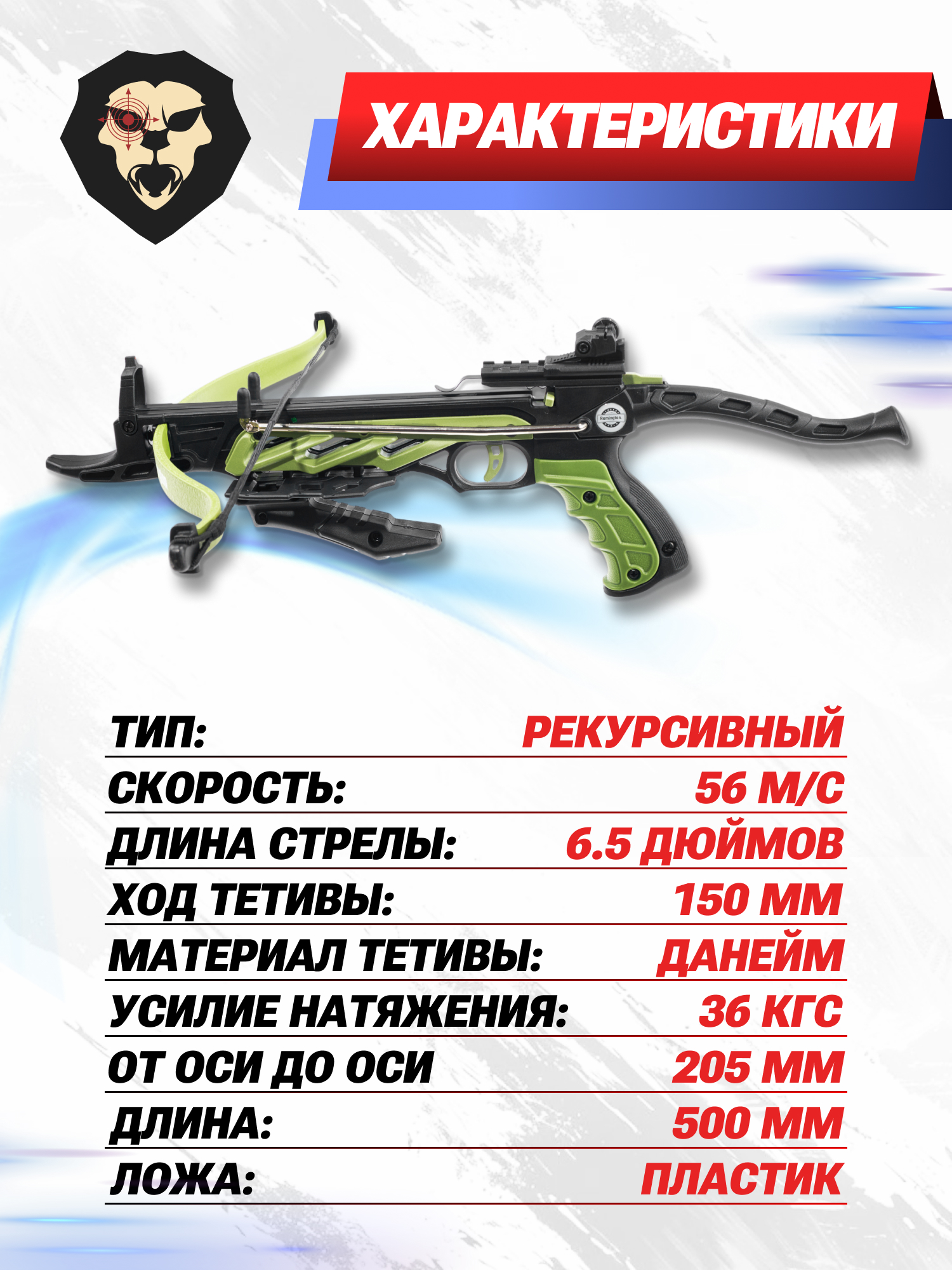 Информация о товаре "Арбалет - пистолет Remington Mist (зеленый)" носит ознакомительный характер, и не является публичной офертой, определяемой положениями Статьи 437 Гражданского кодекса Российской Федерации, характеристики, внешний вид, цвет и комплектация могут быть изменены производителем без уведомления.
