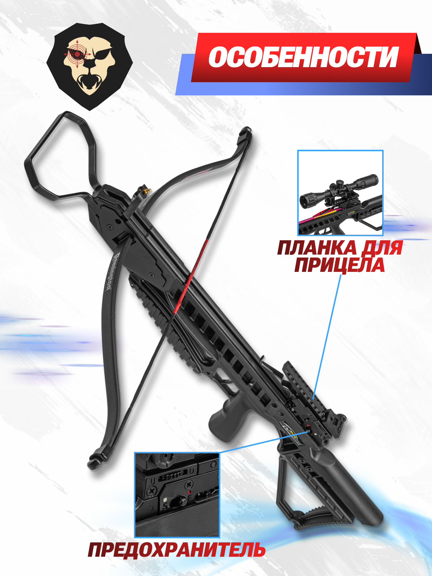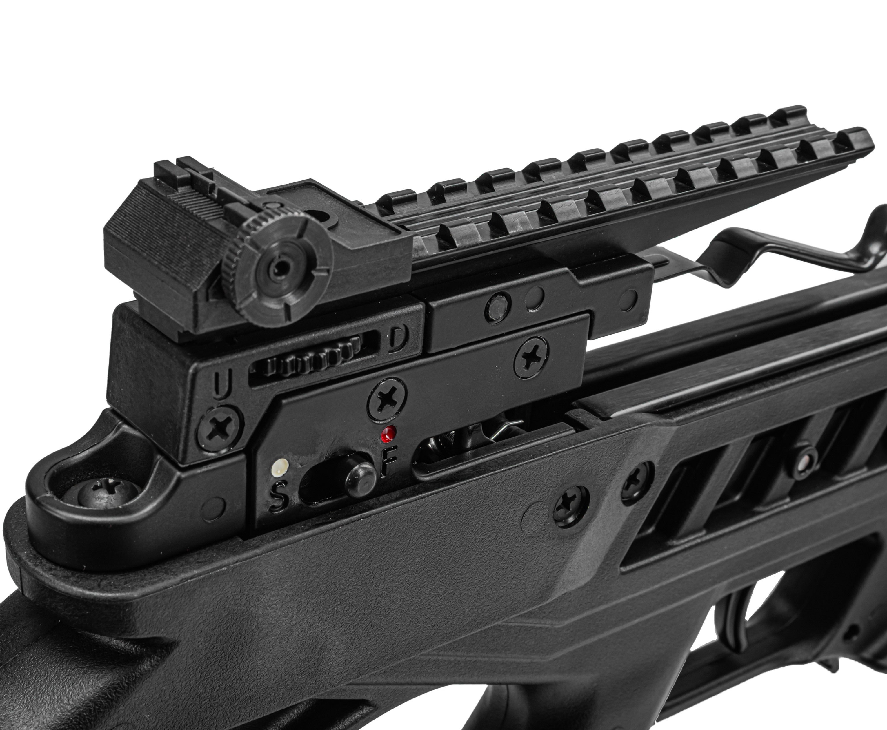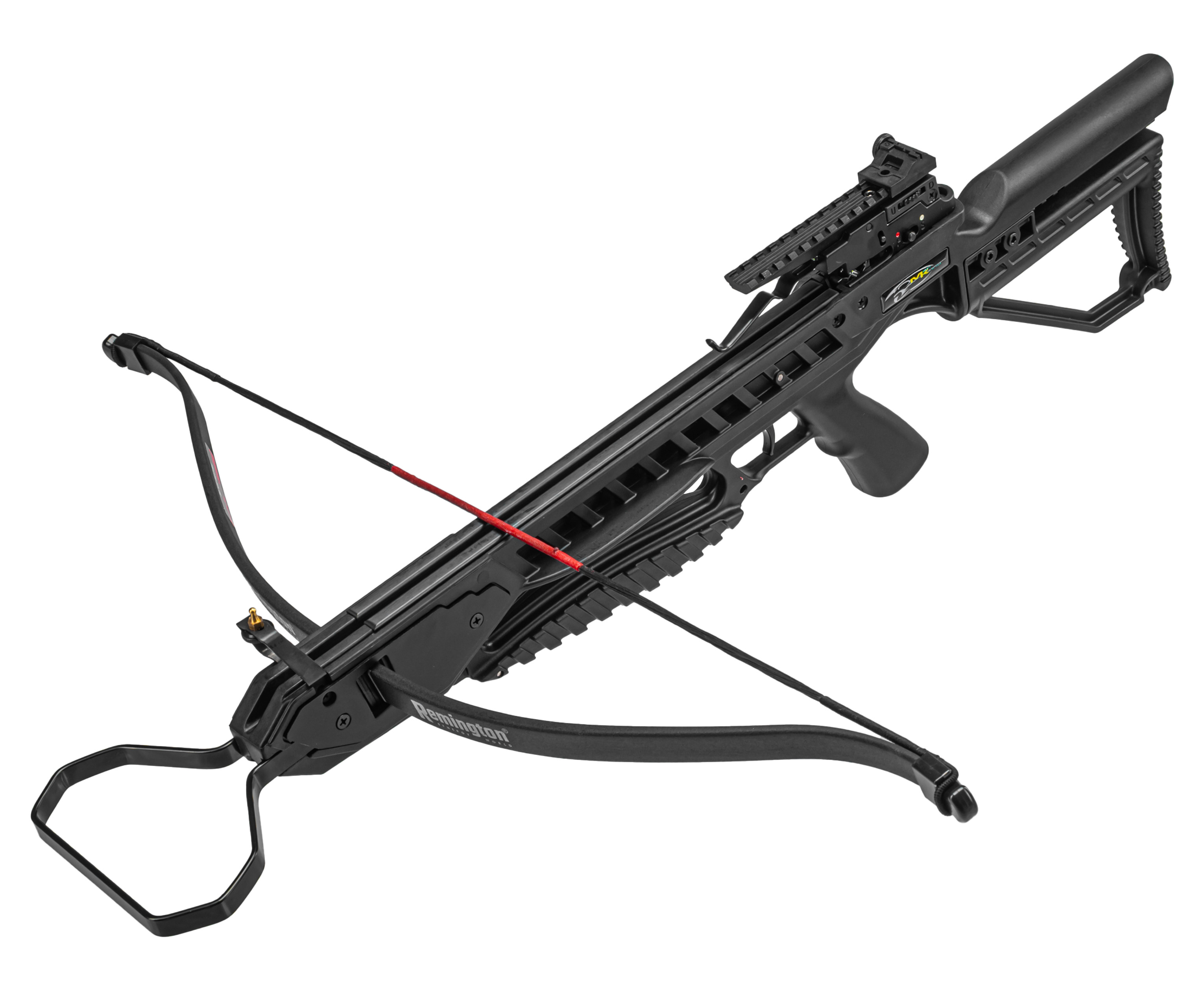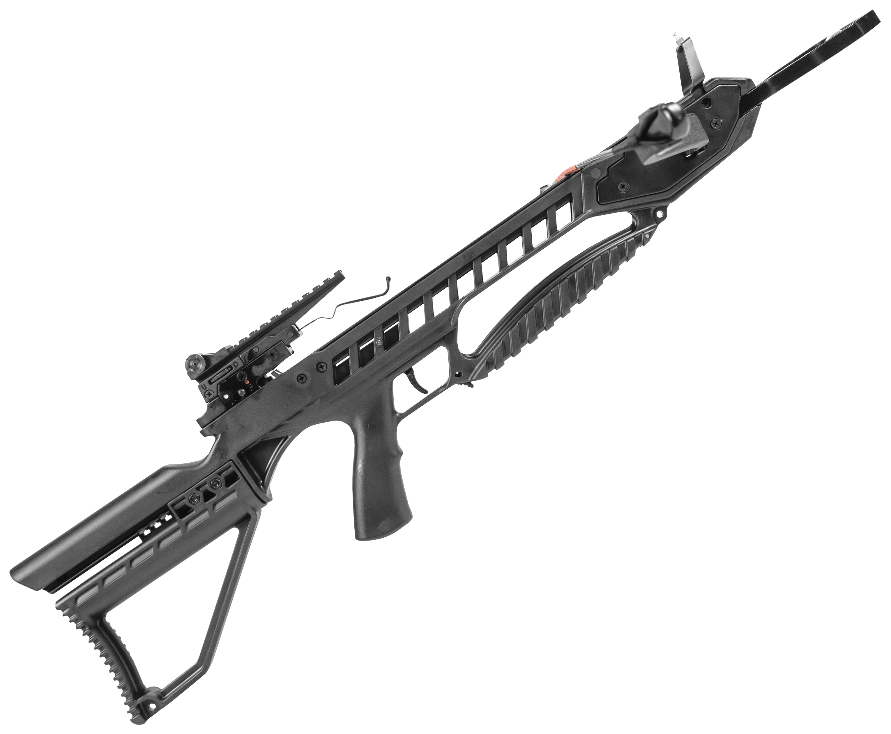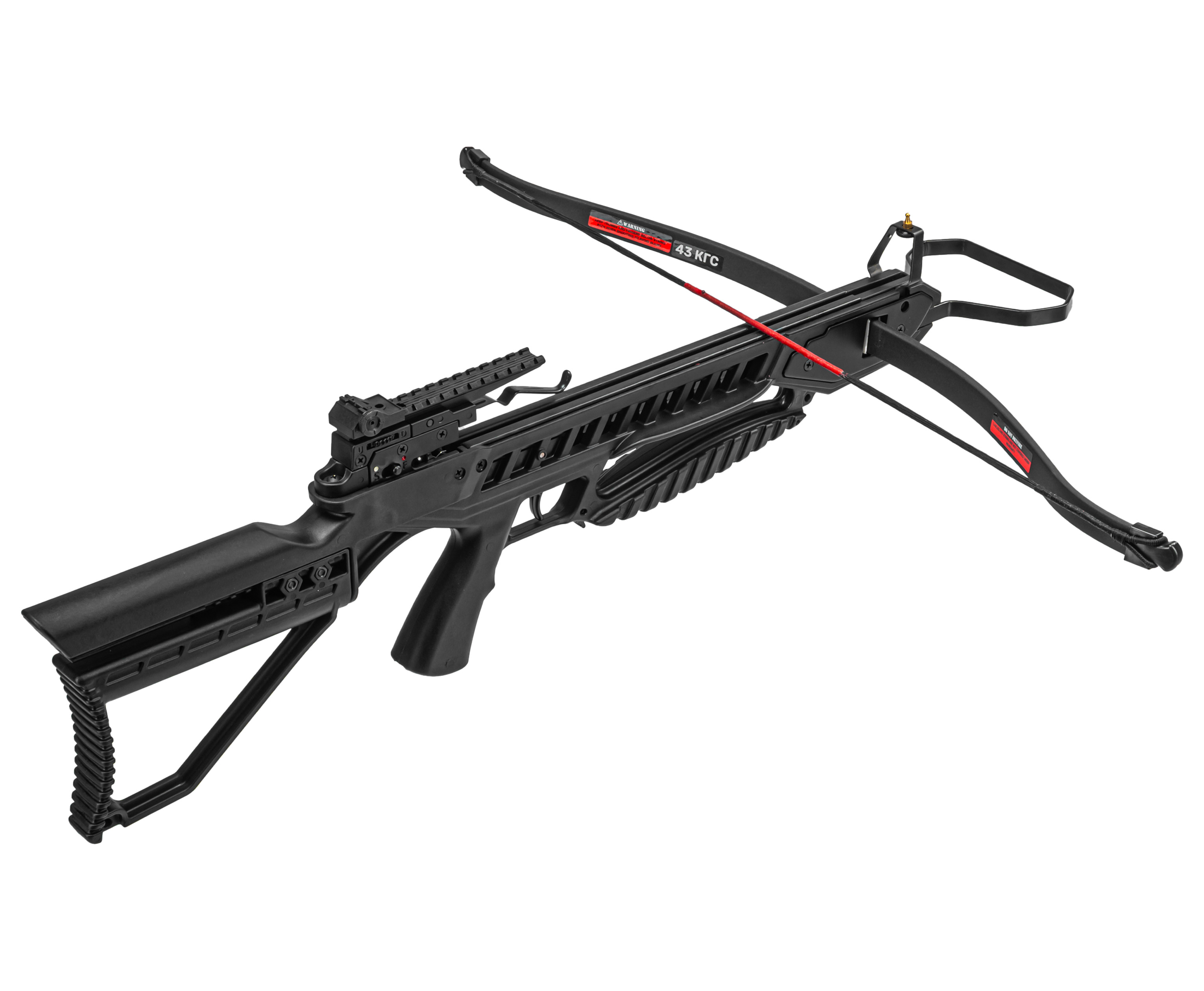 За передачу энергии стреле при распрямлении плеч отвечает тетива из износостойкого данейма - ее рабочий ход составляет 267 мм. Для комфортного взведения арбалет упирается в землю, после чего передняя скоба зажимается ногой - это создает дополнительный упор, упрощающий процесс. При натягивании трос фиксируется в основании коробки предохранительным зацепом - поместив стрелу в паз ствола, можно снять блокировку и нажать на спуск.
