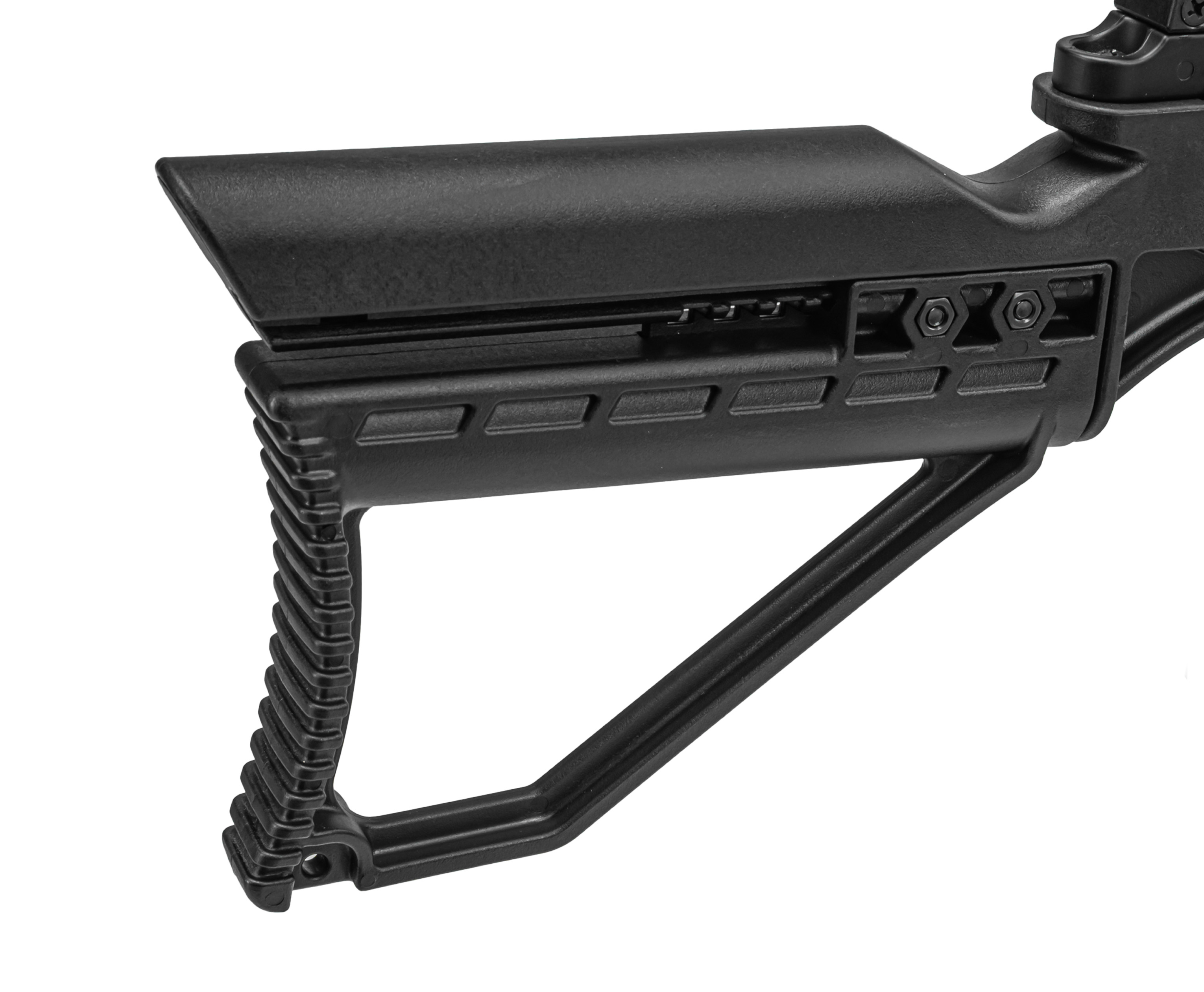 С учетом приятной стоимости экземпляр имеет прочный каркас, представленный в виде эргономичной ложи из композитного материала. При создании задействуется преимущественно полимер и алюминий, что в совокупности обуславливает легкий вес конструкции, не превышающий 2.1 кг. Оружие комфортно в работе - удобству удержания способствует пистолетная рукоять и ребристая накладка цевья, причем последняя также задействуется при переноске.