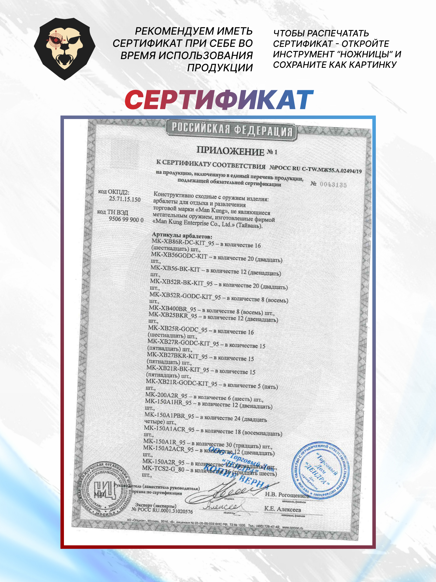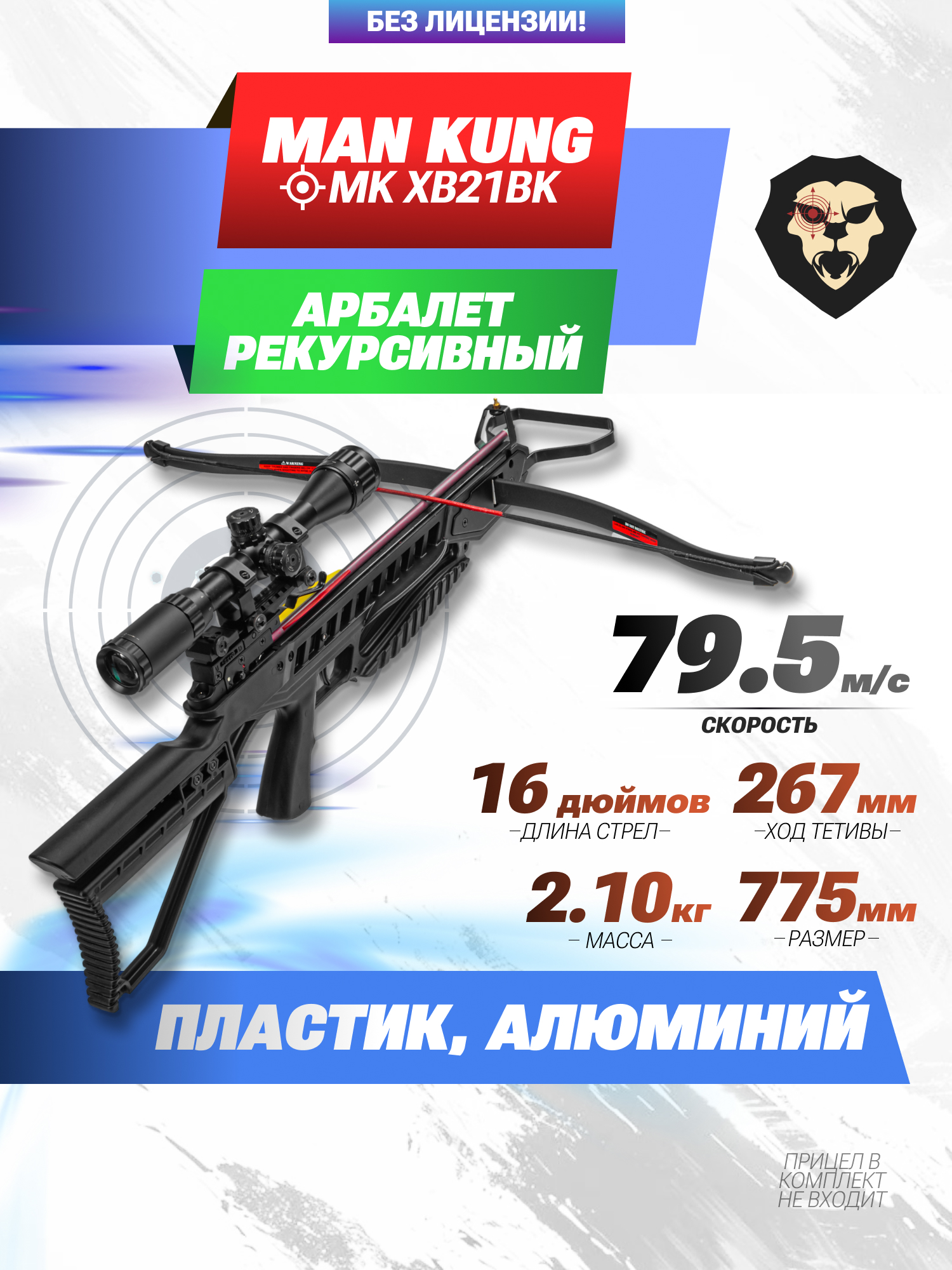 Размера алюминиевого ствола хватает для заряжания полноразмерных стрел длиной 16 дюймов. Боеприпасы в количестве двух штук идут в комплекте, ввиду чего приступить к практике можно сразу после покупки. При этом, чтобы завладеть метательным оружием, не потребуется лицензия - арбалет рекурсивный Man Kung XB21 в состоянии «из коробки» имеет разрешенное усилие натяжение до 43 кгс и доступен каждому желающему старше восемнадцати лет.