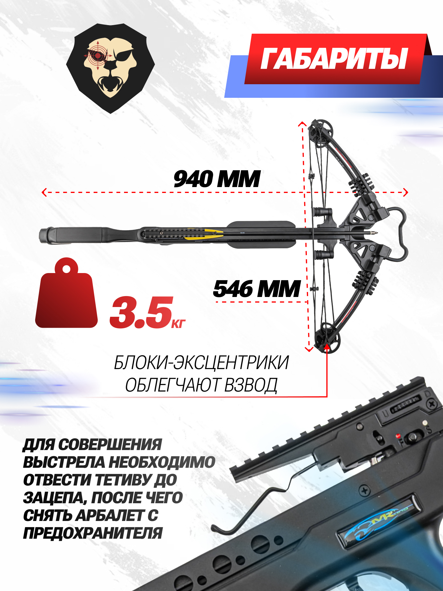 Ствольная часть оптимизирована для работы с полноразмерными стрелами 20 и 22 дюйма и по желанию может дополняться ножным упором, входящим в набор. Базовая комплектация также включает в себя 2 снаряда. Во время взведения тетива из износостойкого данейма зажимается фиксатором коробки с предохранителем - после укладки боеприпаса в направляющую перед выстрелом нужно предварительно снять блокировку триггера.