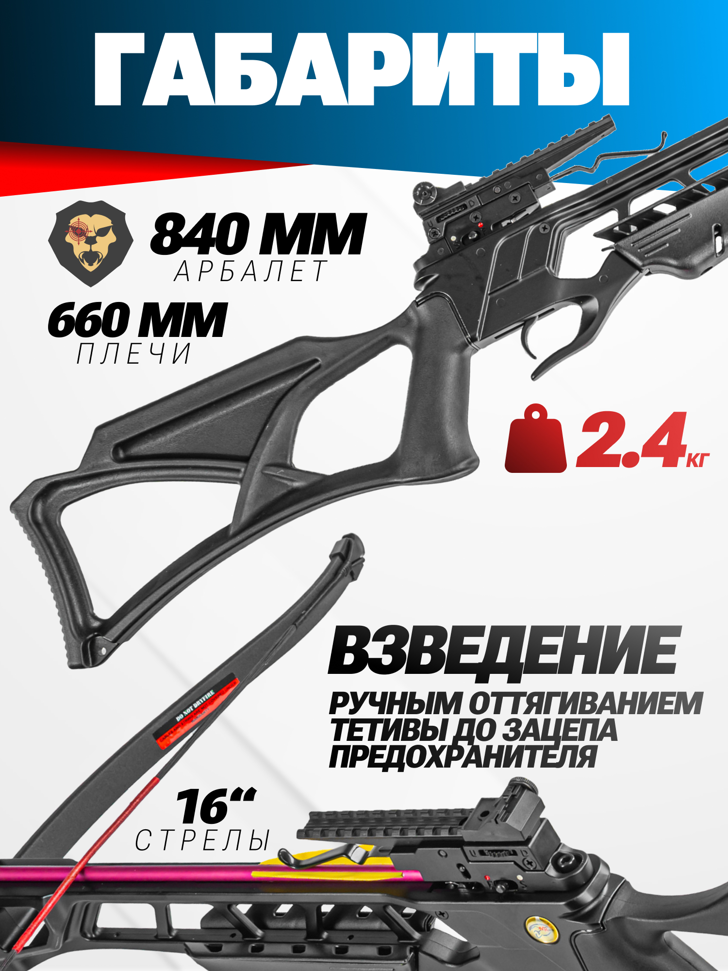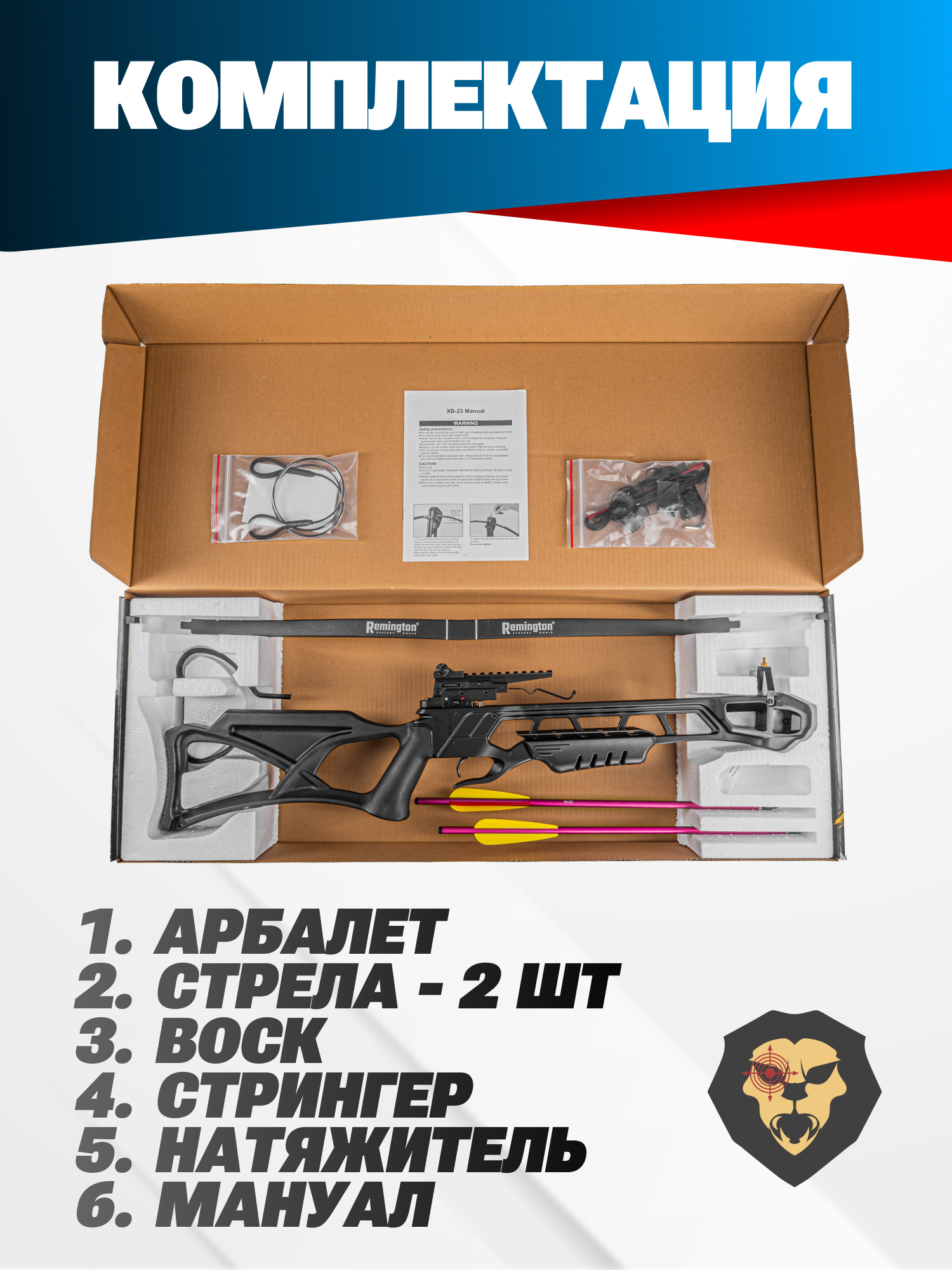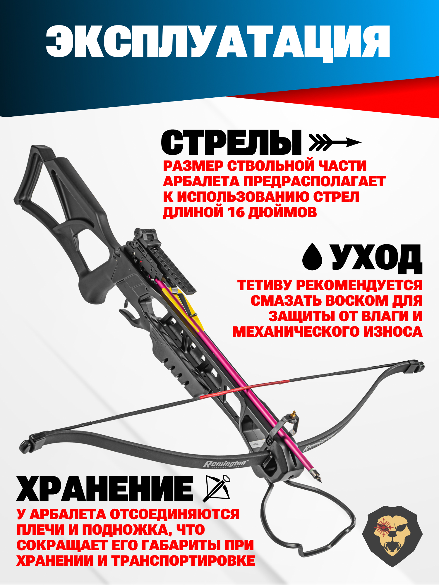 | Комплектация | Арбалет, стрела - 2 шт, воск, стрингер, натяжитель, упаковка |