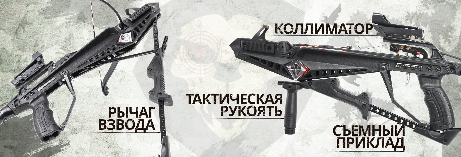 Все образцы получили съемные компактные плечи и выделяются простой сборкой - достаточно совместить дуги с направляющей ствола и закрутить винты. Арбалеты пистолетного типа из-за своих размеров заточены под использование болтов 6.5". Стрельбу можно вести с одной руки, при этом усилия предостаточно для развития снарядами скорости 45-55 метров в секунду.