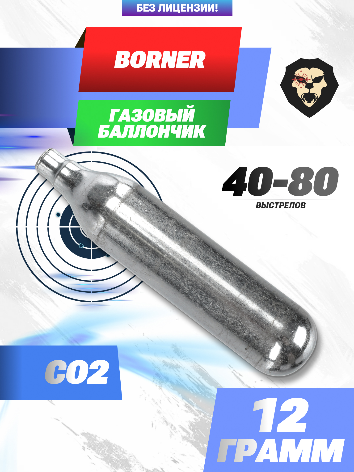 Borner баллончики CO2 выполнены из металла и рассчитаны на внутреннее давление паров углекислоты в среднем до 60-и Атмосфер. Эксплуатационный свойства сжиженного газа рассчитаны на температуру окружающей среды не ниже 5 градусов цельсия, вследствие чего не рекомендуется использовать баллон в зимний период.