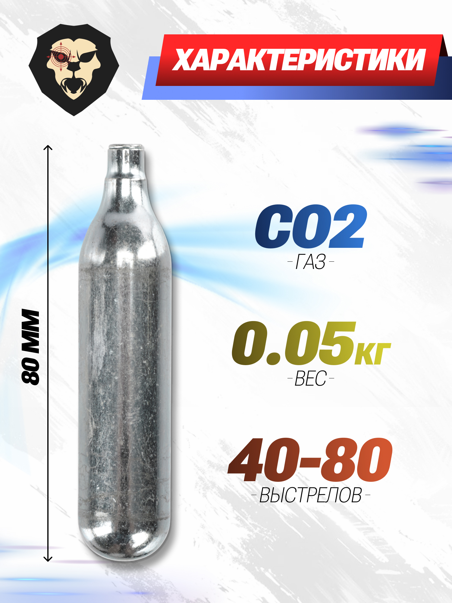 Емкости изготавливаются из прочного металла, ввиду чего выдерживают давление в 60 Атм. Каждый баллон газа CO2 рассчитан на объем 12 грамм - подобный формат распространен в пневматических пистолетах и винтовках. В последнем случае часто задействуются два резервуара единовременно.