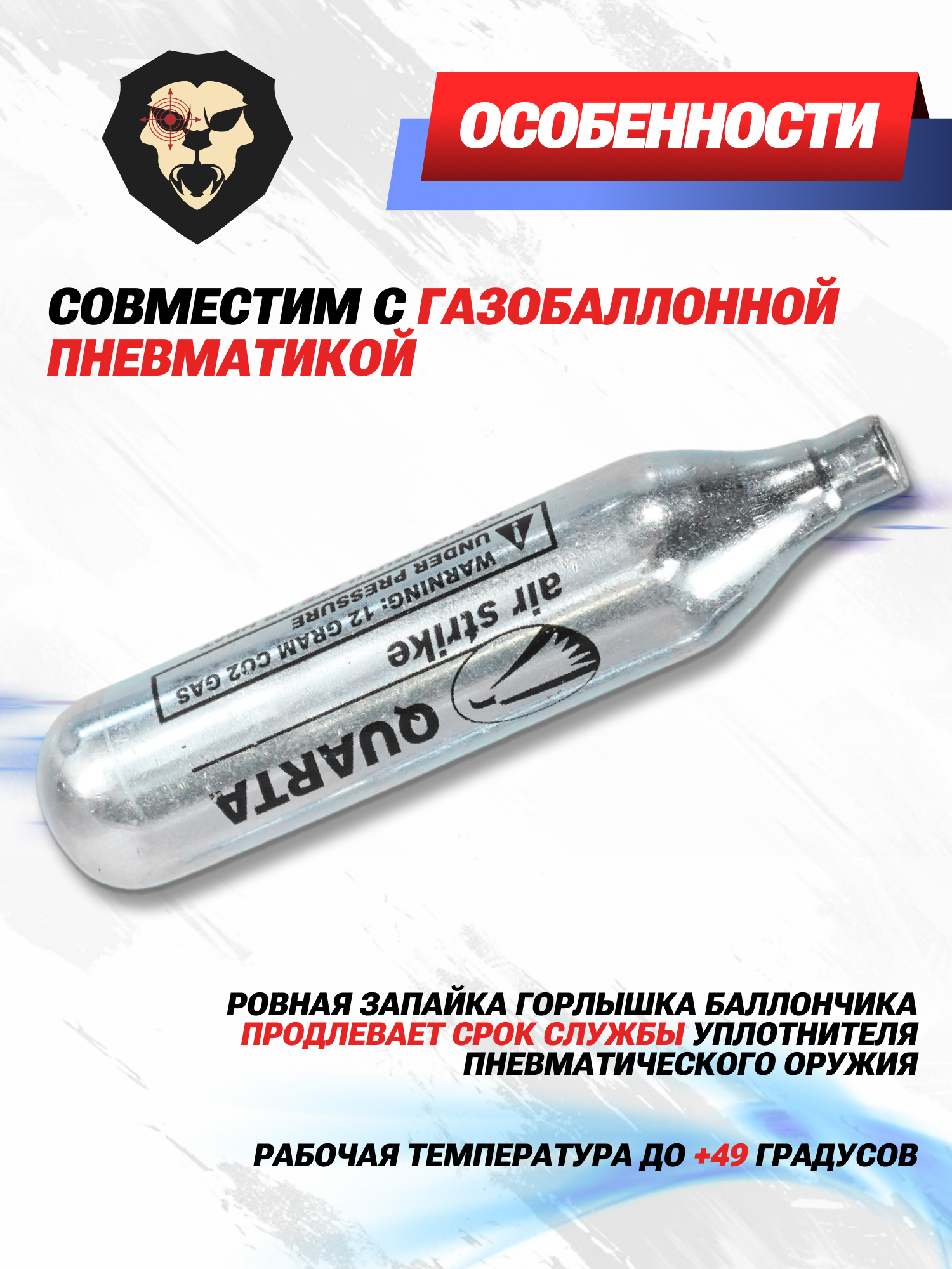 Важно отметить, что каждый газовый баллон CO2 12 гр в комплекте рекомендуется применять при температуре не ниже +5 градусов для ведения эффективной стрельбы. Установку нужно выполнять перед самим использованием пневматического оружия - представленные емкости от Quarta размещаются в специально отведенном для этого узле, например, в элементе боепитания пистолета.