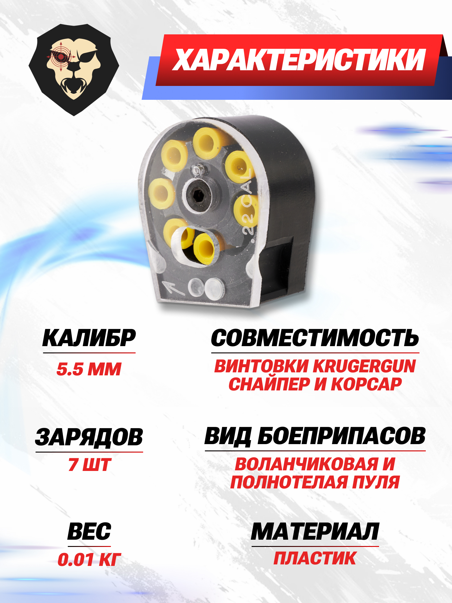 Мародер мини в калибре 5.5 мм по совместимости подходит для пневматических винтовок KrugerGun Sniper и Korsar. Вмещает магазин 7 снарядов с максимальной длиной 11.5 миллиметров. Корпус пластикового магазина имеет толщину 17.5 миллиметров.