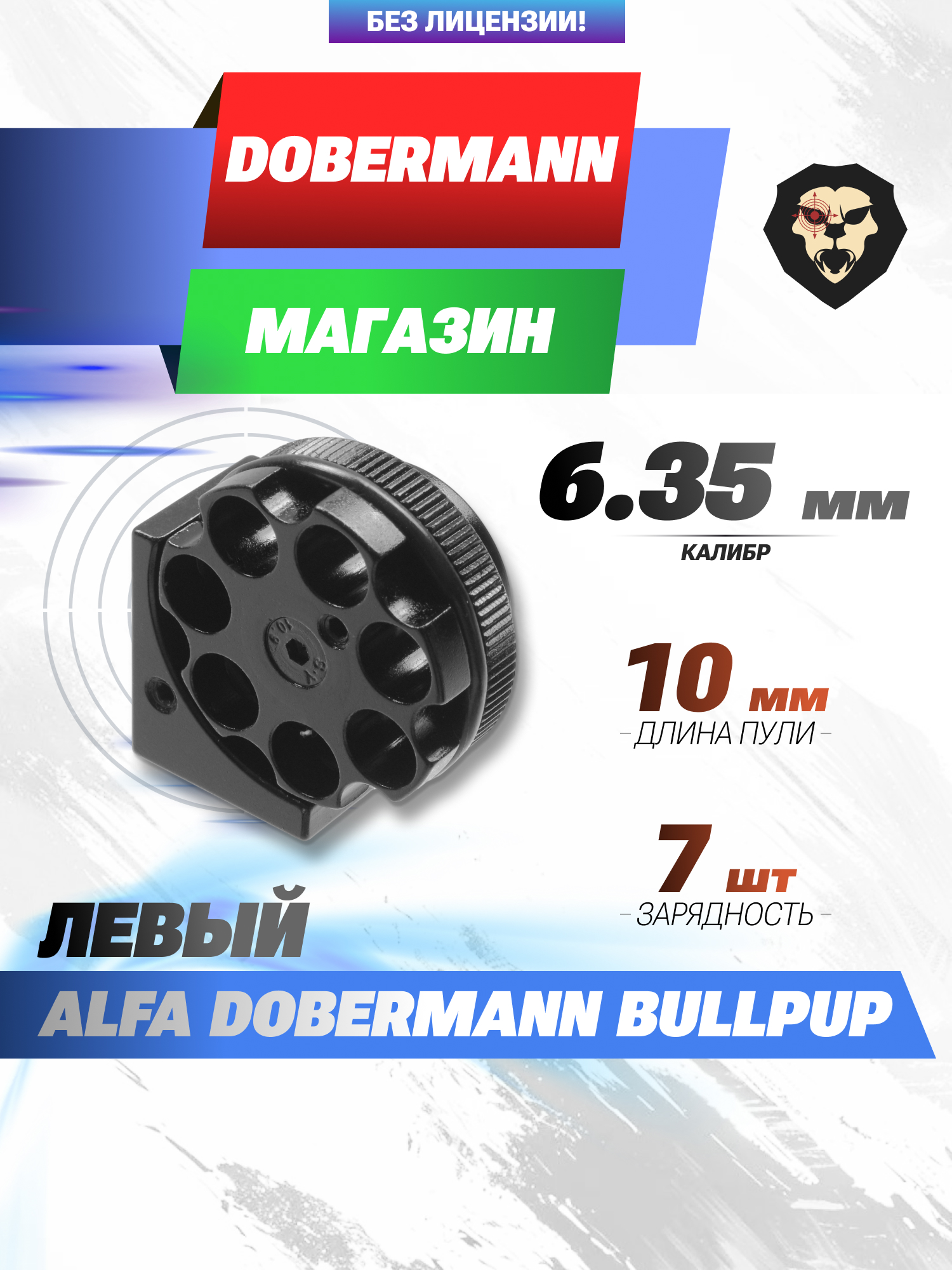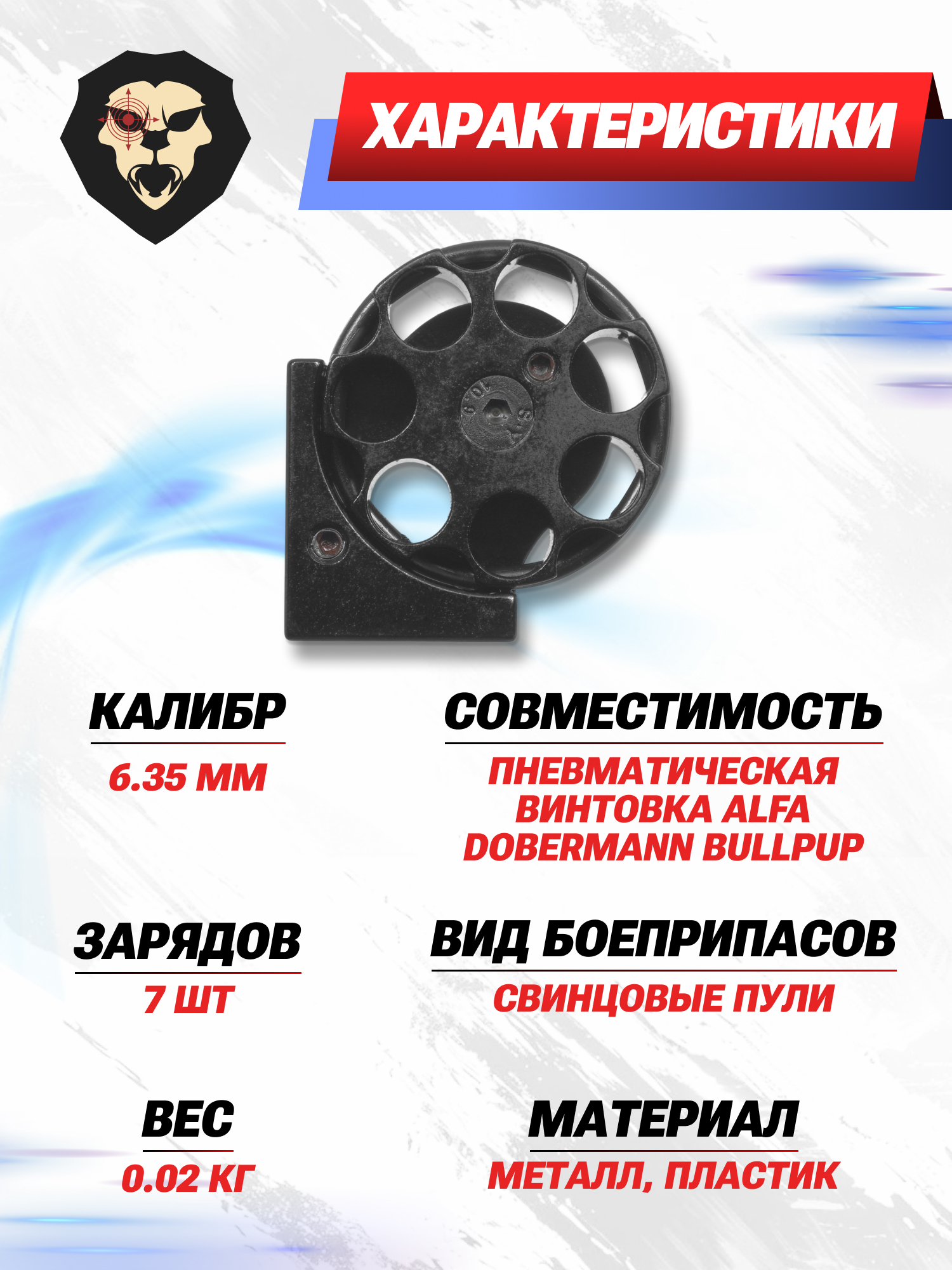 Заявлена совместимость с линейкой винтовок БуллПап Альфа Доберманн в калибре 6.35 мм. Важно отметить открытую конструкцию барабана, исходя из чего стрелок имеет быстрый доступ к каморам и может по усмотрению доснаряжать магазин без его демонтажа. Предусмотрено семь ячеек под боеприпасы с максимальной длиной до одного сантиметра.