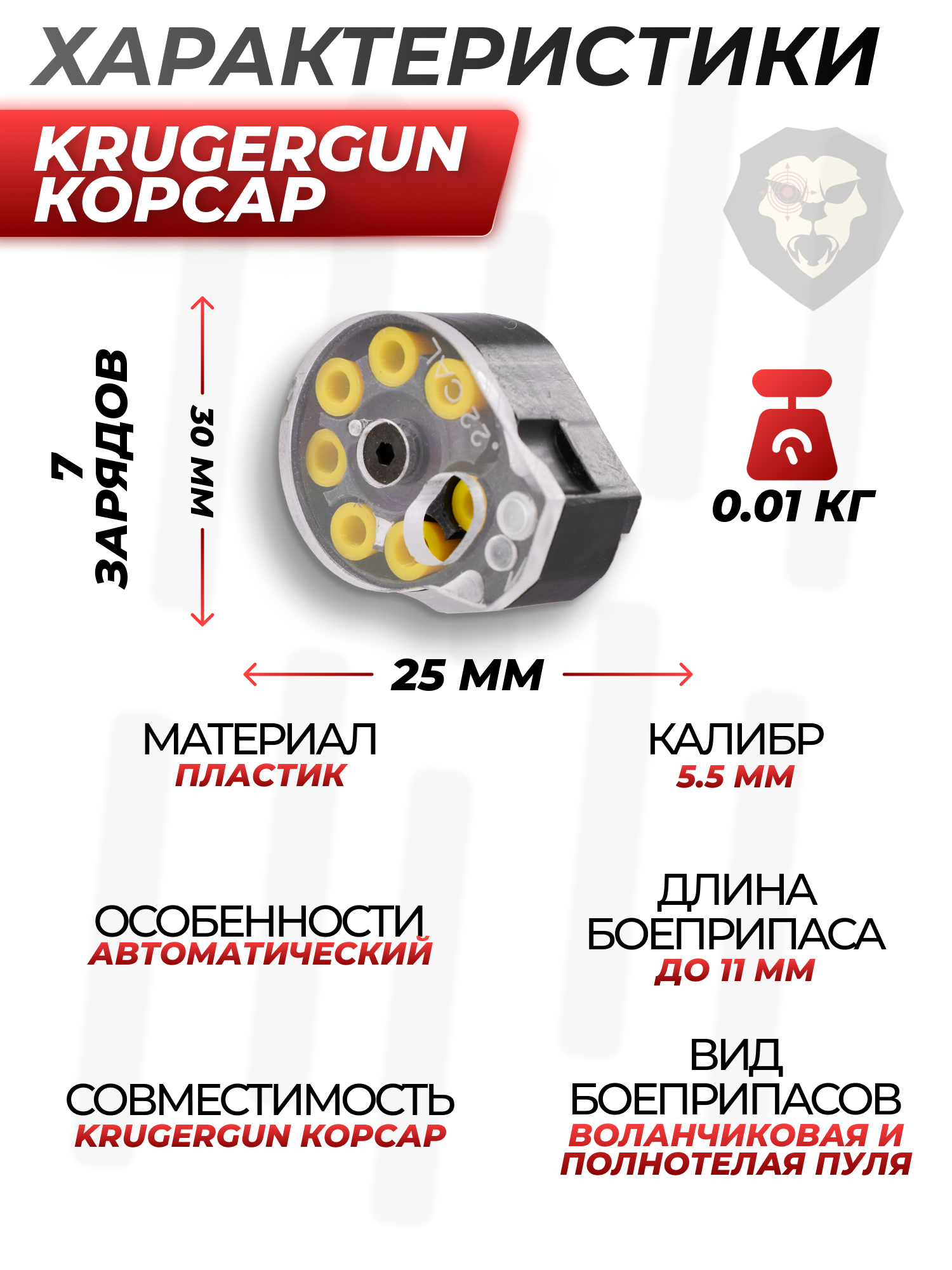 Информация о товаре "Барабанный магазин KrugerGun 5.5 мм Корсар (7 пуль)" носит ознакомительный характер, и не является публичной офертой, определяемой положениями Статьи 437 Гражданского кодекса Российской Федерации, характеристики, внешний вид, цвет и комплектация могут быть изменены производителем без уведомления.