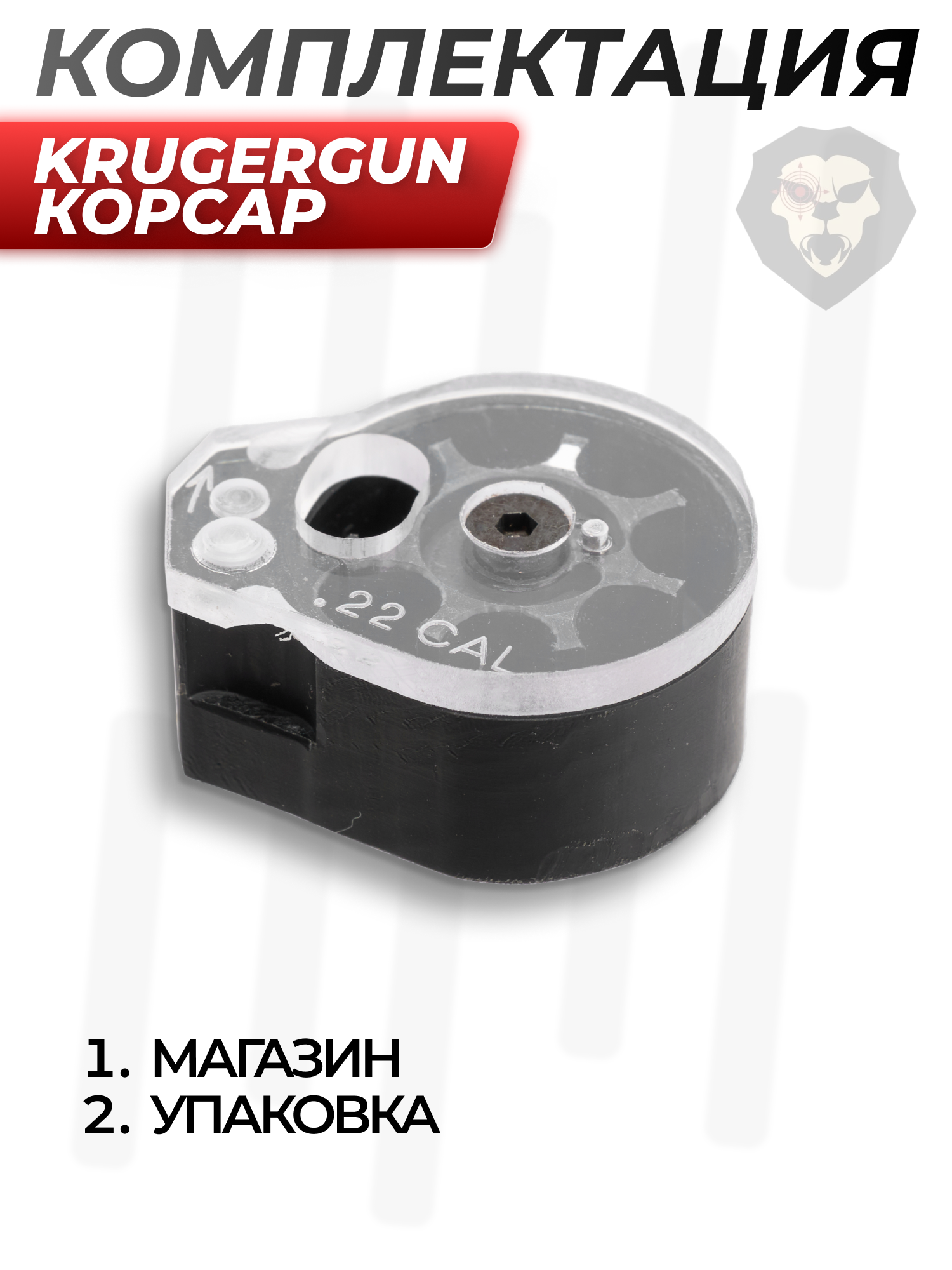 Для пневматики с предварительной накачкой предусмотрено барабанное питание. Крюгер магазин под модели Корсар позволит выпустить 7 пуль, не отвлекаясь на вкладывание заряда в приемник после каждого нажатия на спуск. Также не придется проворачивать клип руками.