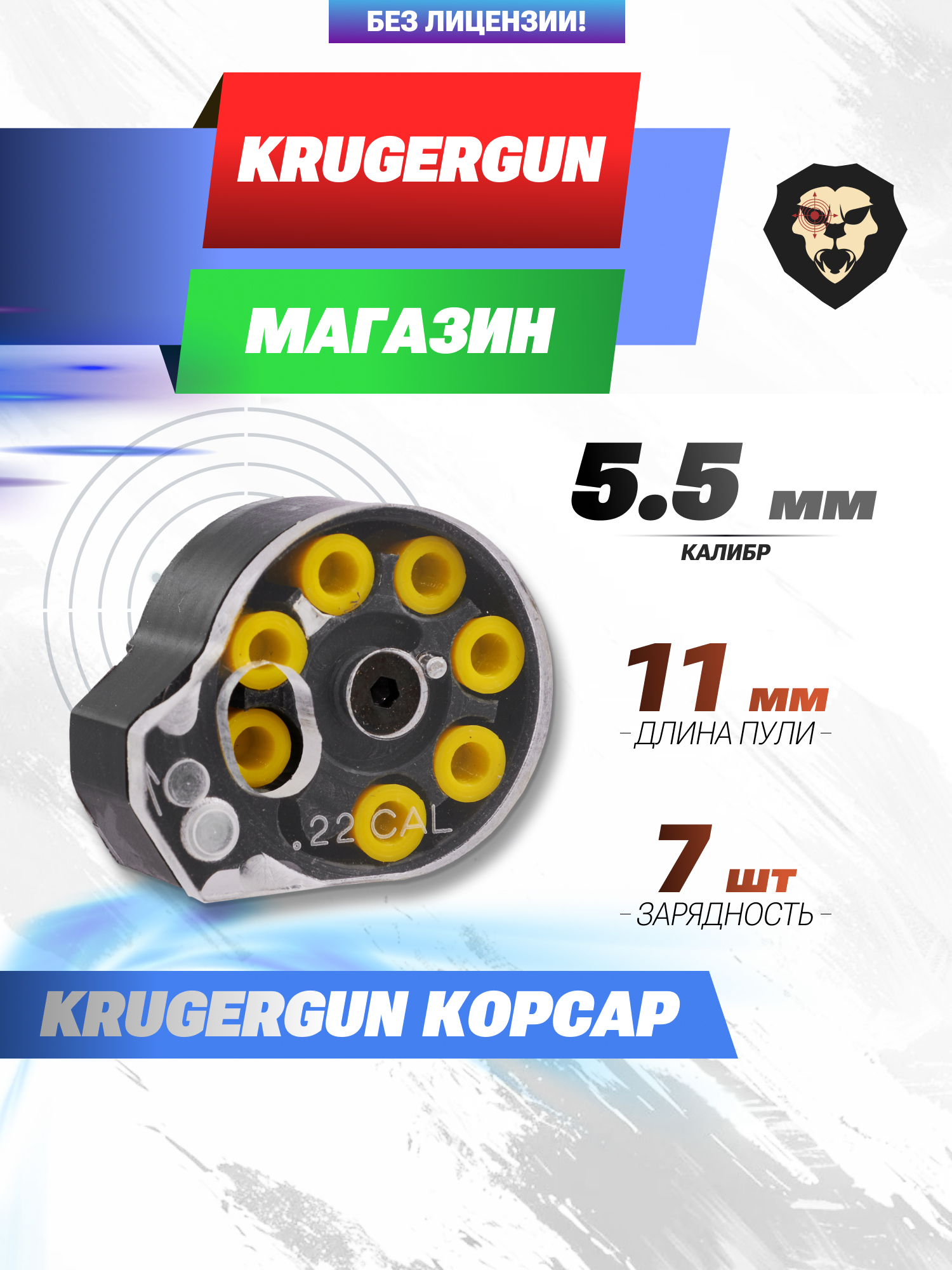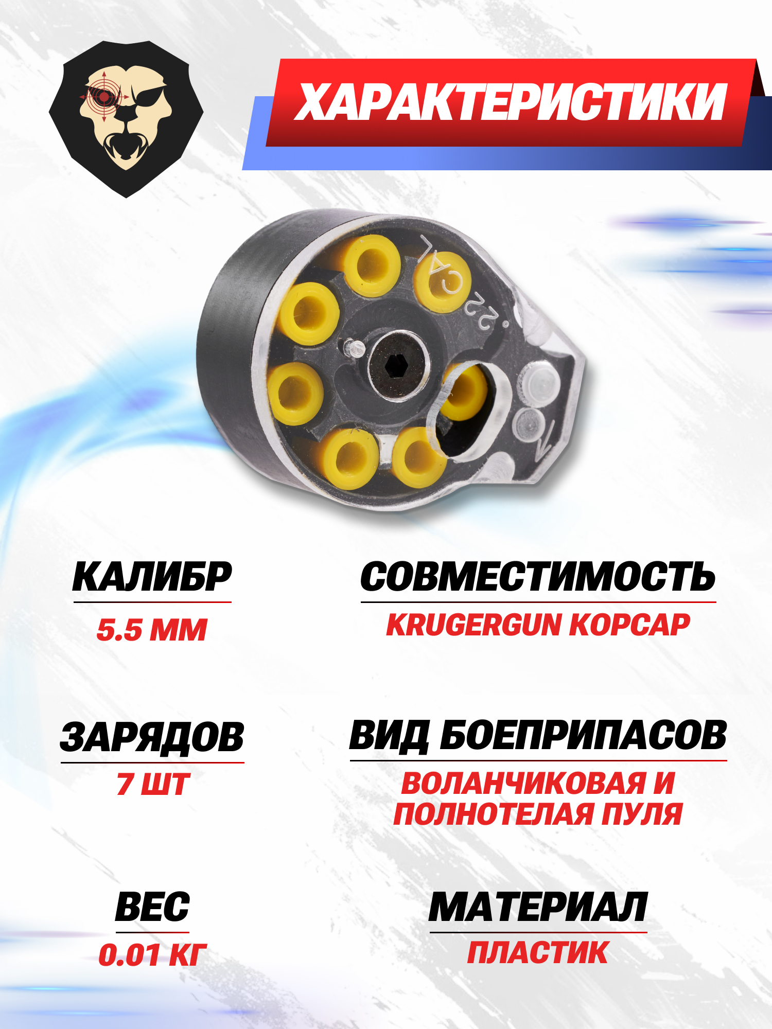 Информация о товаре "Барабанный магазин KrugerGun 5.5 мм Корсар (7 пуль)" носит ознакомительный характер, и не является публичной офертой, определяемой положениями Статьи 437 Гражданского кодекса Российской Федерации, характеристики, внешний вид, цвет и комплектация могут быть изменены производителем без уведомления.