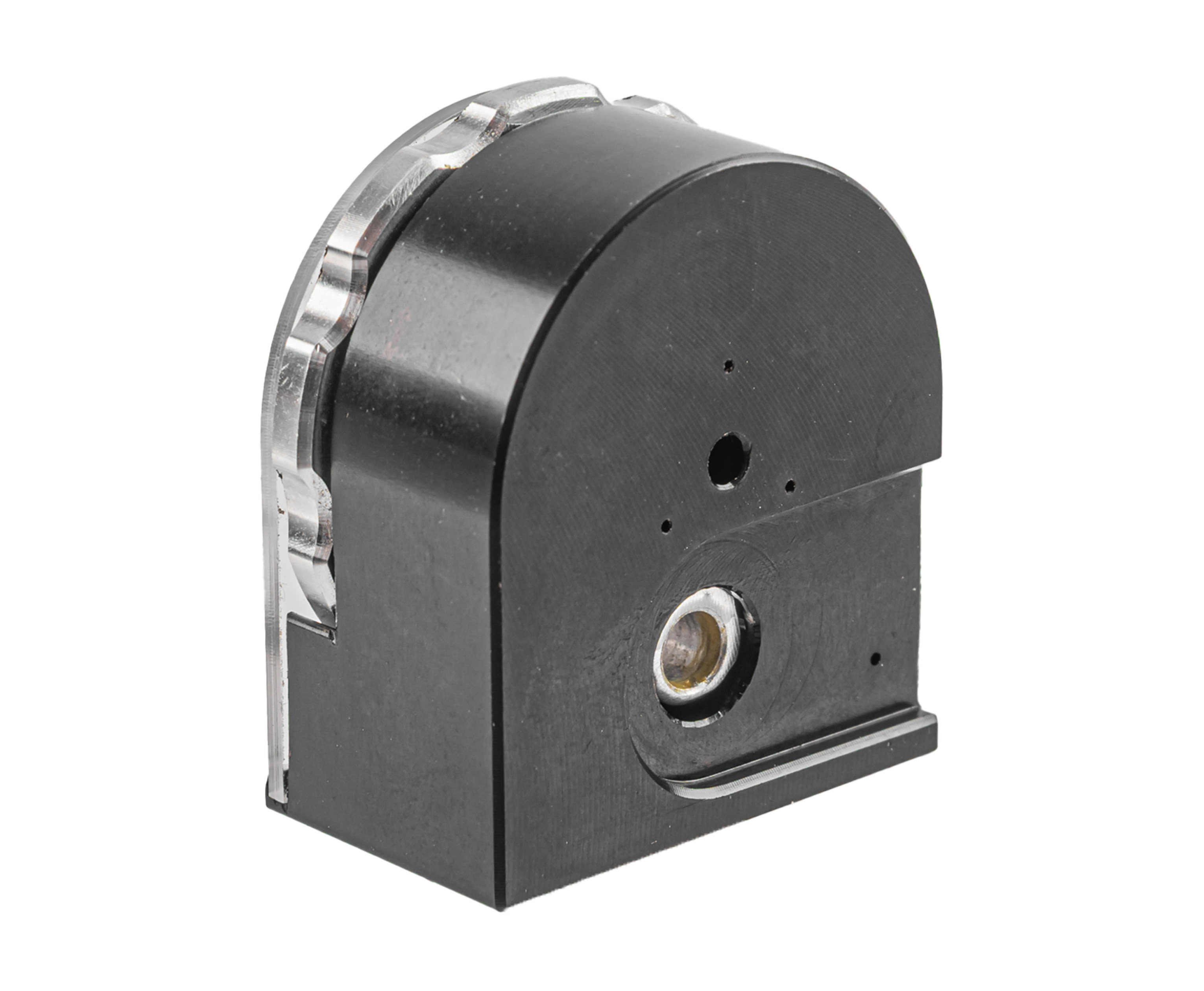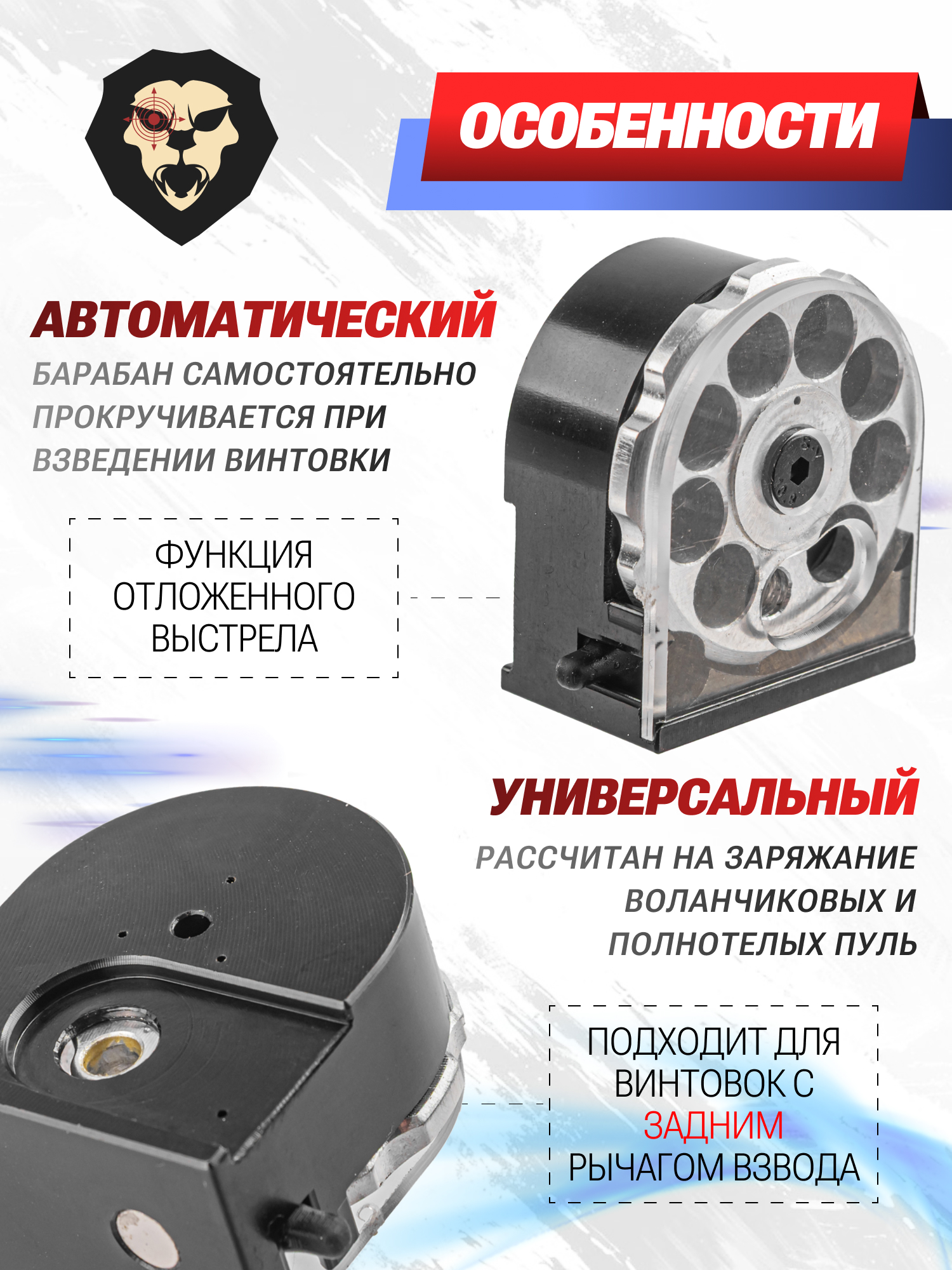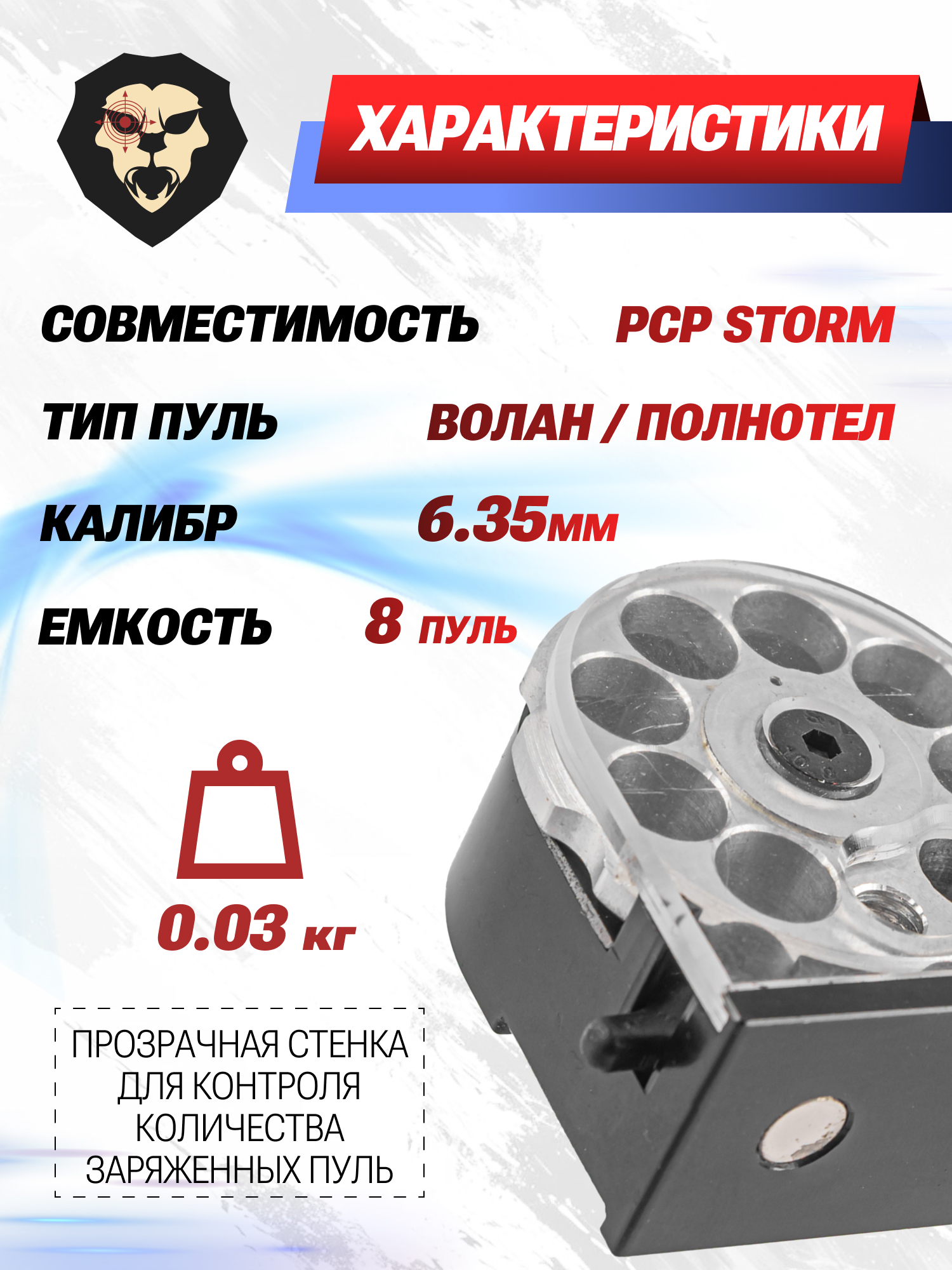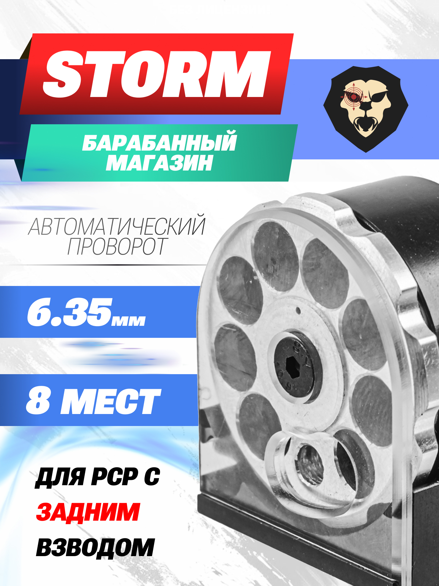 Представленный барабанный магазин совместим с винтовками Шторм в калибре 6.35 мм. В устройстве присутствует механизм, предполагающий автоматический проворот с функцией отложенного выстрела. Он собран с использованием деталей из прочного металла, что положительно отразилось на надежности.