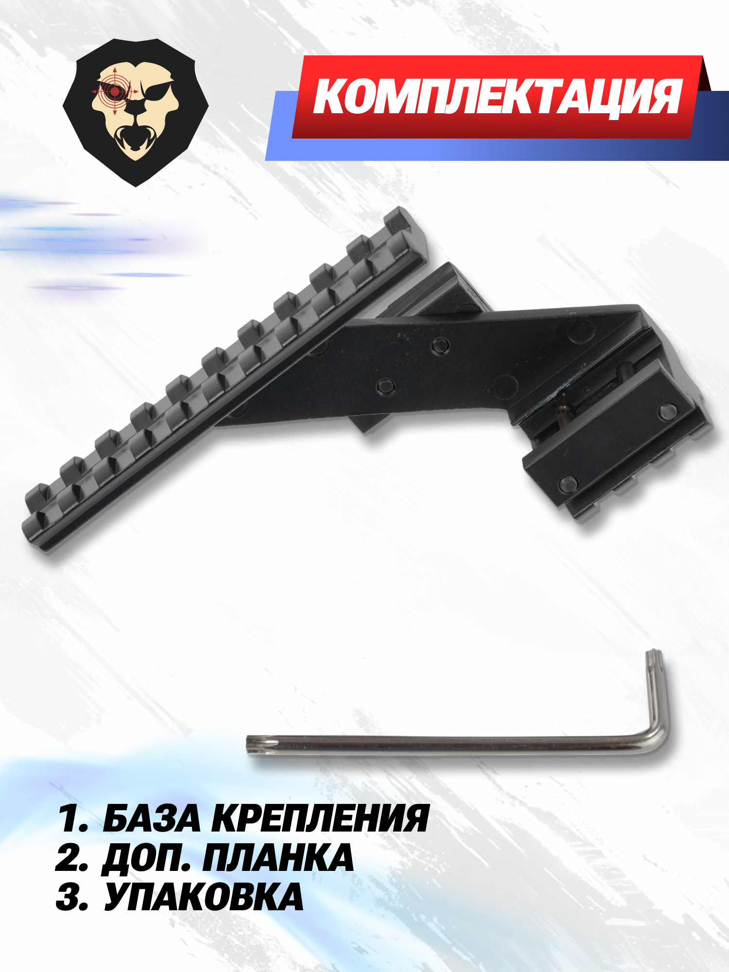 Рассматриваемое крепление для коллиматора Patriot фиксируется на штатной подствольной планке Пикатинни. Кроме рельсы над затвором предусмотрена также планка Вивер 22 мм под точкой крепления кронштейна, которая используется для установки тактических блоков, фонарей и лазерных целеуказателей. Кроме этого в комплекте подставки предусмотрена дополнительная съемная боковая планка, фиксирующаяся на двух винтах при помощи шестигранника.