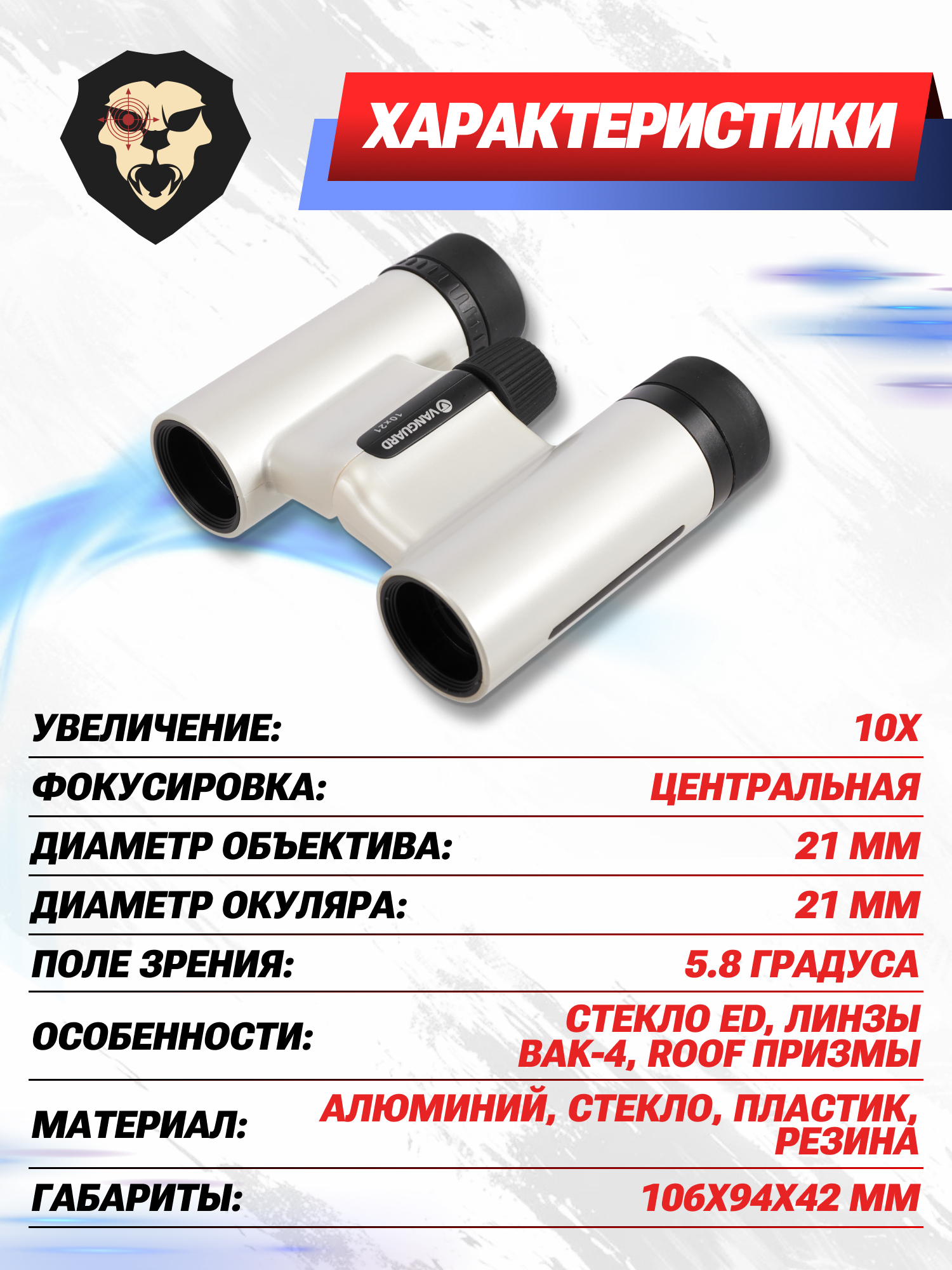 Информация о товаре "Бинокль Vanguard Vesta 10x21 WP (белый)" носит ознакомительный характер, и не является публичной офертой, определяемой положениями Статьи 437 Гражданского кодекса Российской Федерации, характеристики, внешний вид, цвет и комплектация могут быть изменены производителем без уведомления.
