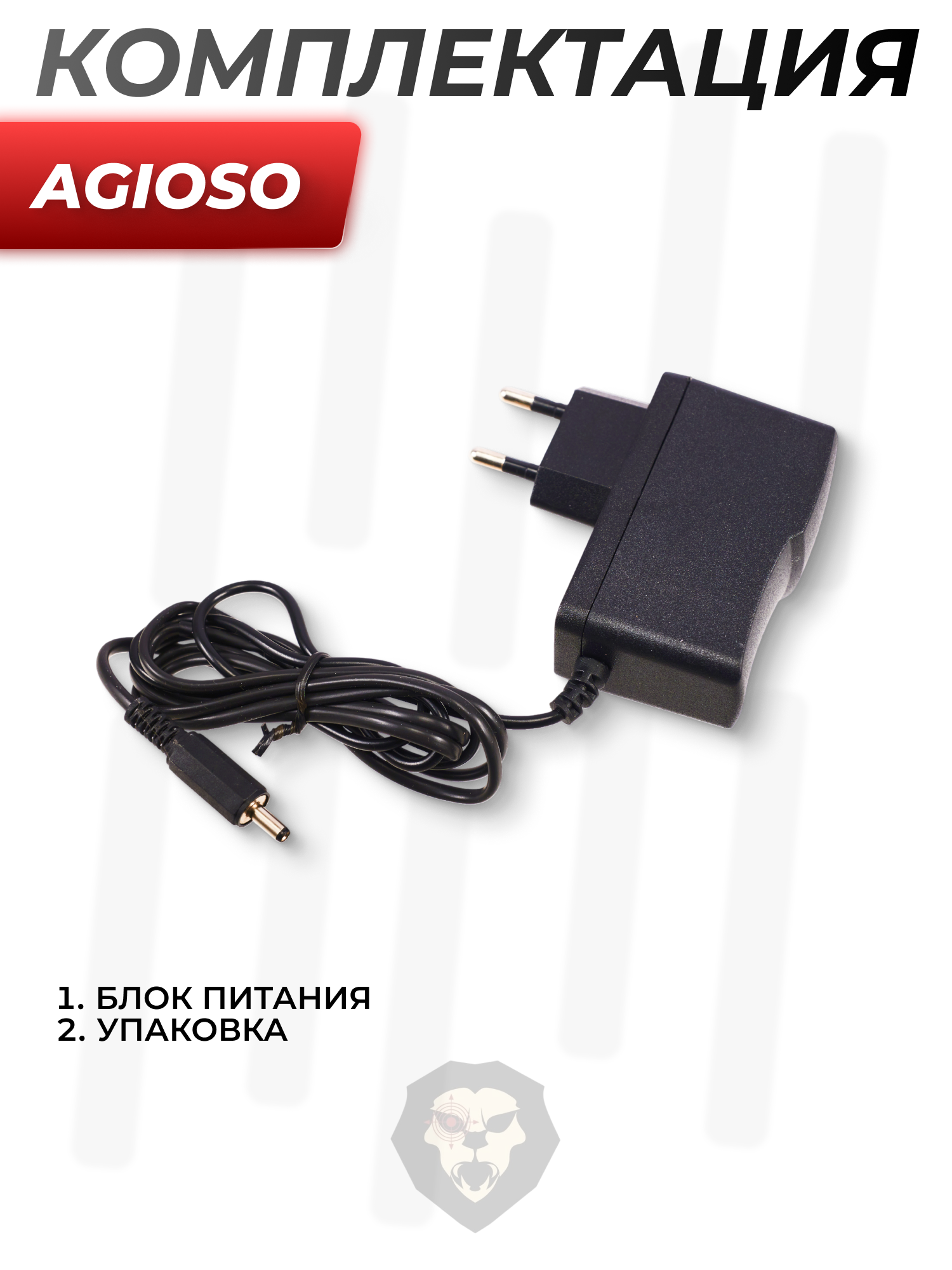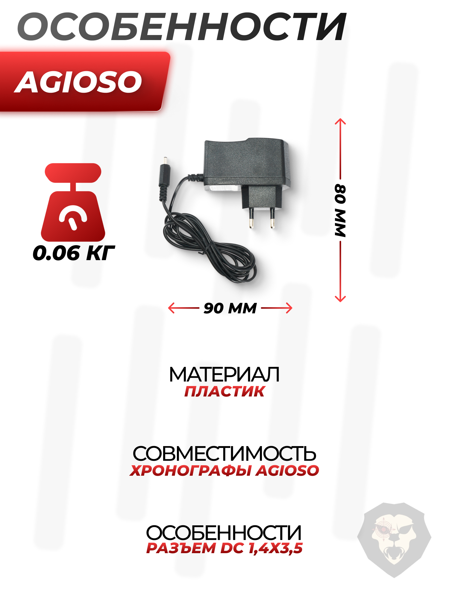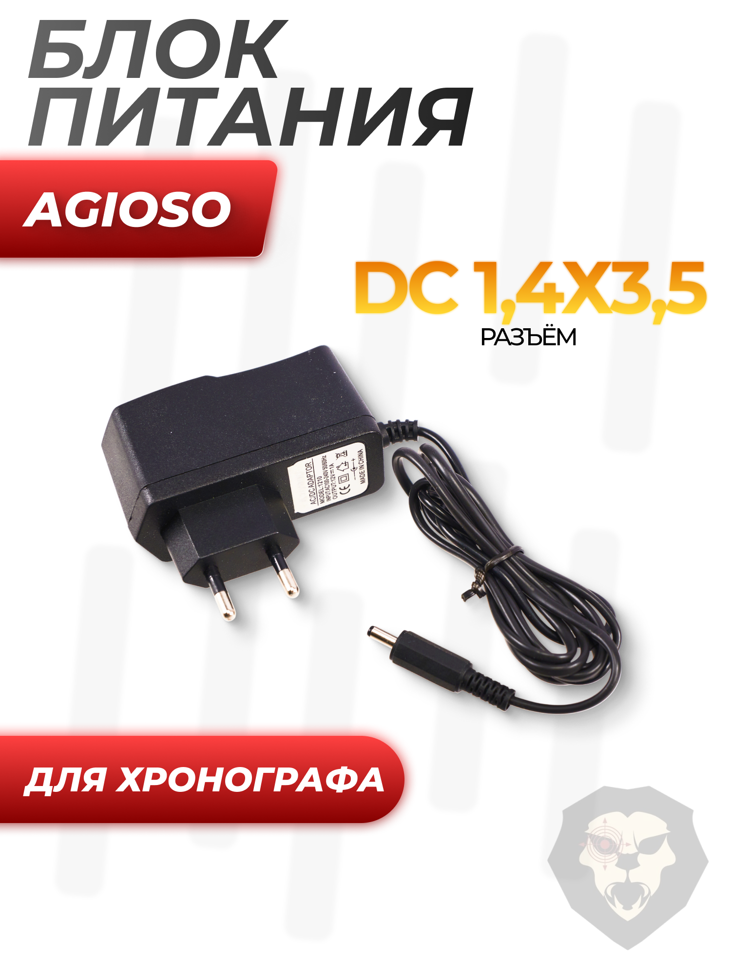 Блок питания Агиосо подключает хронографы к сети, что позволяет использовать их не затрачивая заряд батареек. Тип разъема штекера блока питания ДЦ 1, 4 на 3, 5. Двенадцативольтный блок питания подключается к сети с напряжением от 100 до 240 Вольт.