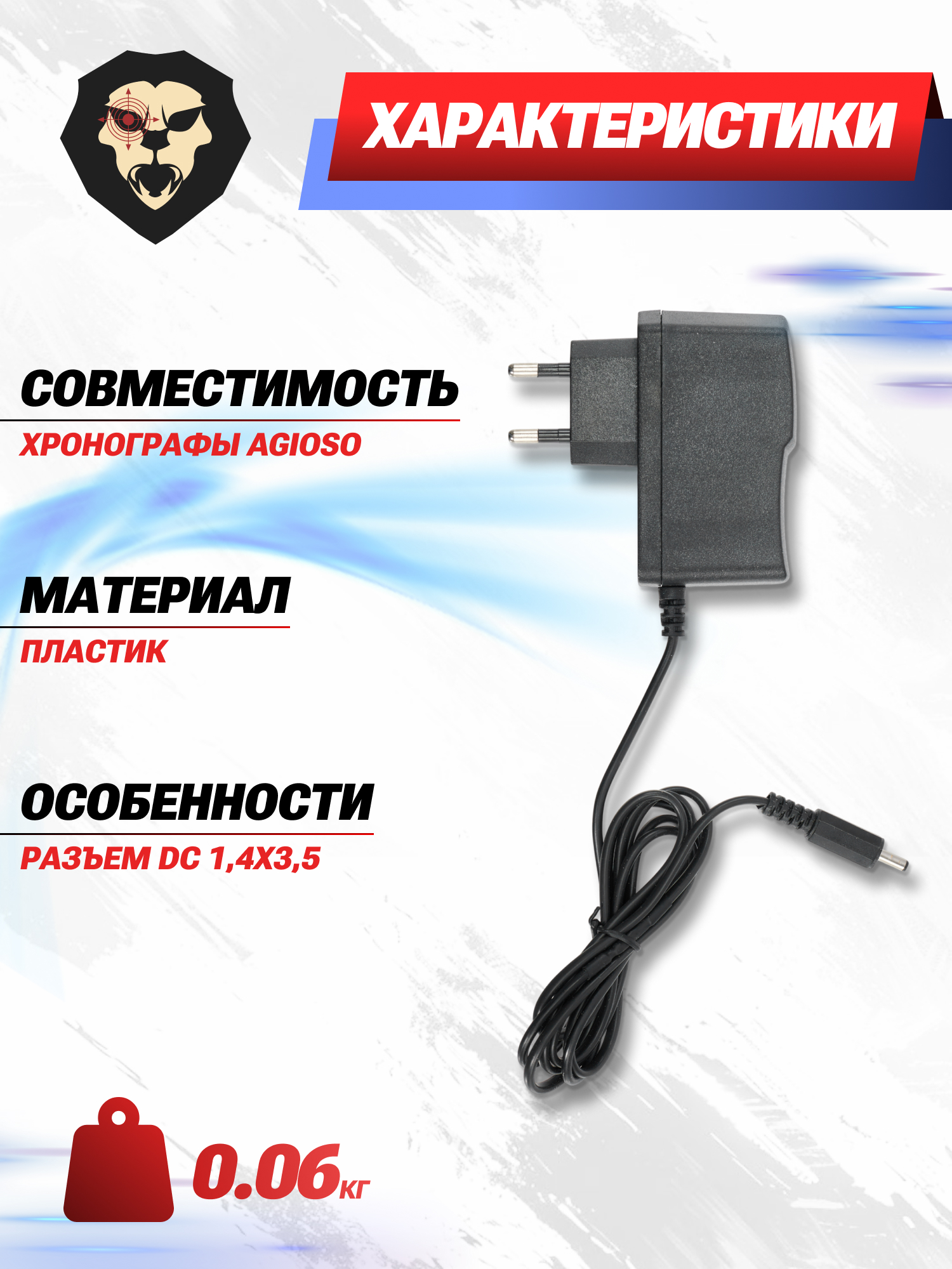 Блок питания Агиосо подключает хронографы к сети, что позволяет использовать их не затрачивая заряд батареек. Тип разъема штекера блока питания ДЦ 1, 4 на 3, 5. Двенадцативольтный блок питания подключается к сети с напряжением от 100 до 240 Вольт.