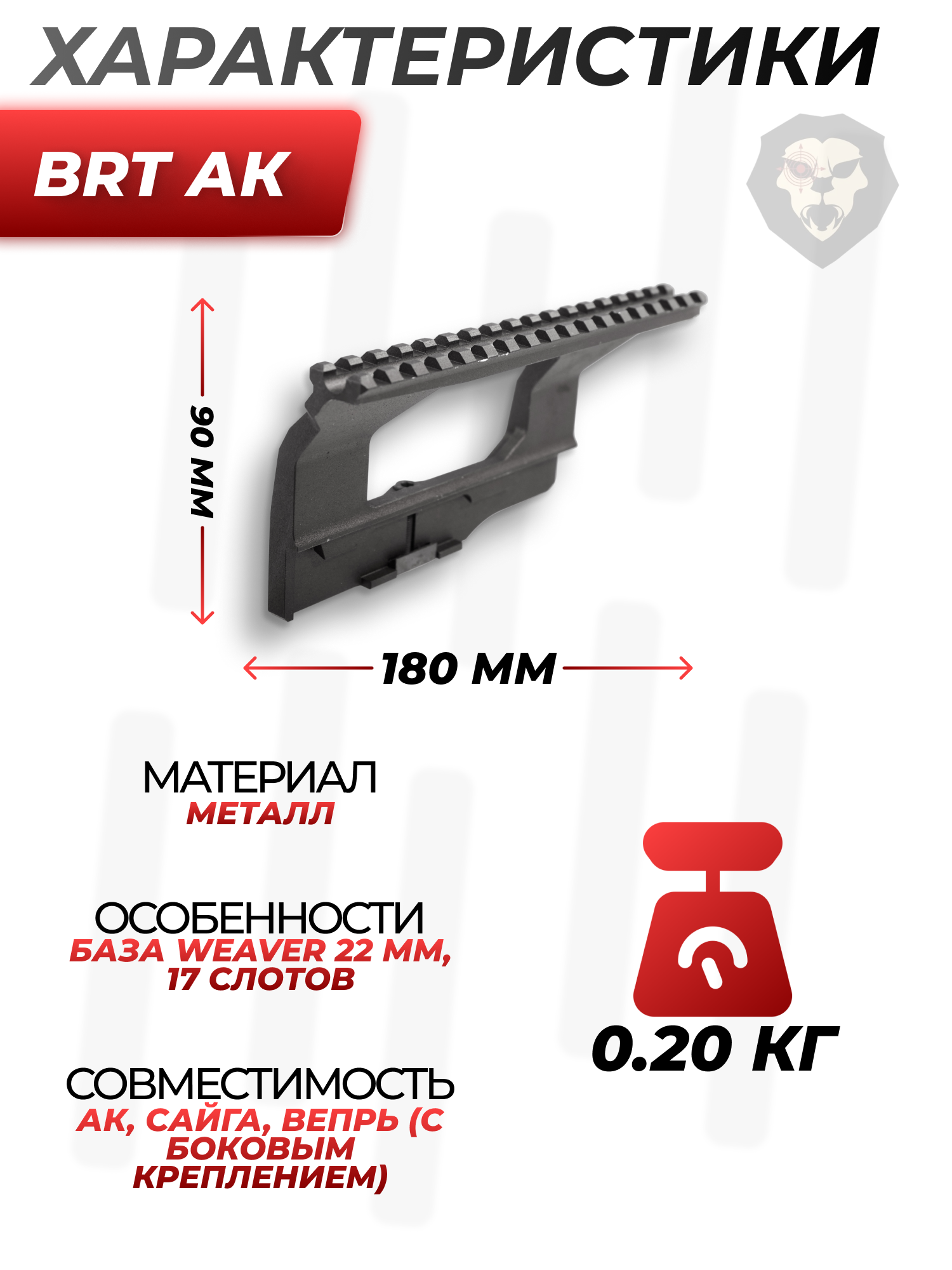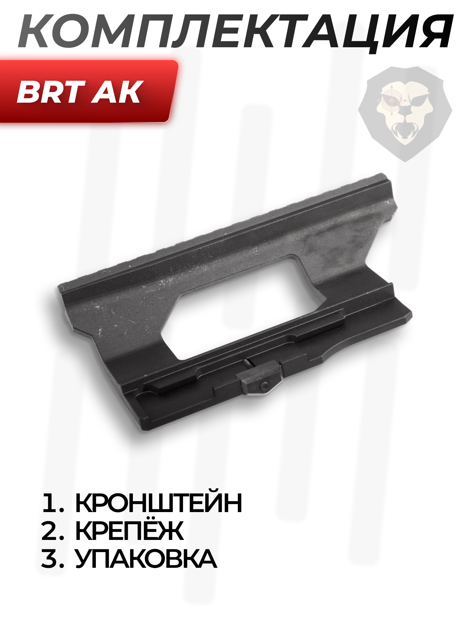 Кронштейн BRT представленного образца - универсальное решение для установки современных прицелов на отечественные автоматы серии АК, а также гражданские карабины Сайга и Вепрь с боковым креплением «Ласточкин хвост». Изделие надвигается на направляющую и жестко фиксируется в пазах посредством винта, исключая вероятность смещения конструкции даже при сильной отдаче выстрела.
