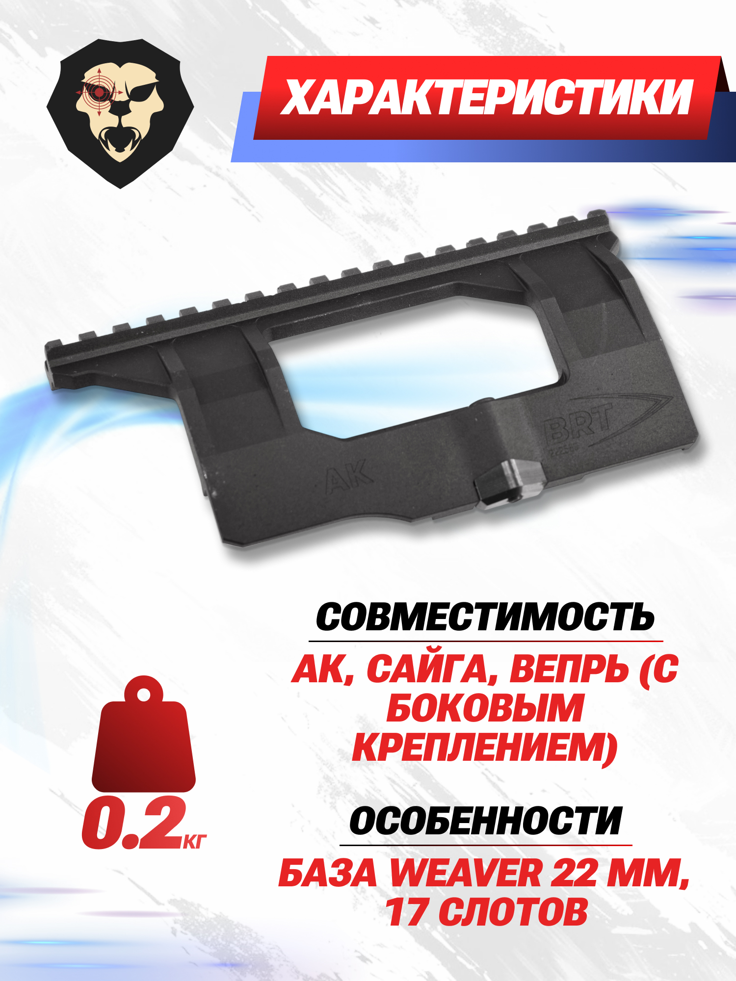 Кронштейн BRT представленного образца - универсальное решение для установки современных прицелов на отечественные автоматы серии АК, а также гражданские карабины Сайга и Вепрь с боковым креплением «Ласточкин хвост». Изделие надвигается на направляющую и жестко фиксируется в пазах посредством винта, исключая вероятность смещения конструкции даже при сильной отдаче выстрела.