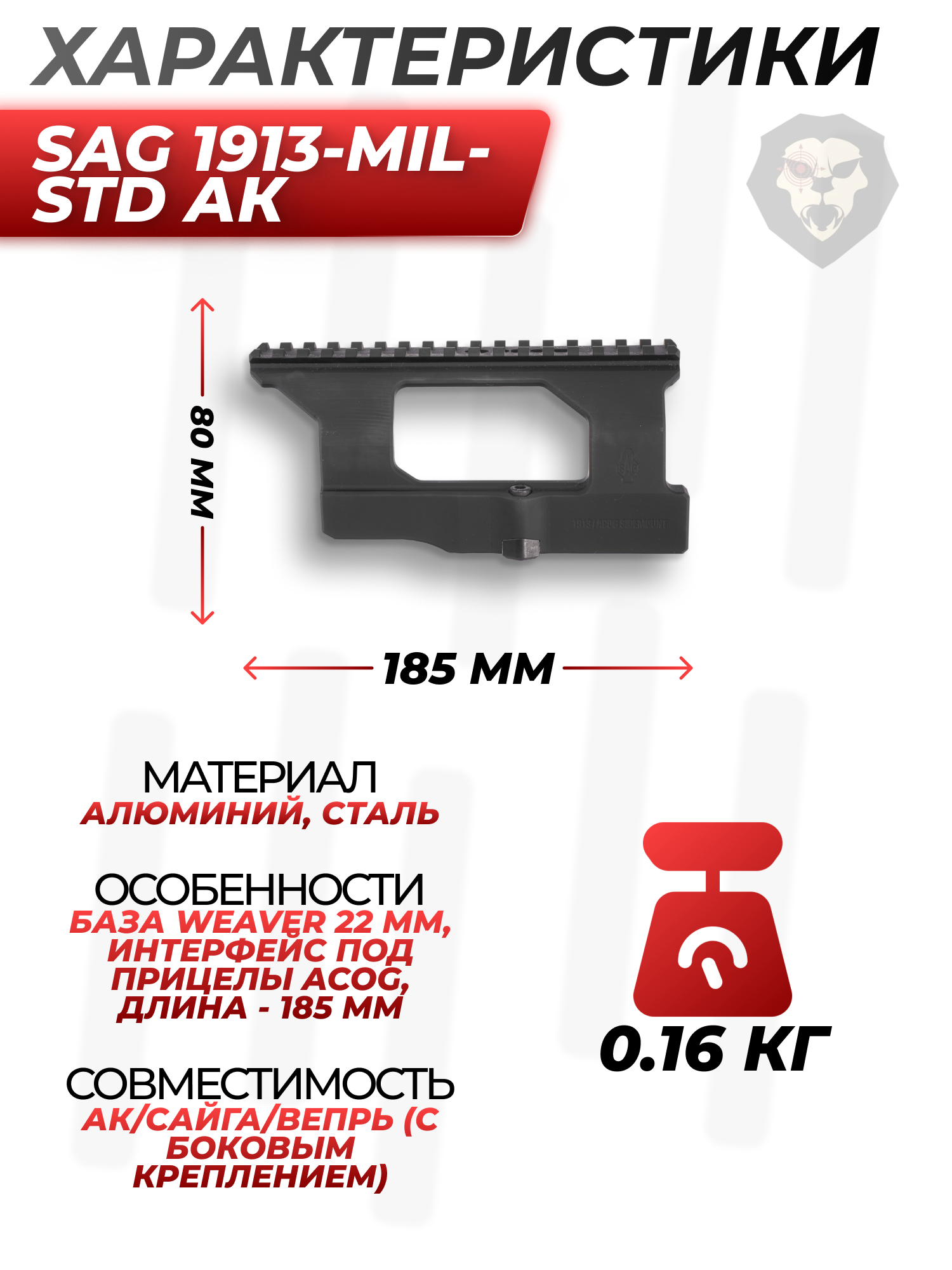 Артикул производителя S-20016 Боковой кронштейн SAG 1913-MIL-STD для АК (ACOG, Weaver, S-20016) по низкой цене 10290 руб. Модель со штрихкодом производителя Вы можете оплатить наложенным платежем с доставкой или в отделении транспортной компании (ПЭК, СДЭК, Boxberry). Ваш заказ со штрихкодом 2000000133638 забрать на почте с оплатой при получении в любой части Российской Федерации.