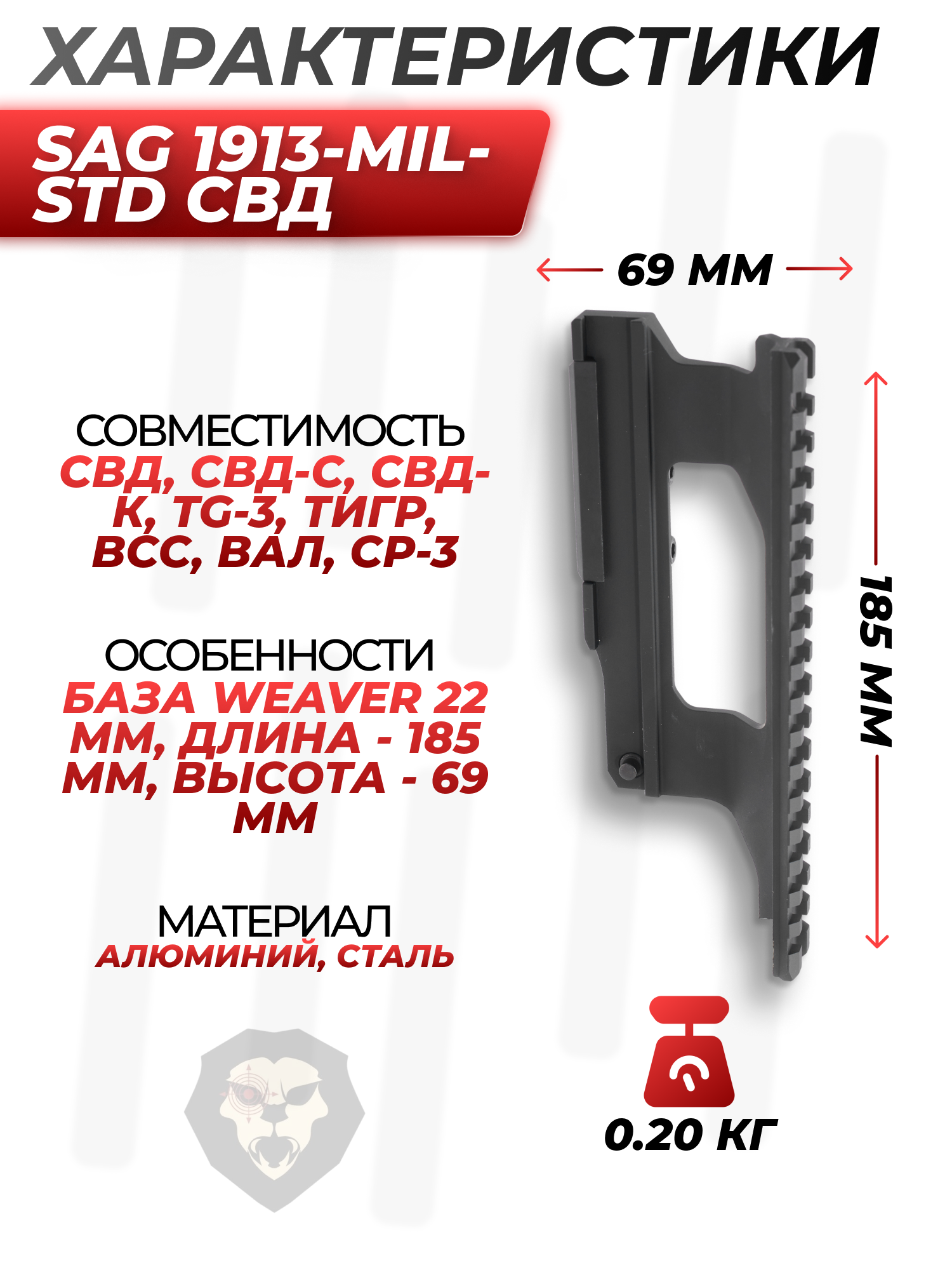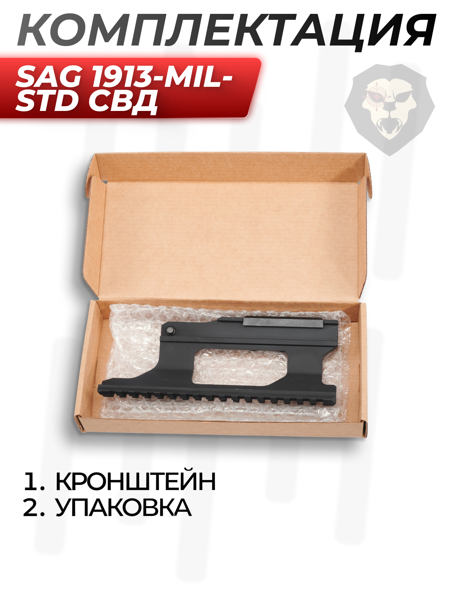 SAG кронштейн СВД изготавливается из алюминия с обработкой поверхности специальным противокоррозионным составом. Адаптер выделяется увеличенной прочностью, при этом его масса не превышает 194 грамма. В комплекте с изделием идет необходимый крепеж - фиксация в пазах направляющей происходит посредством пластины, поджимаемой тремя винтами с боковым стопором.